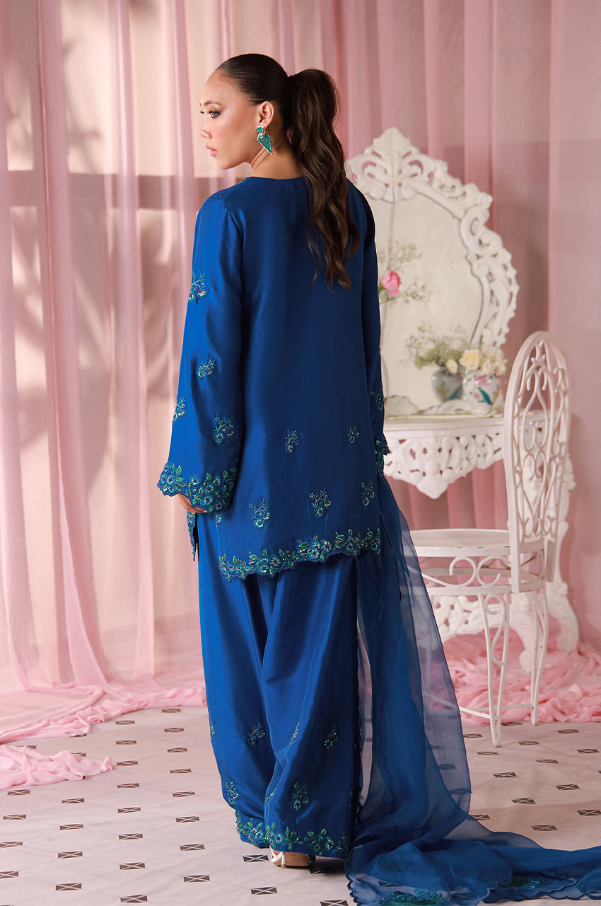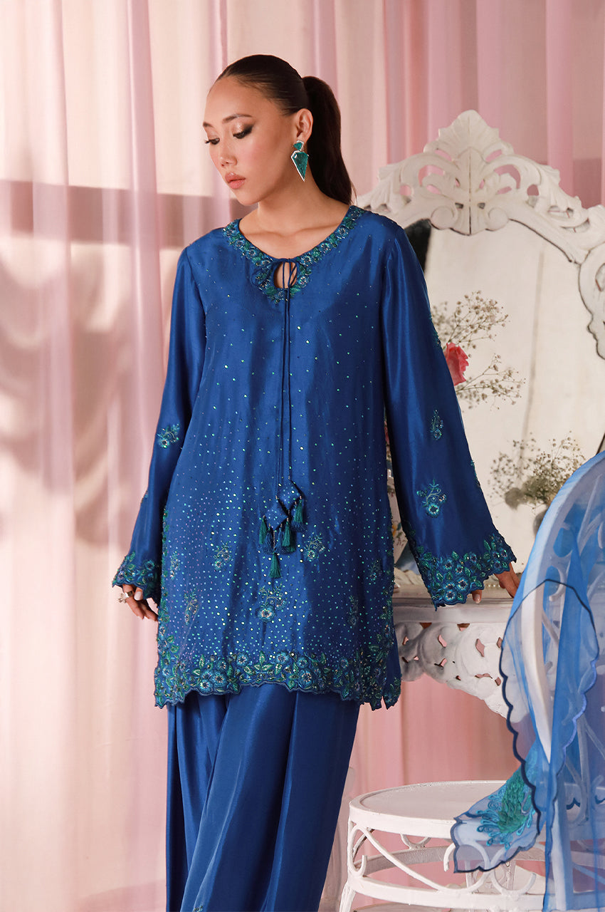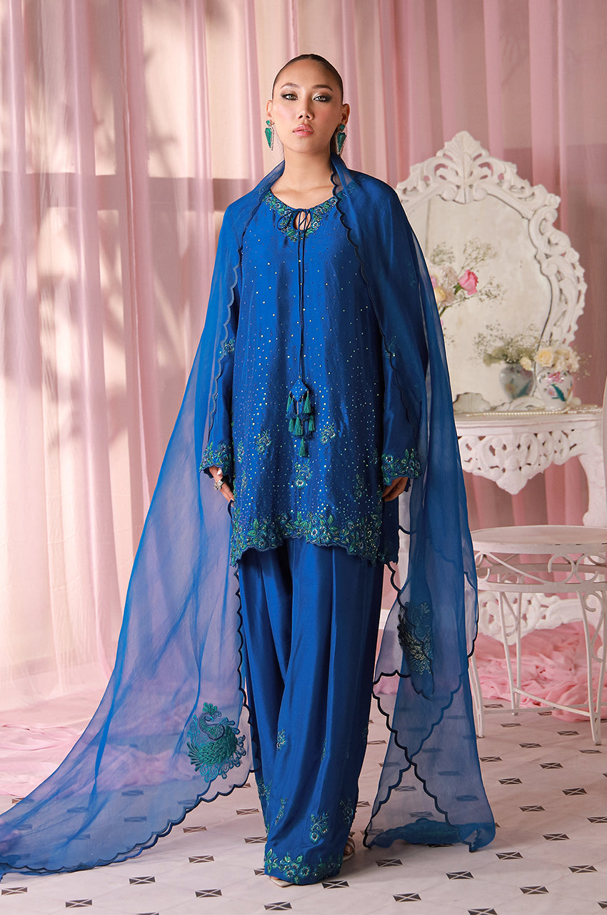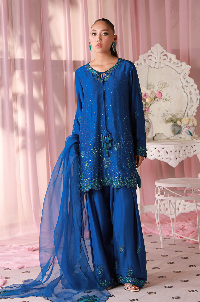 Crafted from pure raw silk in a regal royal blue hue, Nayel embodies poised confidence and modern sophistication. Intricate embellishments and a fluid organza dupatta add depth and grace, reflecting timeless elegance through a contemporary lens.