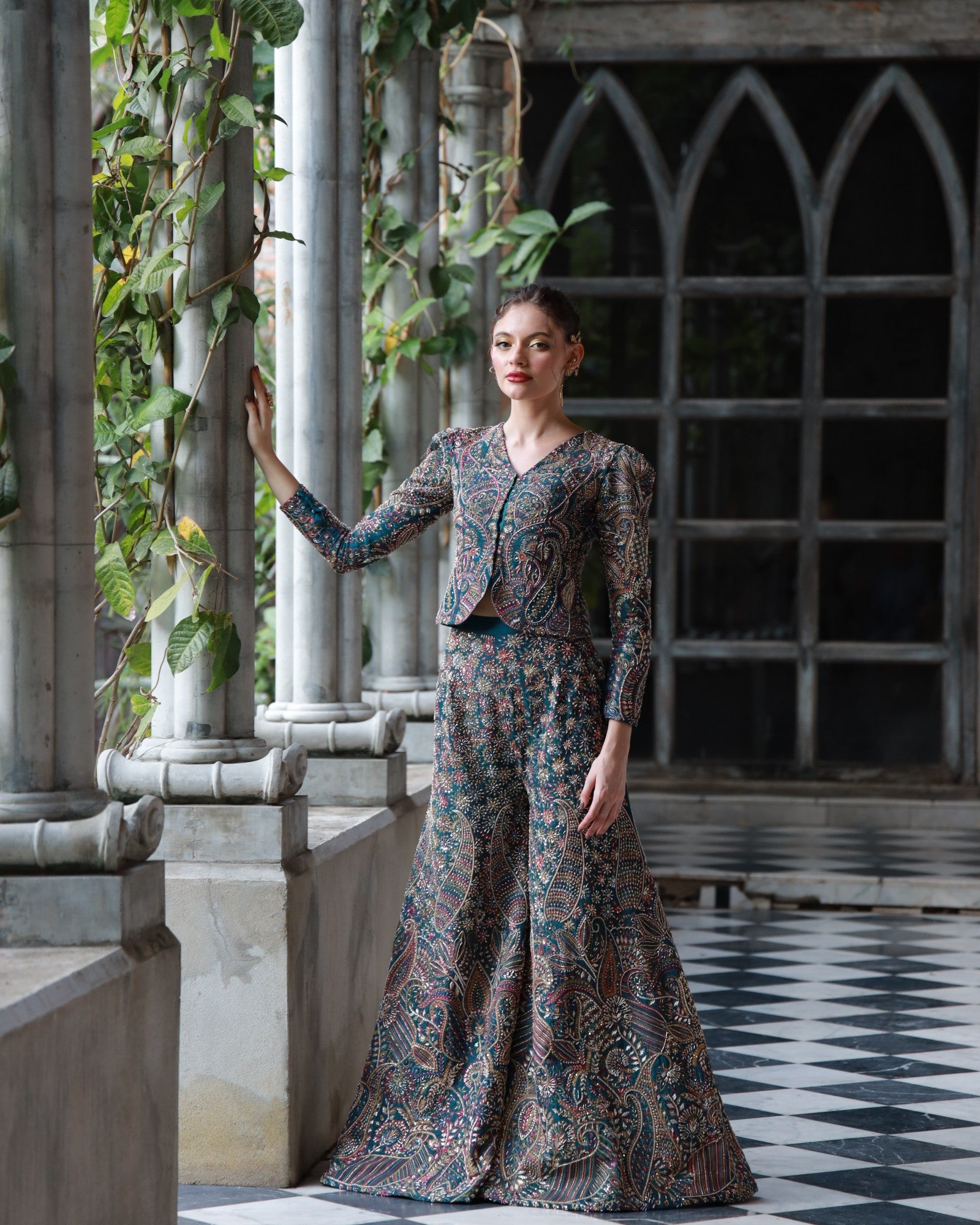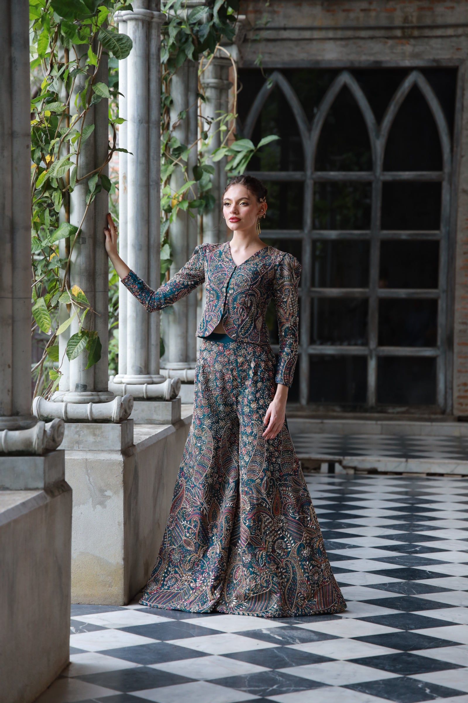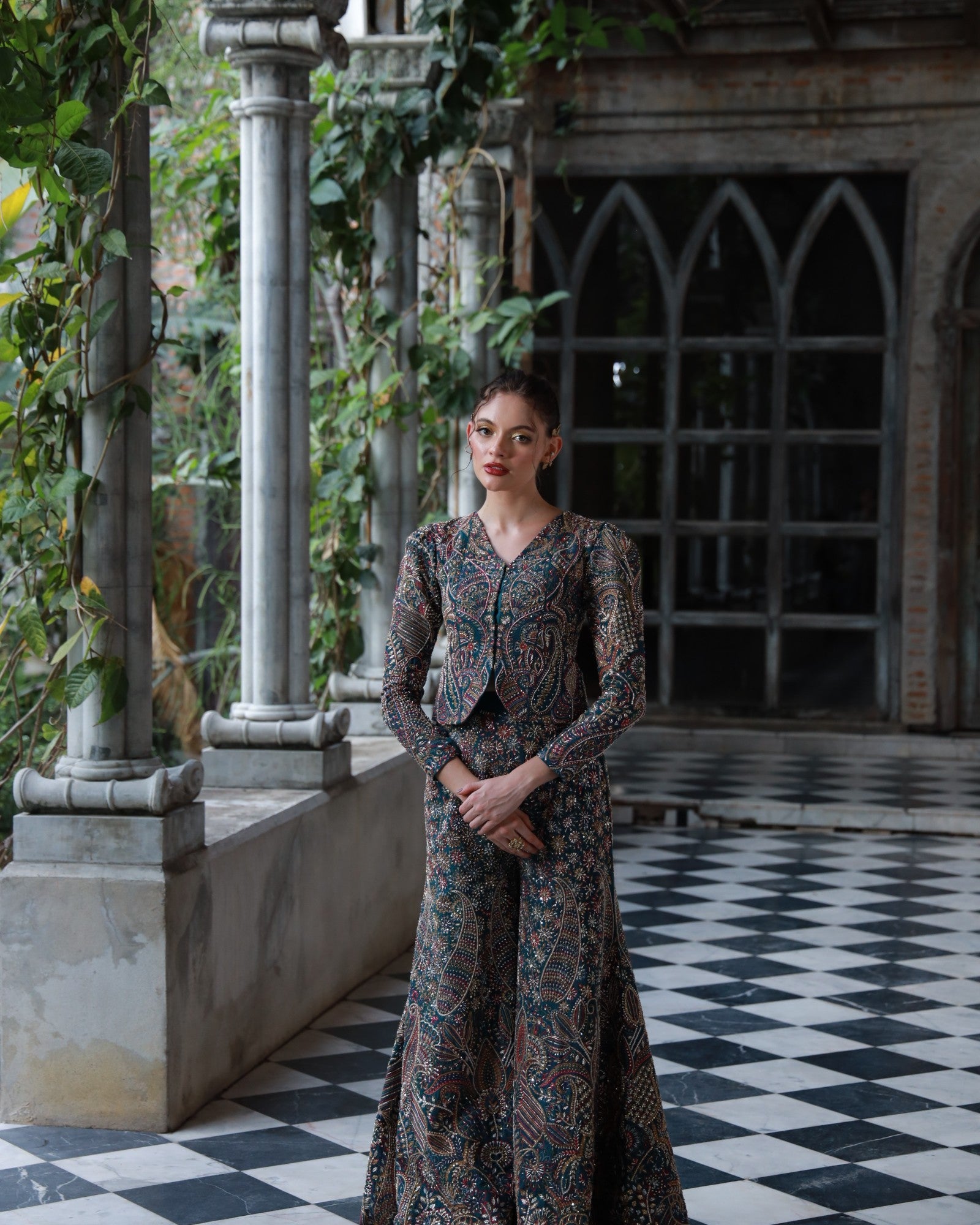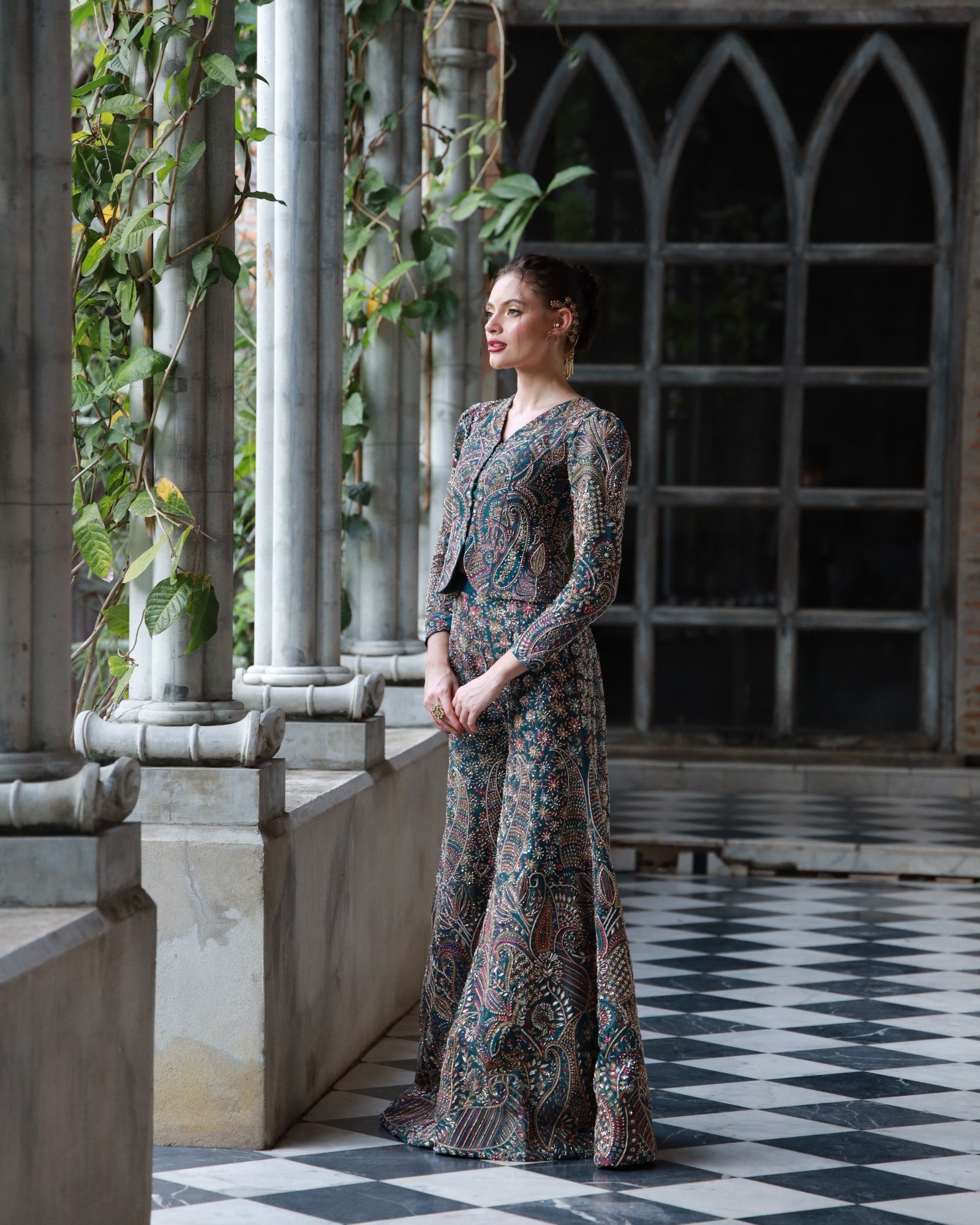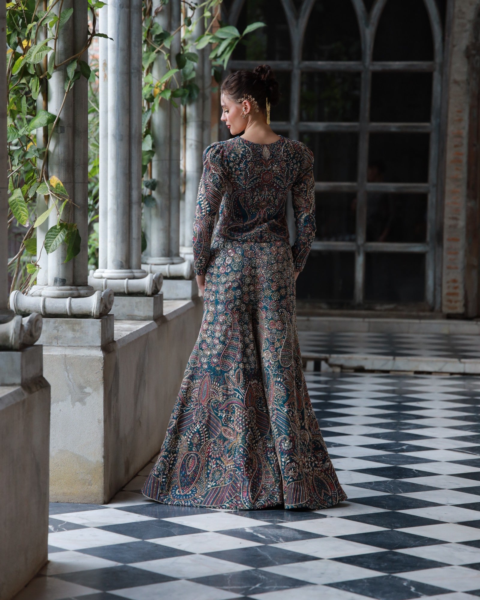 In a rich dark teal raw silk, this koti with sharara pants is adorned with handcrafted multi Aari and zardozi work. A timeless bridal statement where tradition meets elegance, crafted for the bride who cherishes heritage in every detail.