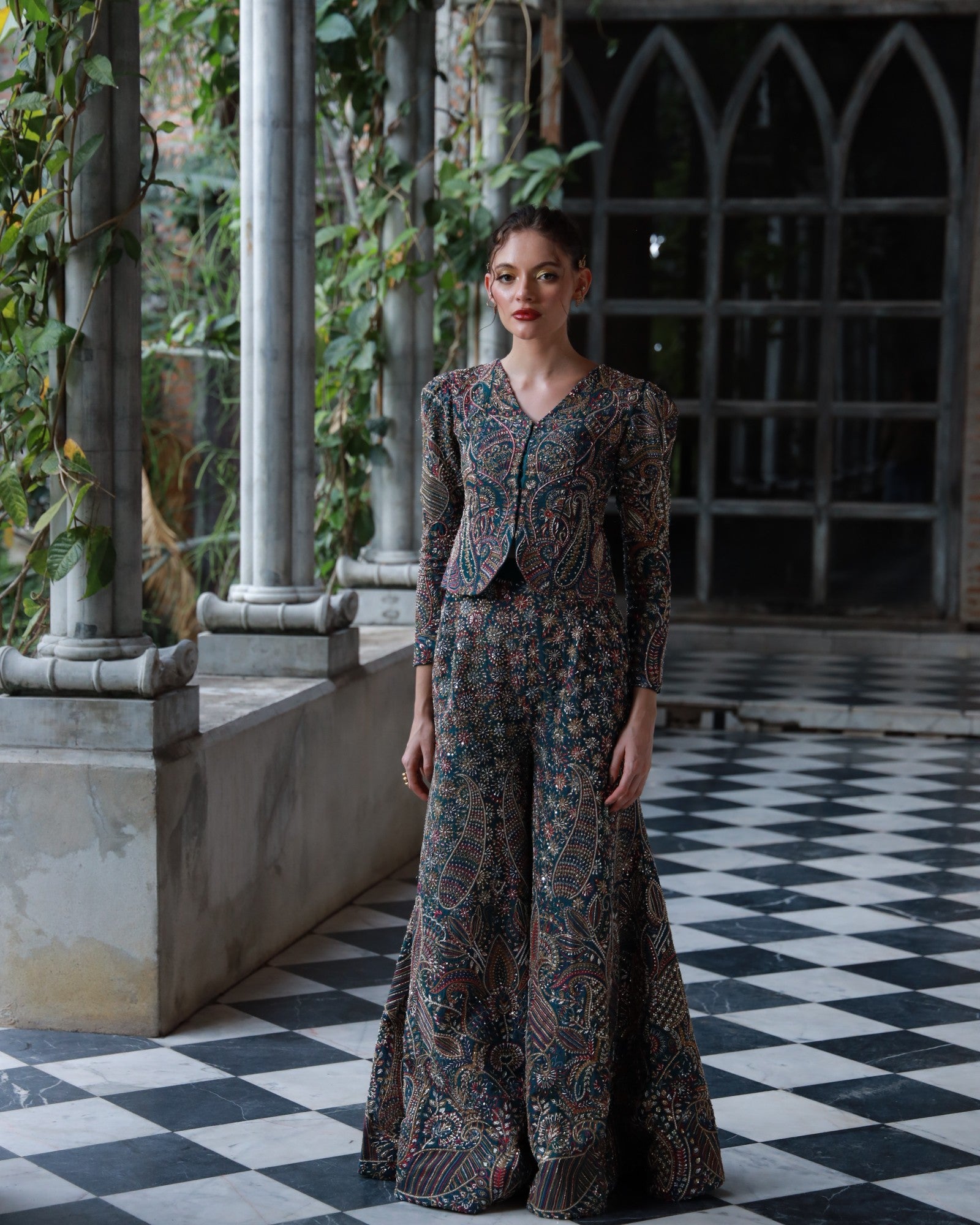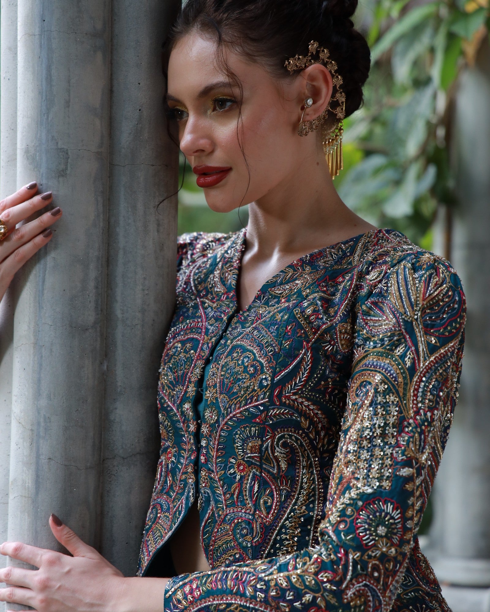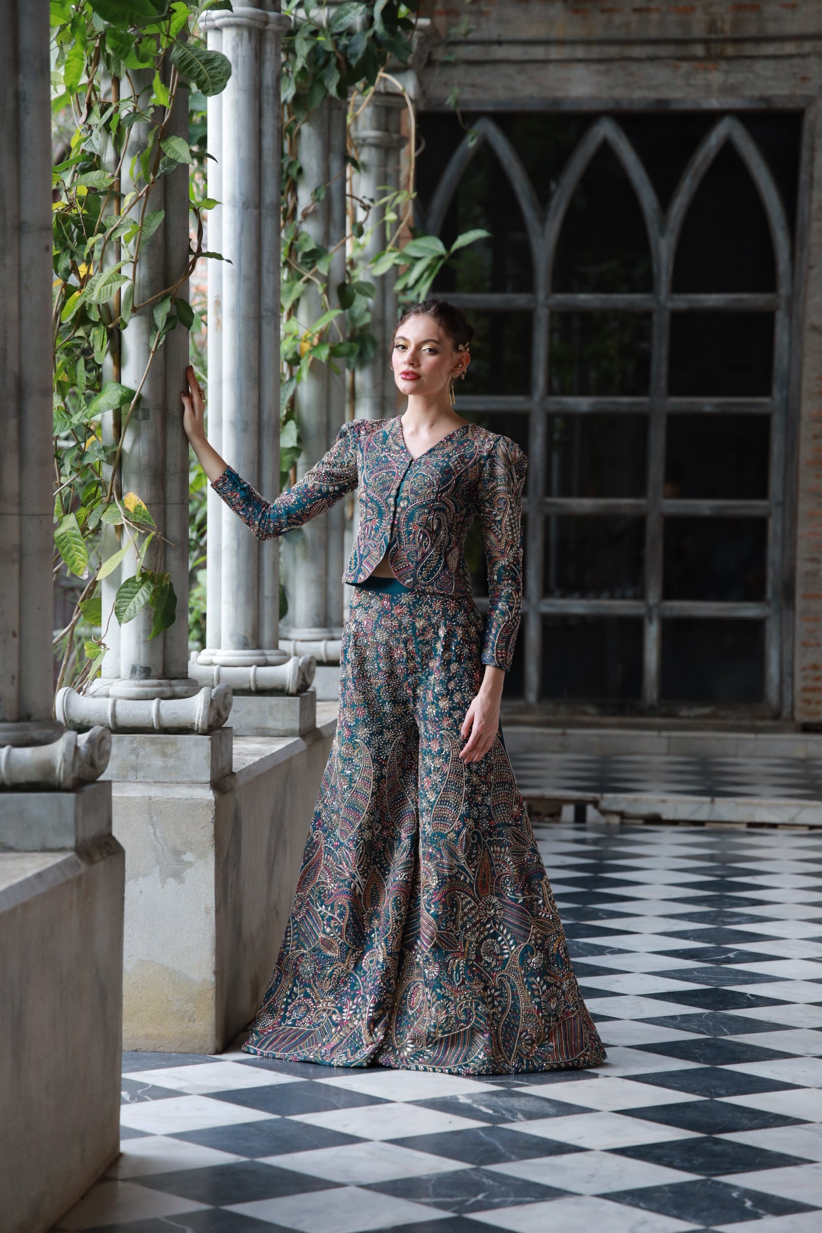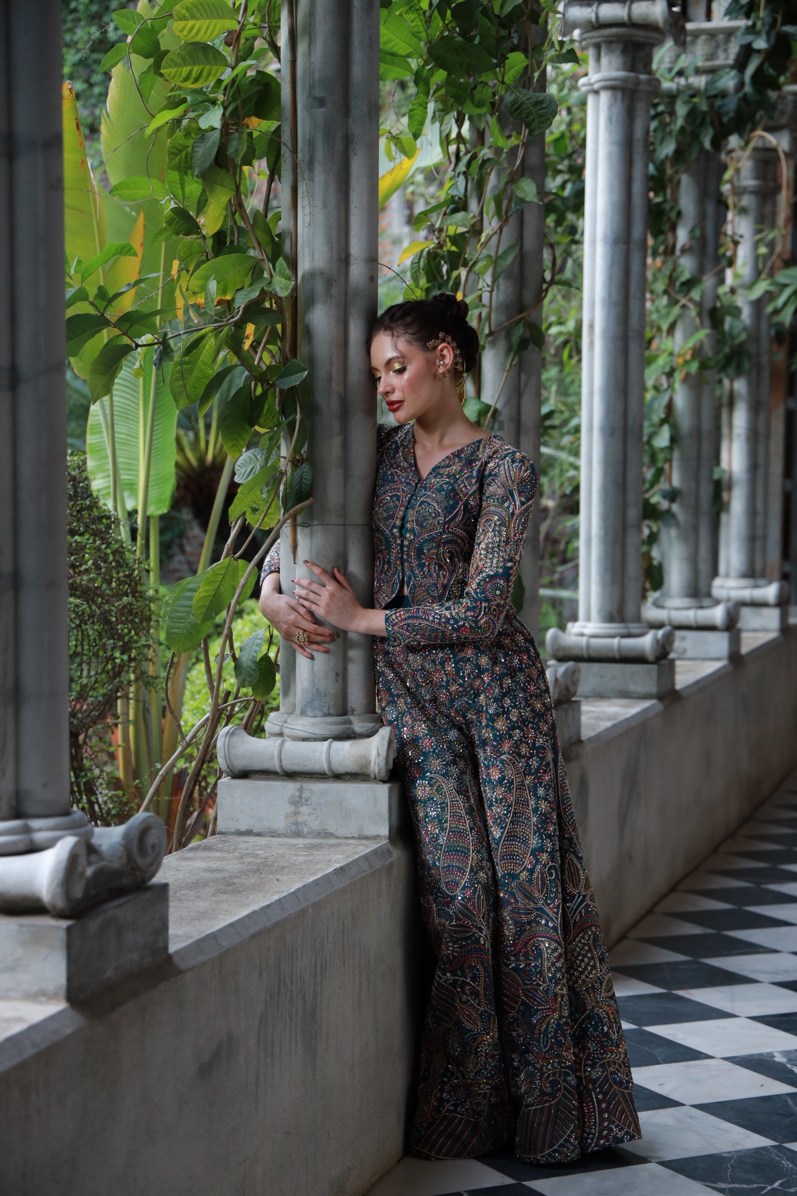In a rich dark teal raw silk, this koti with sharara pants is adorned with handcrafted multi Aari and zardozi work. A timeless bridal statement where tradition meets elegance, crafted for the bride who cherishes heritage in every detail.