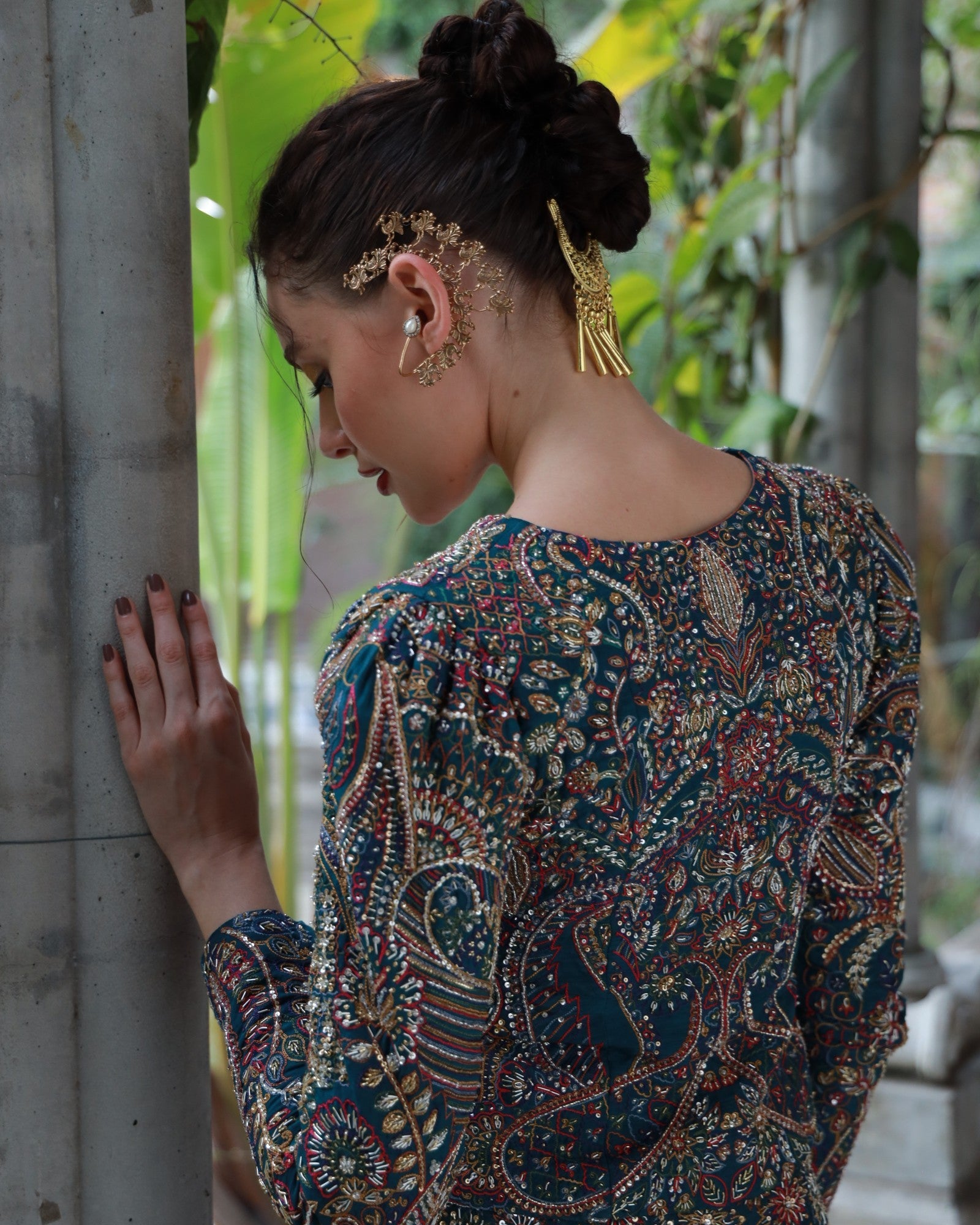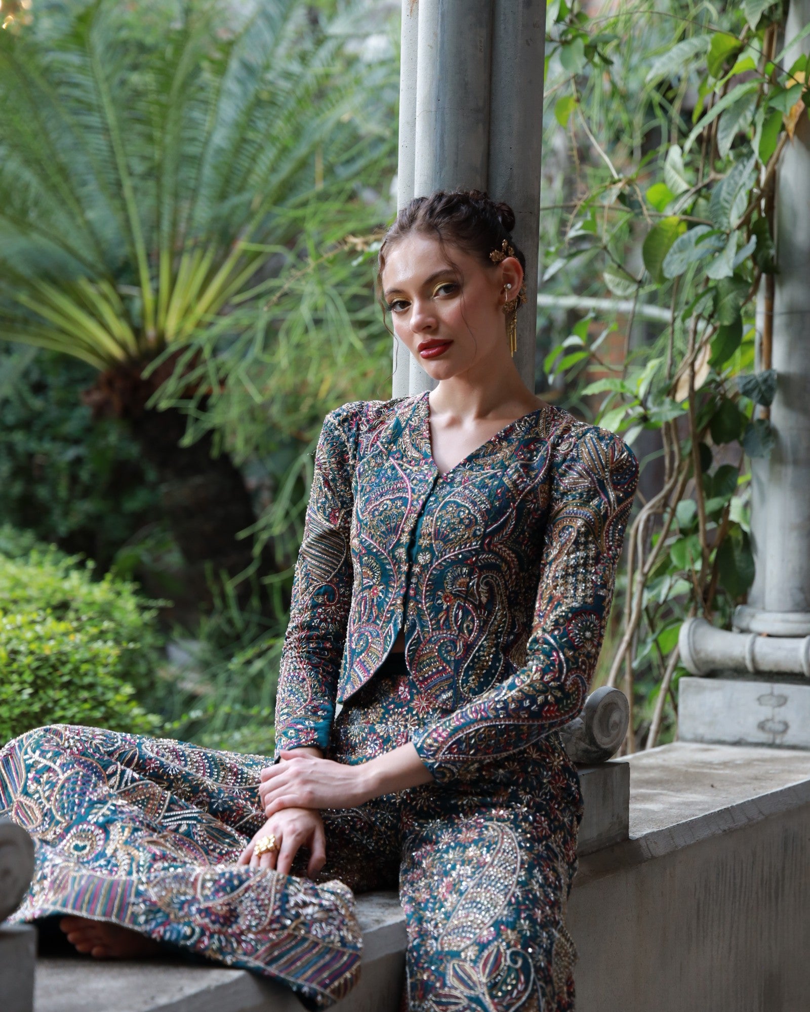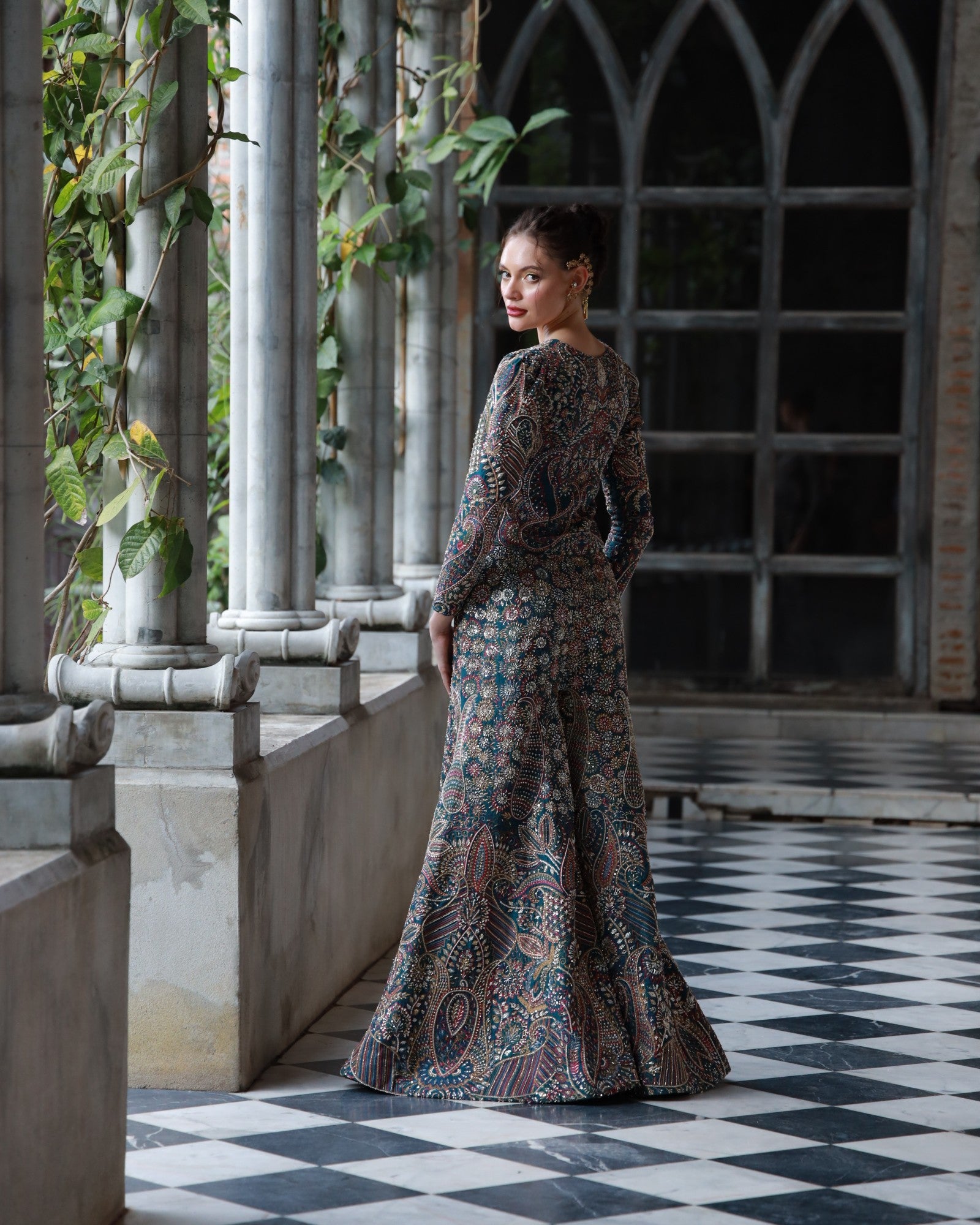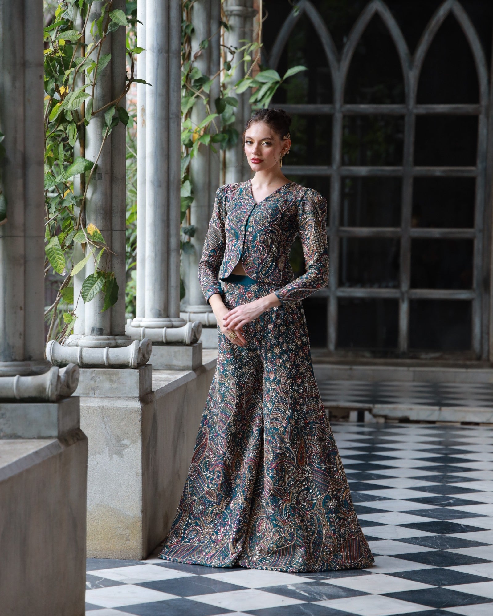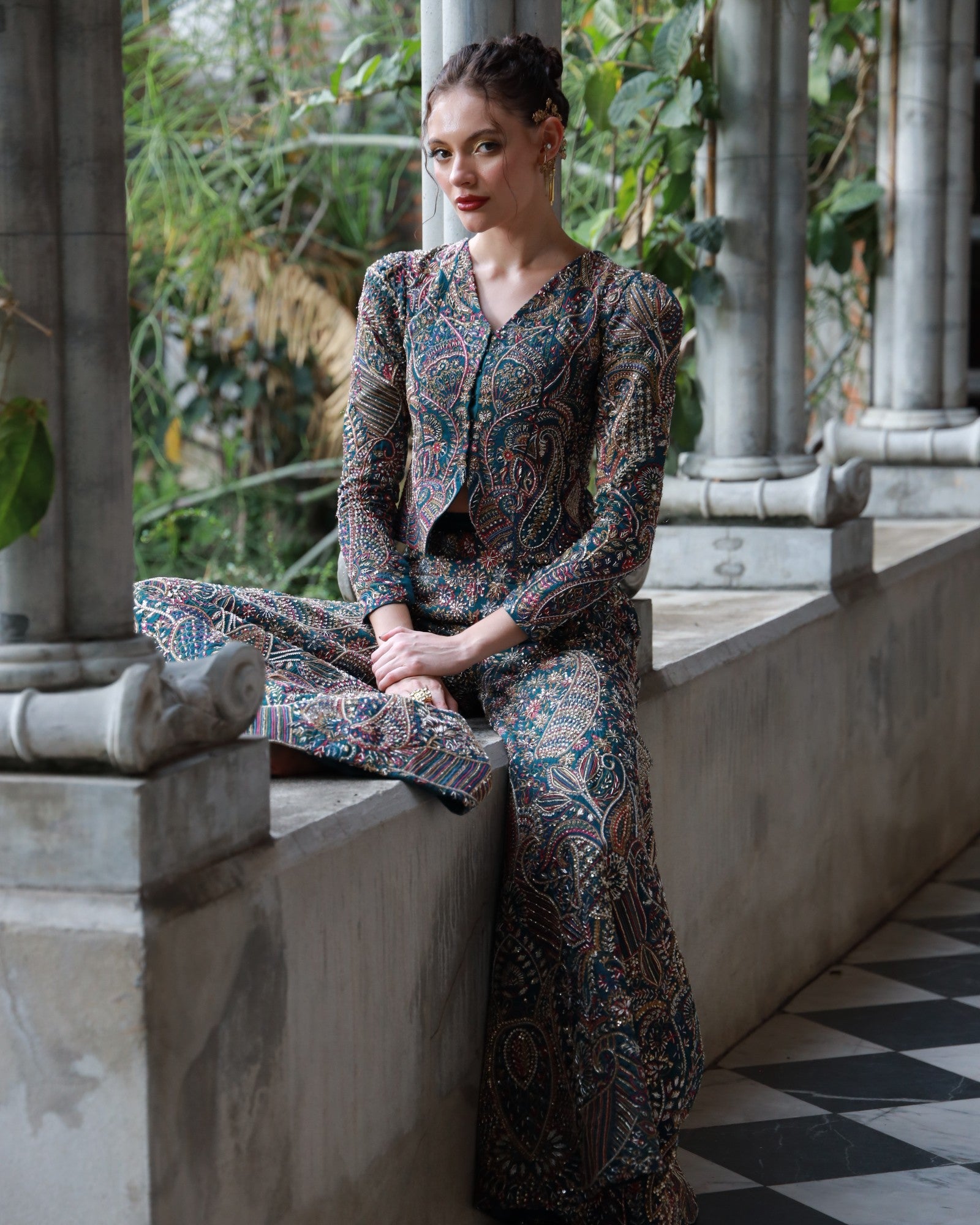 In a rich dark teal raw silk, this koti with sharara pants is adorned with handcrafted multi Aari and zardozi work. A timeless bridal statement where tradition meets elegance, crafted for the bride who cherishes heritage in every detail.