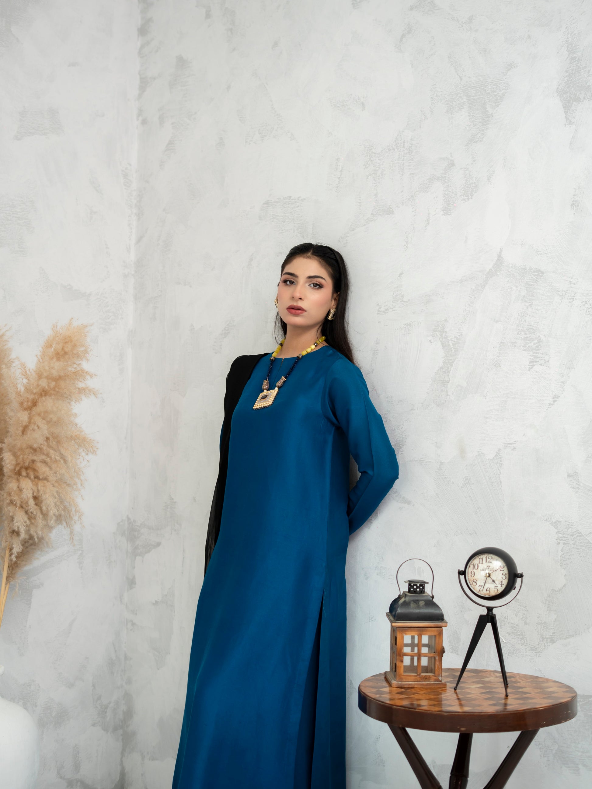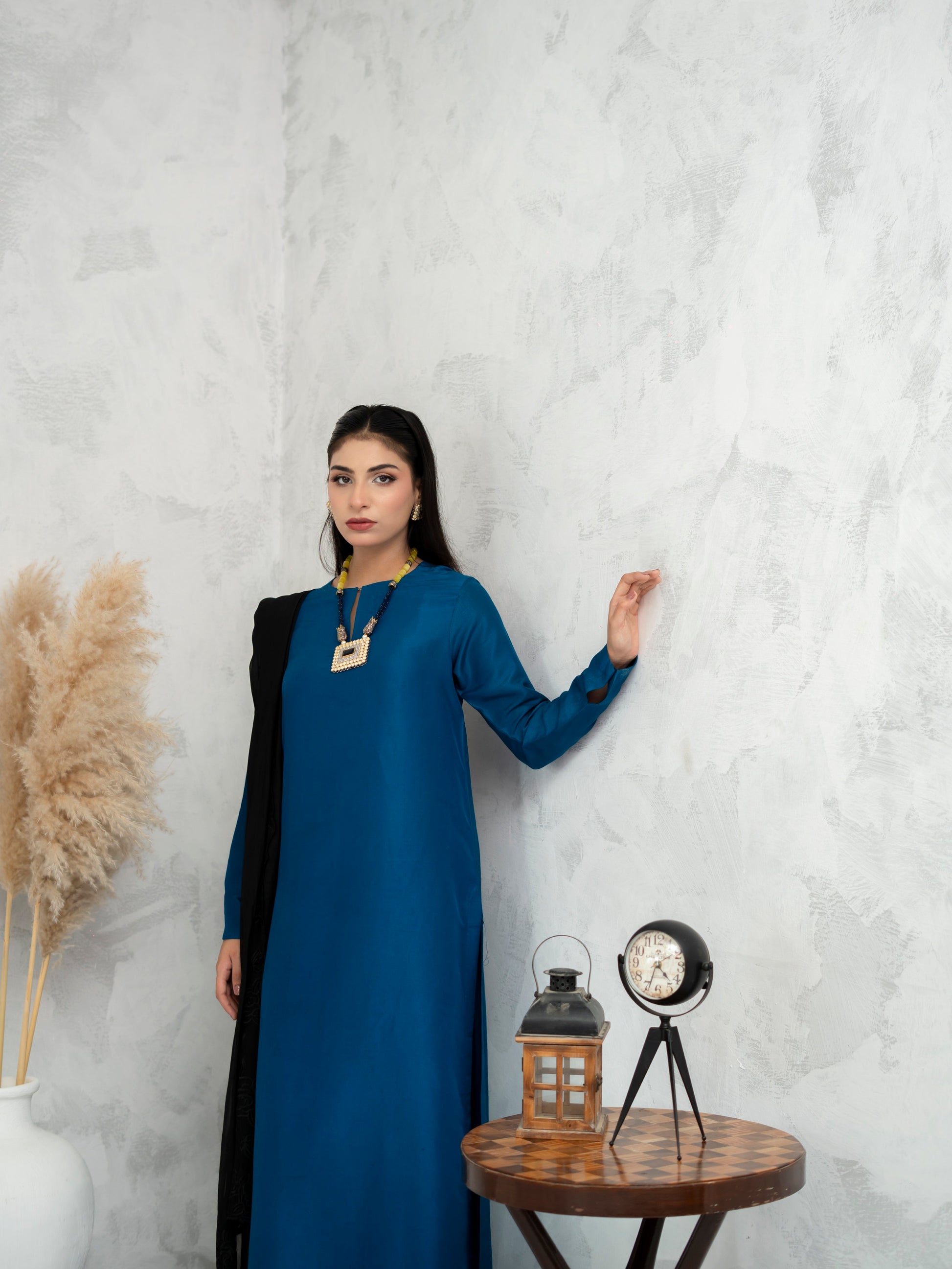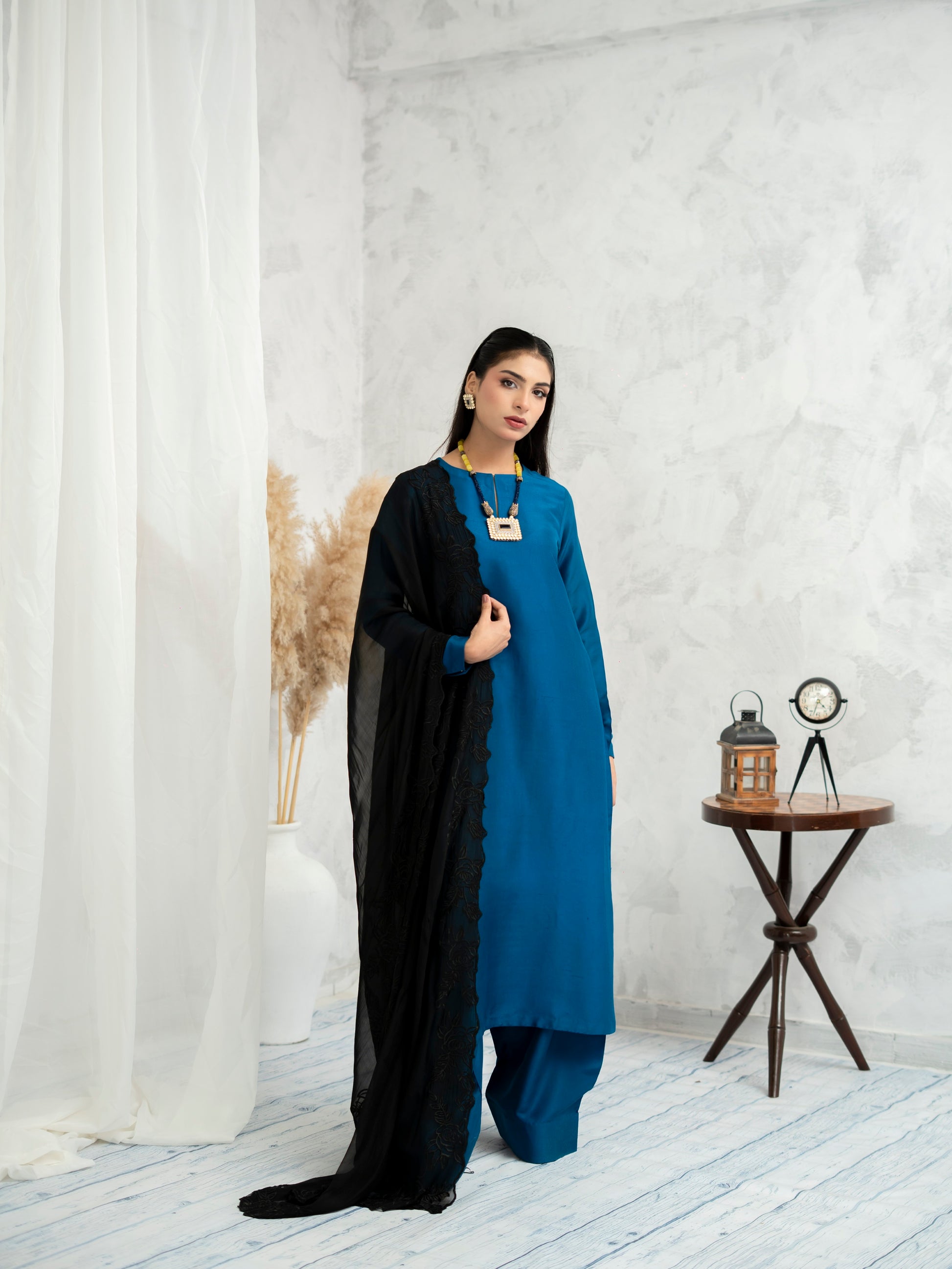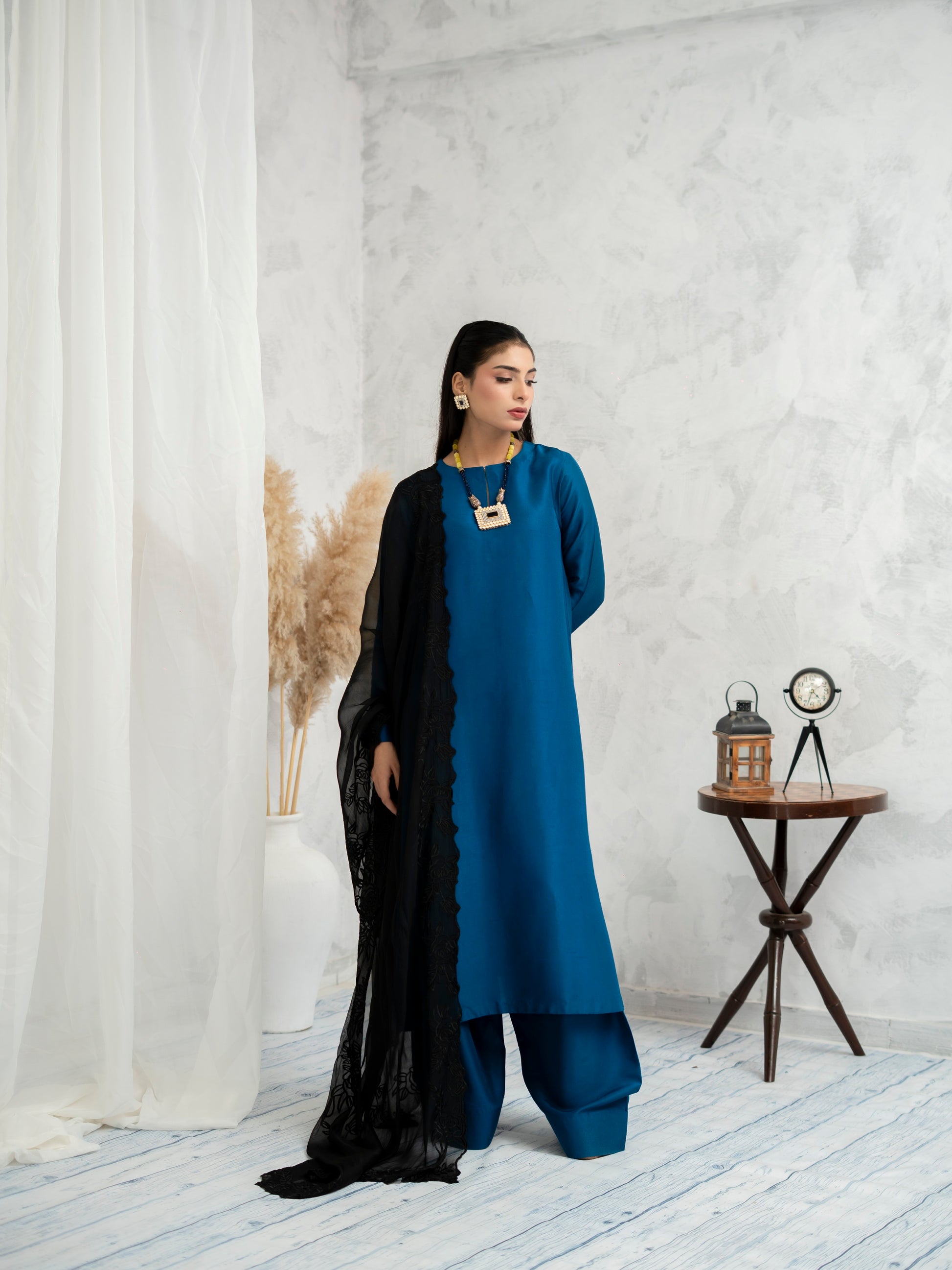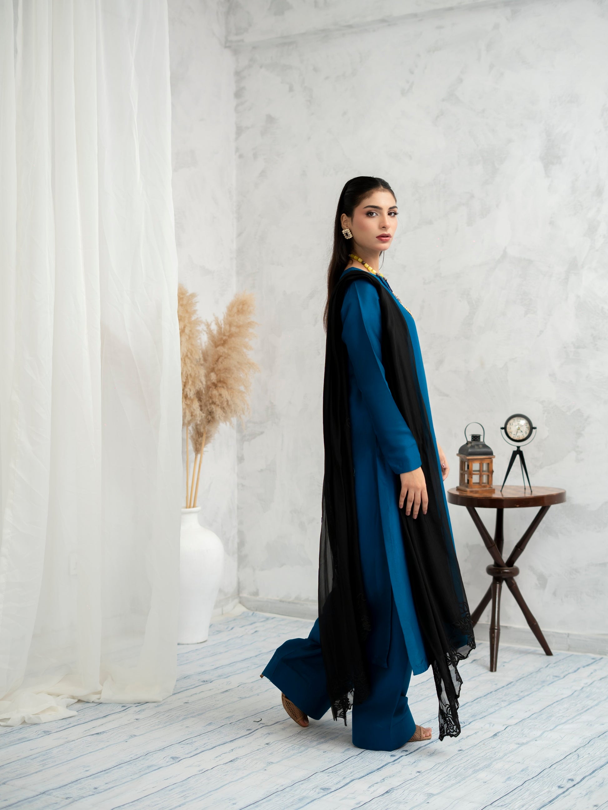 Neelara radiates quiet power through a rich cobalt canvas, accentuated by a delicate black lace dupatta that adds mystery and poise. This ensemble blends tradition with contemporary minimalism—a perfect expression of refined elegance for the modern muse