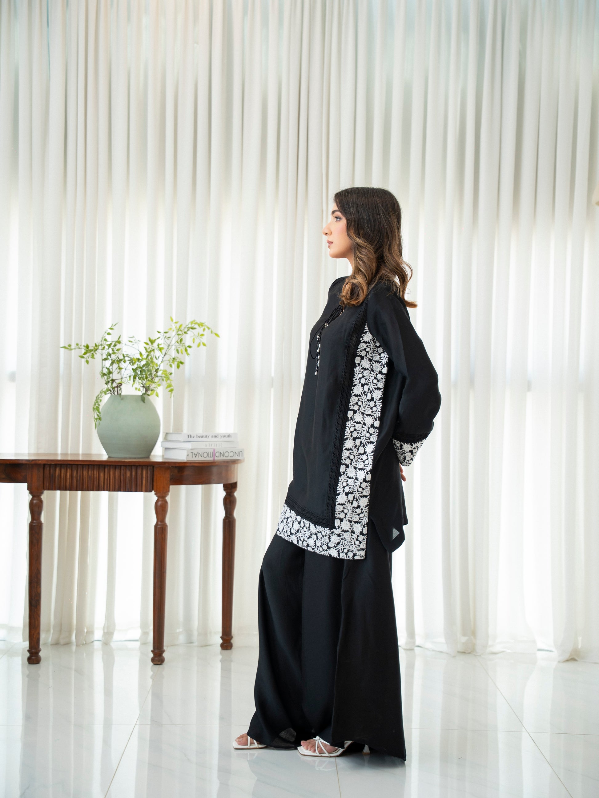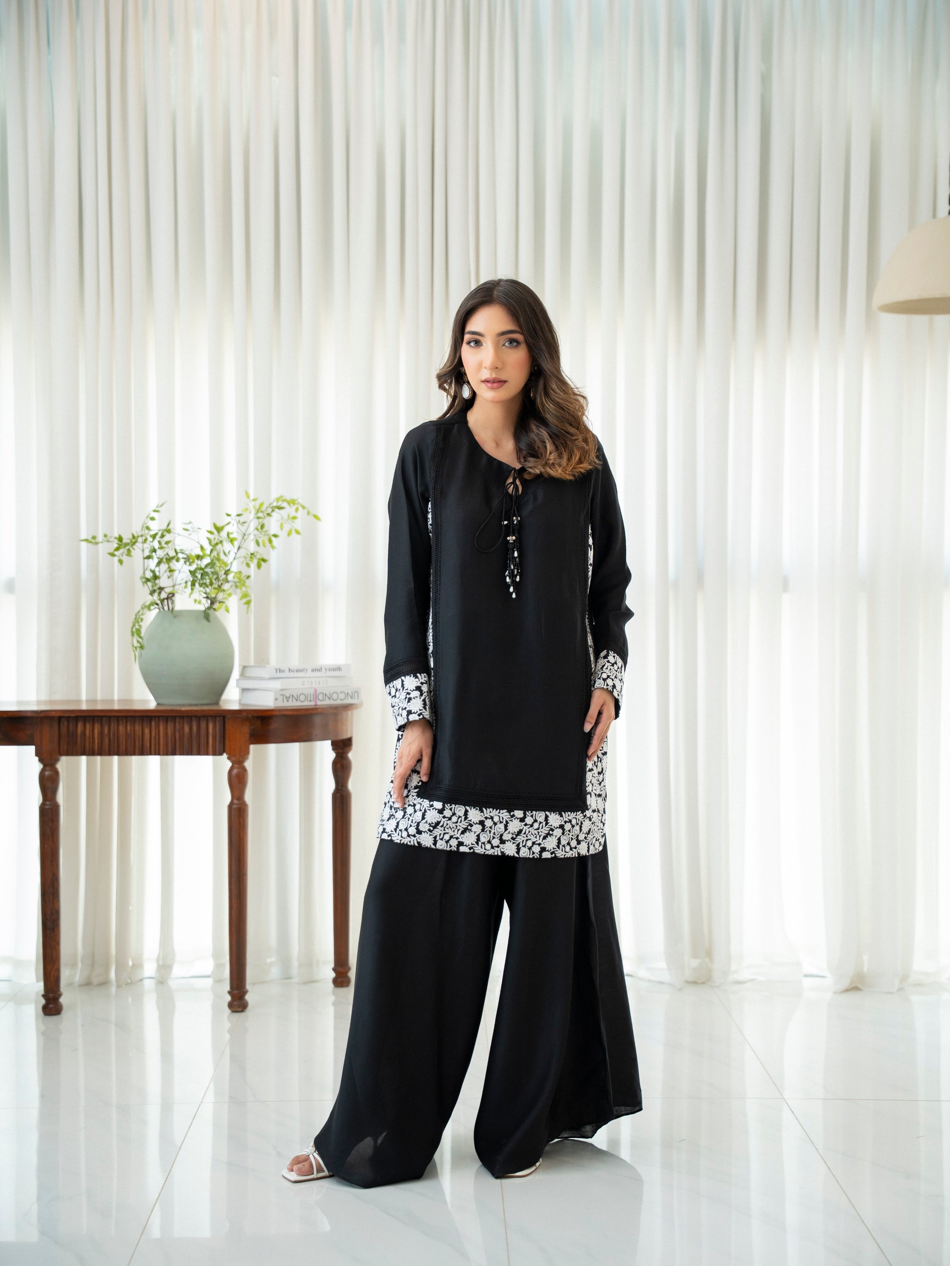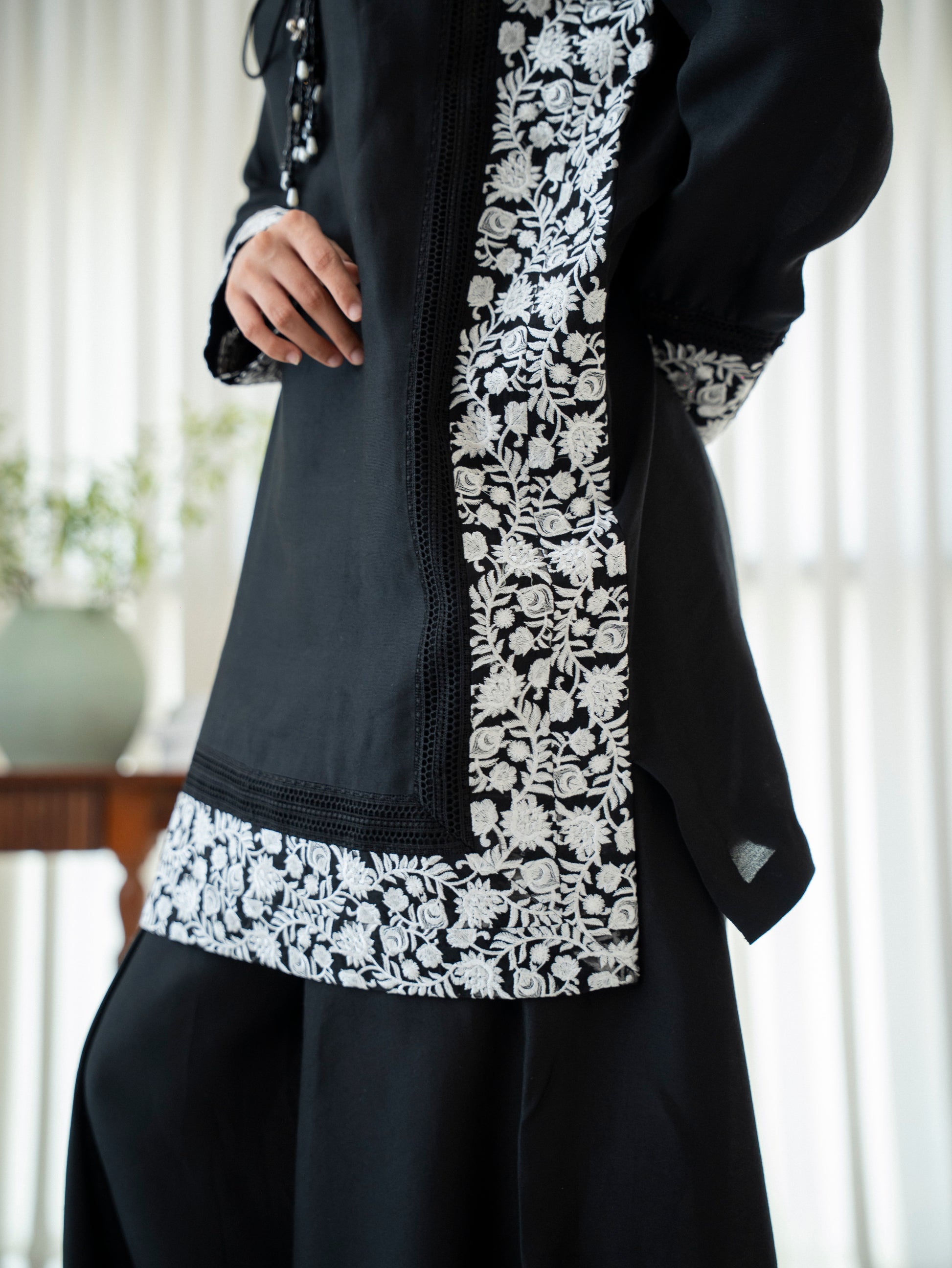 Noir Jardin is the epitome of modern elegance—crafted in luxe black premium silk and accentuated with white botanical embroidery on the borders and cuffs. The minimal design paired with a wide-leg silhouette brings an effortlessly graceful charm to your day-to-evening wardrobe. Sophisticated, bold, and endlessly versatile.