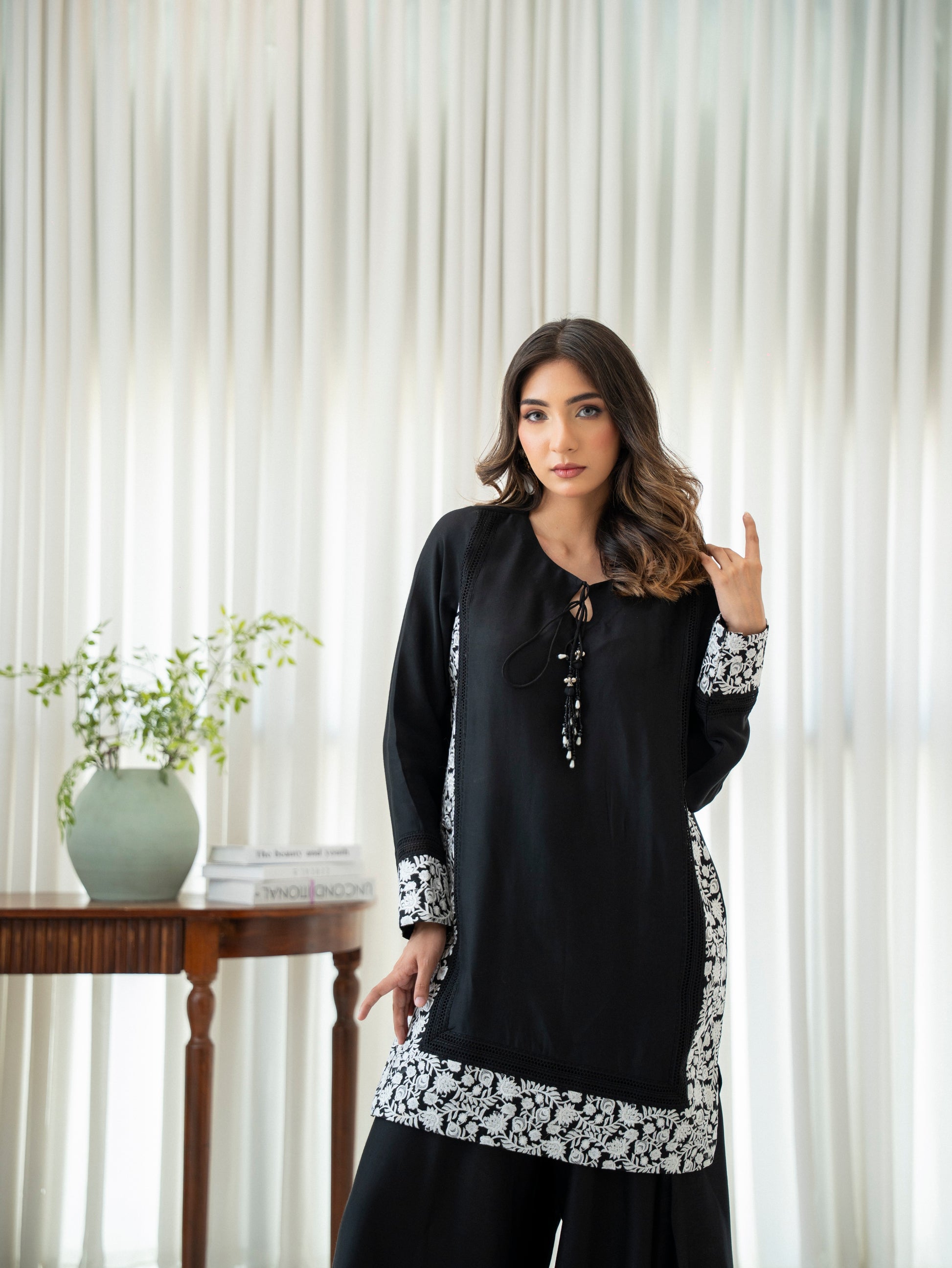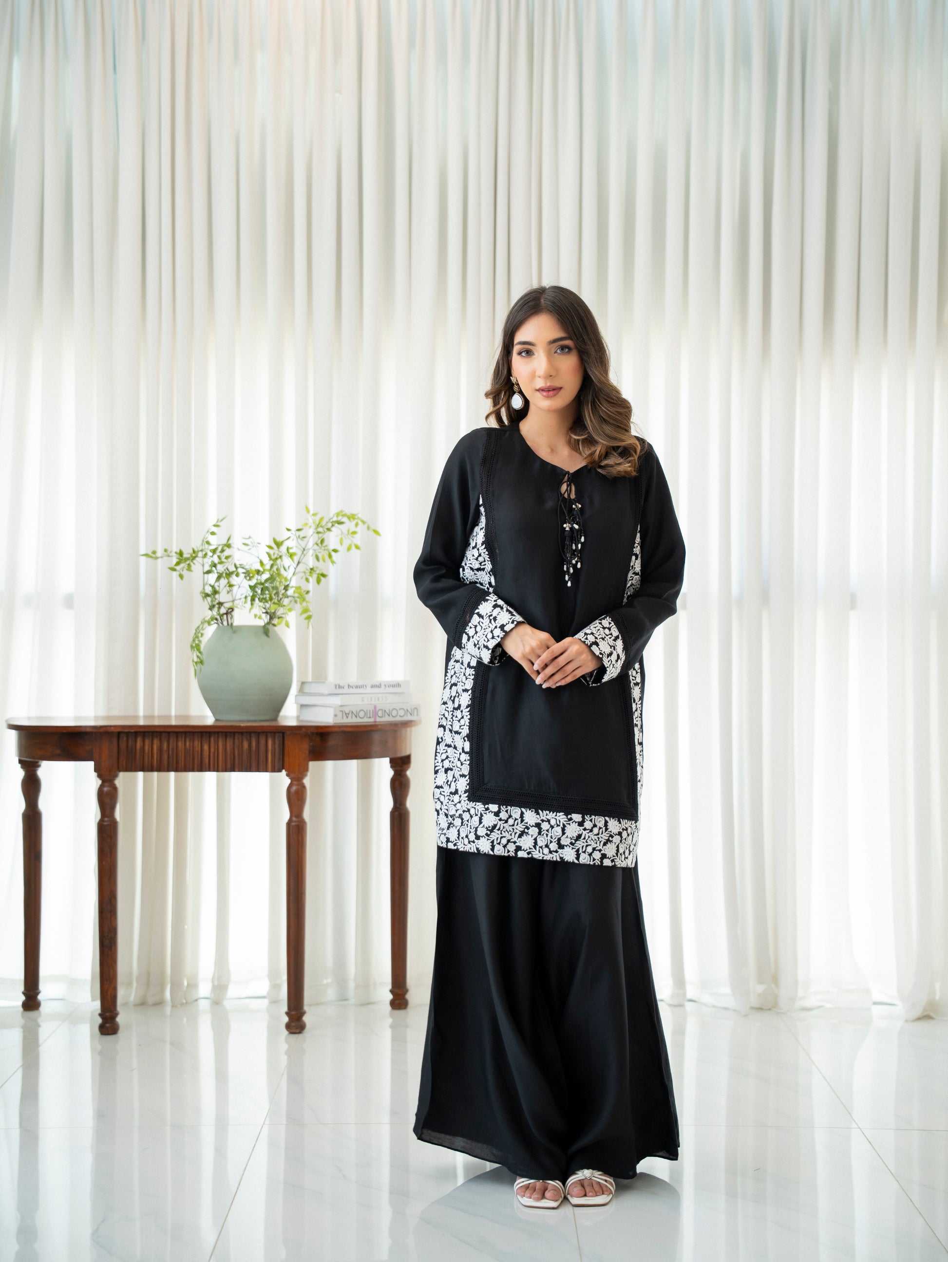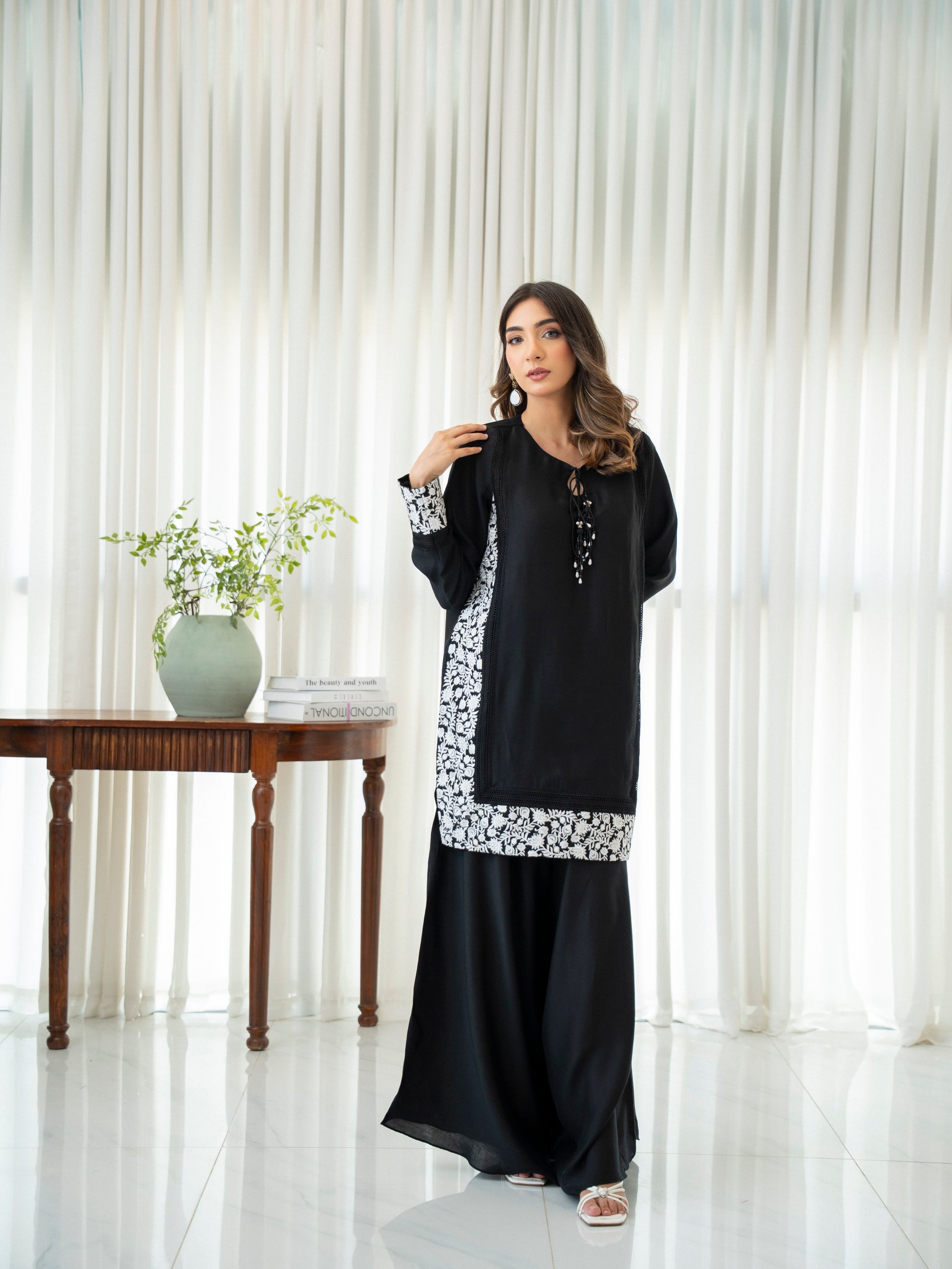 Noir Jardin is the epitome of modern elegance—crafted in luxe black premium silk and accentuated with white botanical embroidery on the borders and cuffs. The minimal design paired with a wide-leg silhouette brings an effortlessly graceful charm to your day-to-evening wardrobe. Sophisticated, bold, and endlessly versatile.