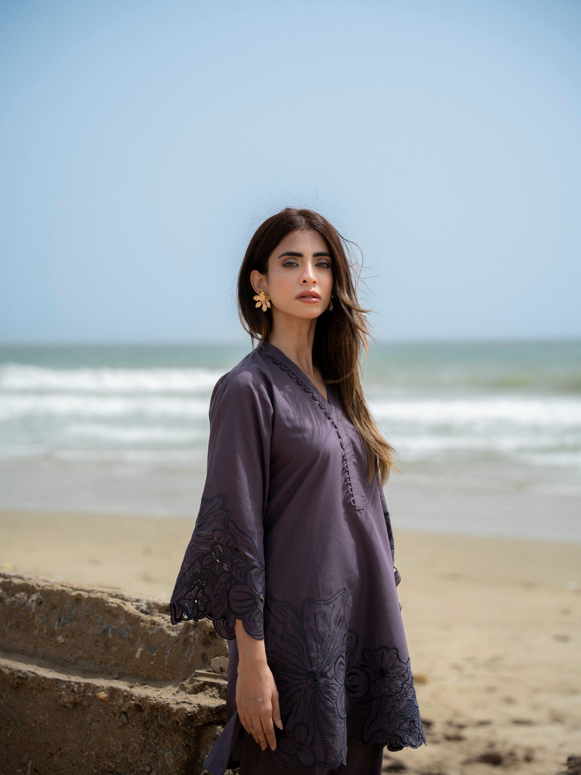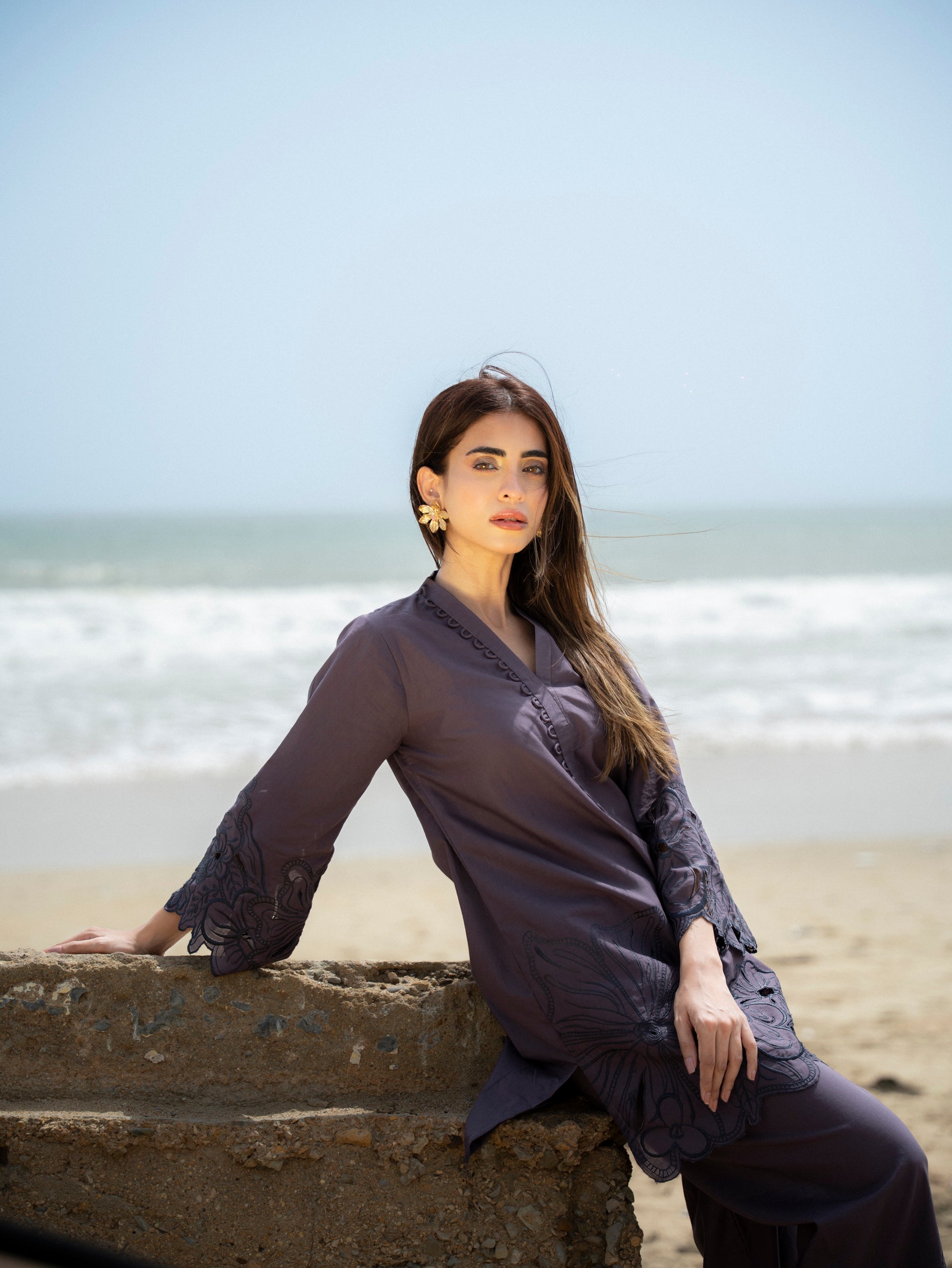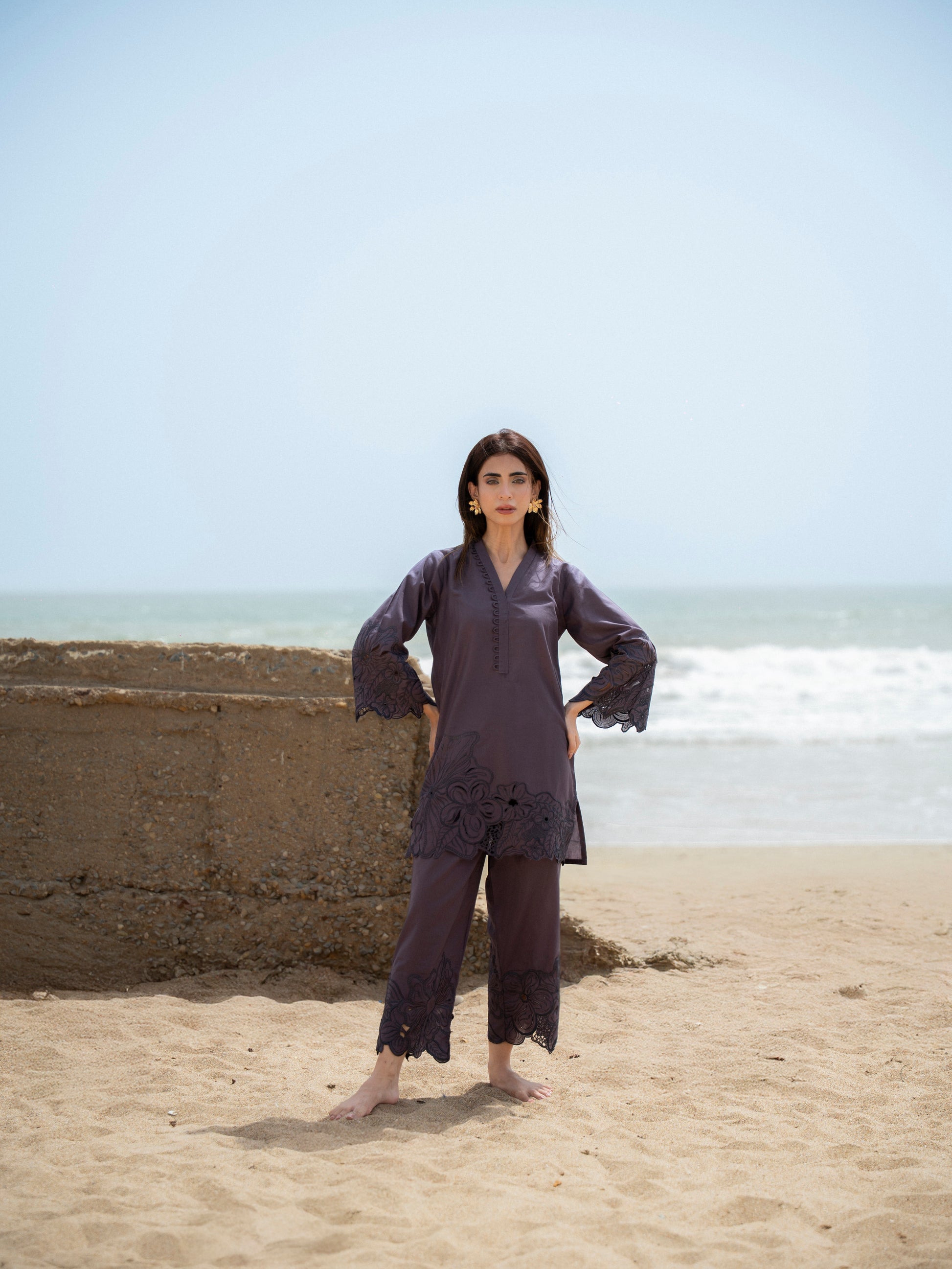 understated yet unforgettable—noirétte is a modern classic. this deep mauve set is elevated with intricate floral cutwork on the hem and cuffs, making it a subtle statement in sophistication. lightweight, refined, and made for evening breezes or city sunsets