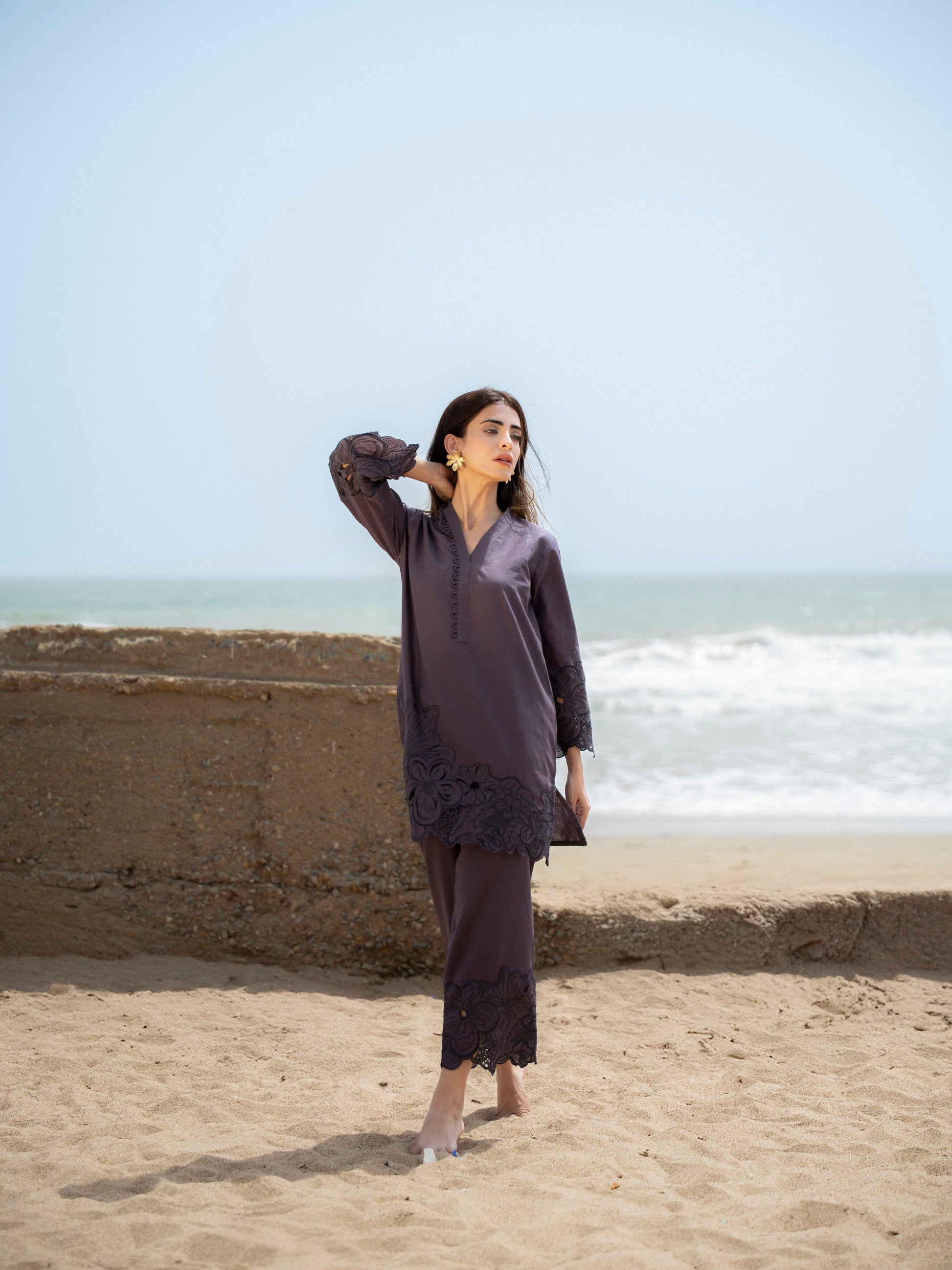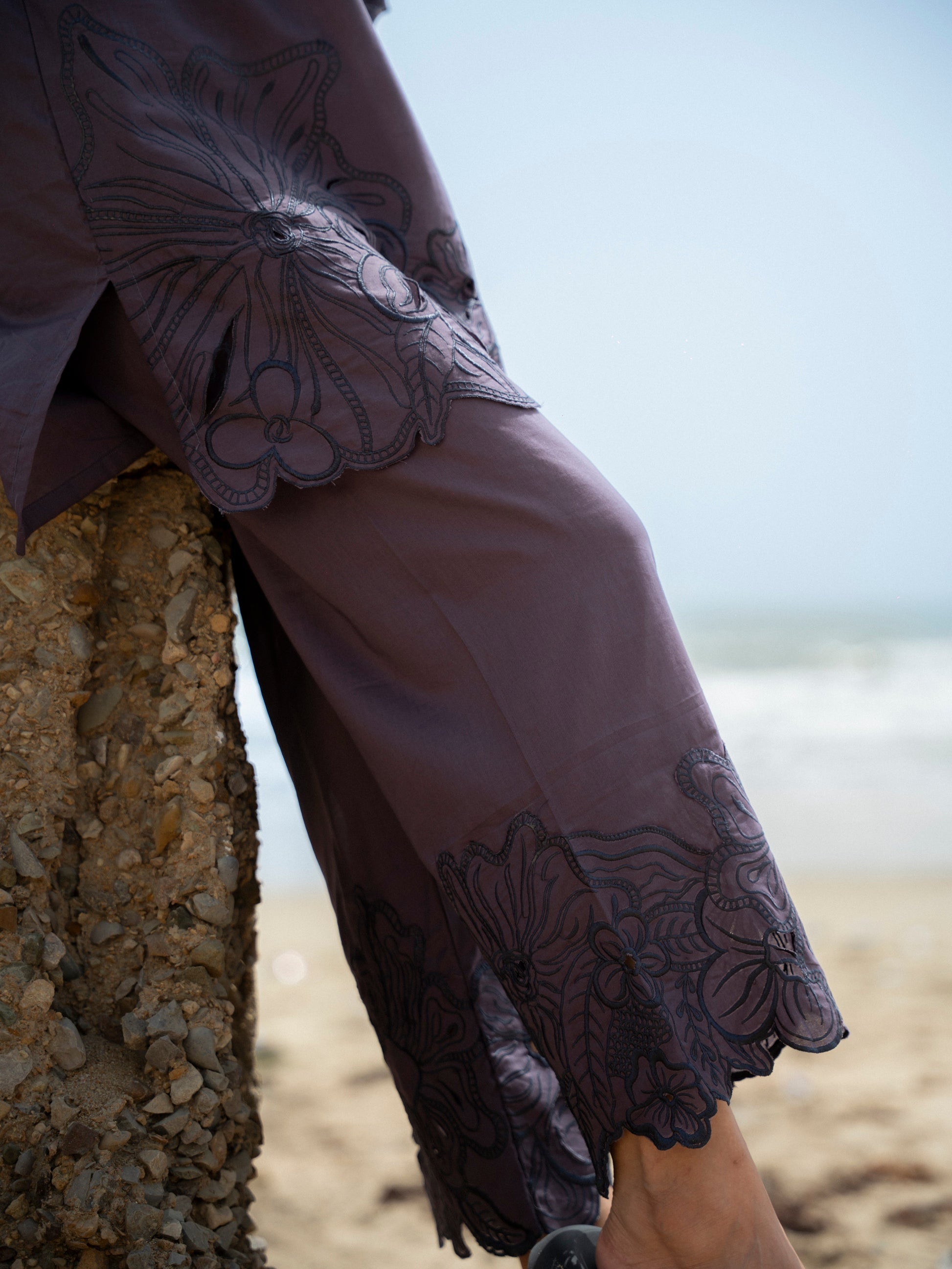 understated yet unforgettable—noirétte is a modern classic. this deep mauve set is elevated with intricate floral cutwork on the hem and cuffs, making it a subtle statement in sophistication. lightweight, refined, and made for evening breezes or city sunsets