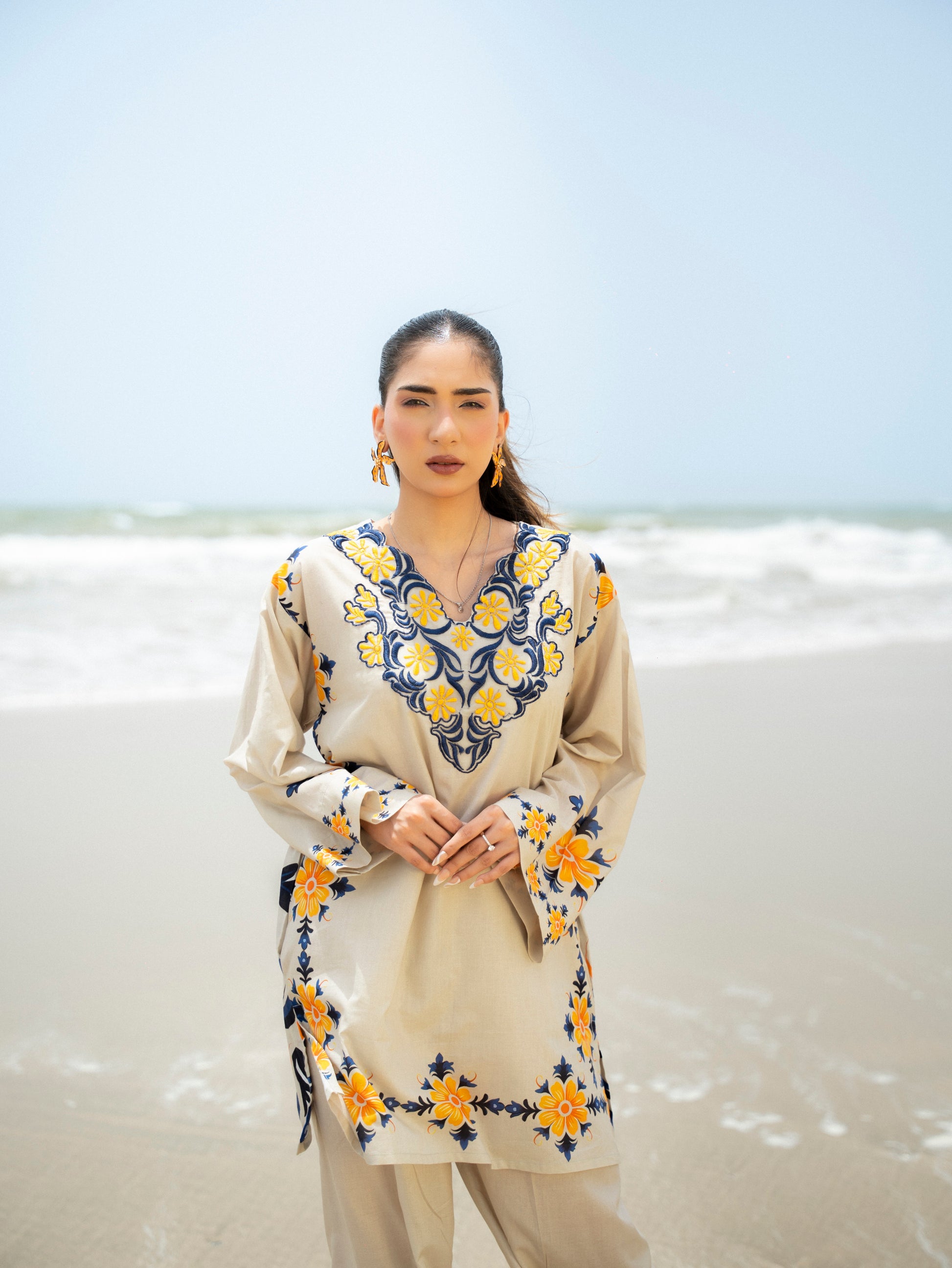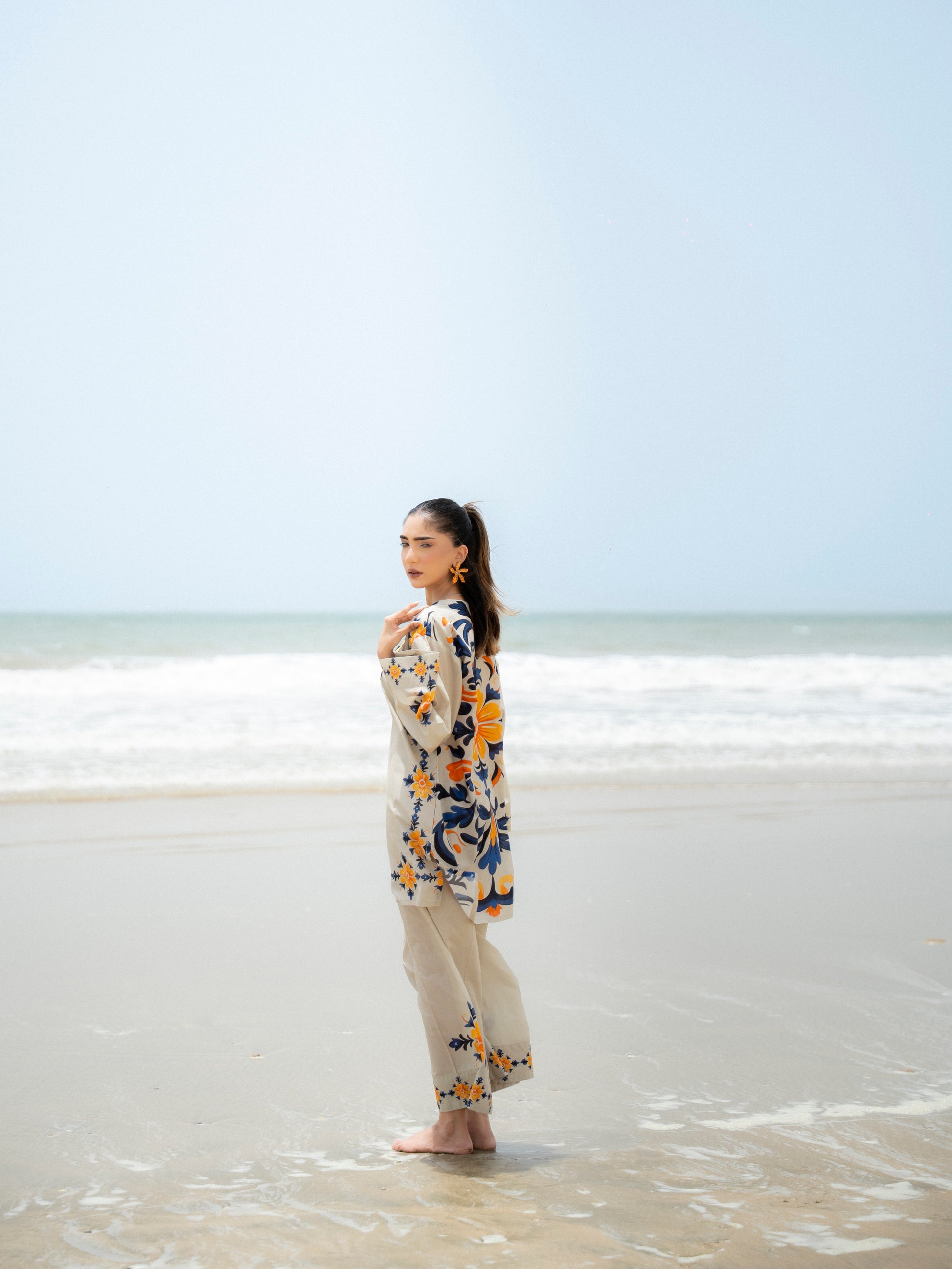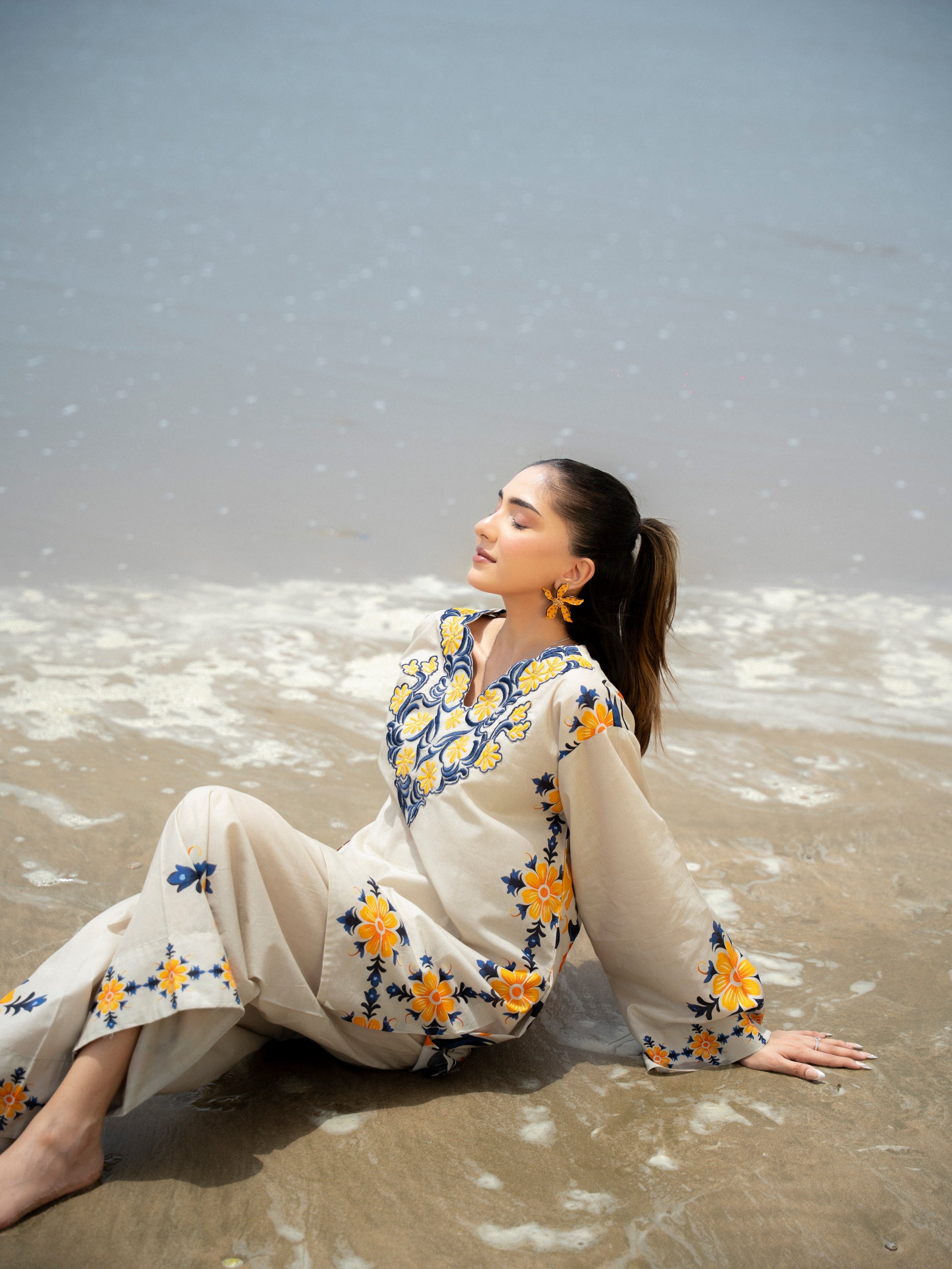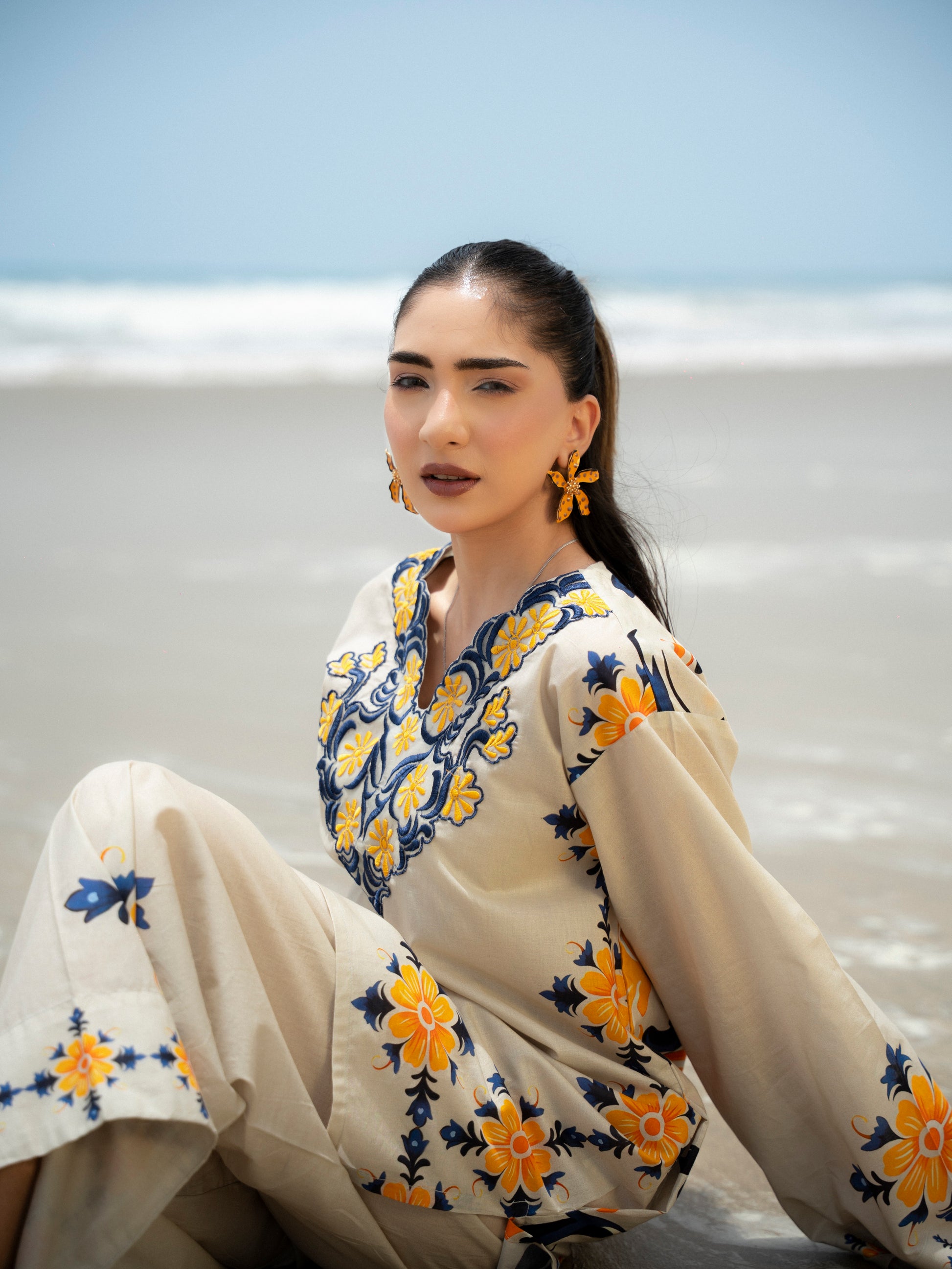 soft neutrals meet sunlit florals in “nooré”, a glowing beige set adorned with hand-drawn blooms in golden yellow and cobalt blue. an easy, elevated choice for effortless days under the sky.