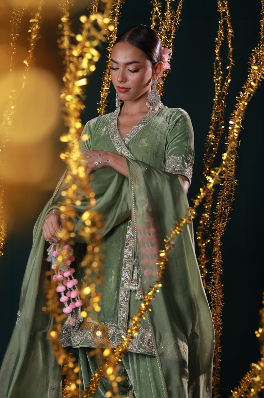 Nureh is a sage green velvet ensemble designed with an angled wrap neckline, enhanced with delicate-style embroidery and intricate borders. The silhouette merges classic charm with effortless sophistication — perfect for dholkis, festive brunches, or winter mehfils with a soft statement
