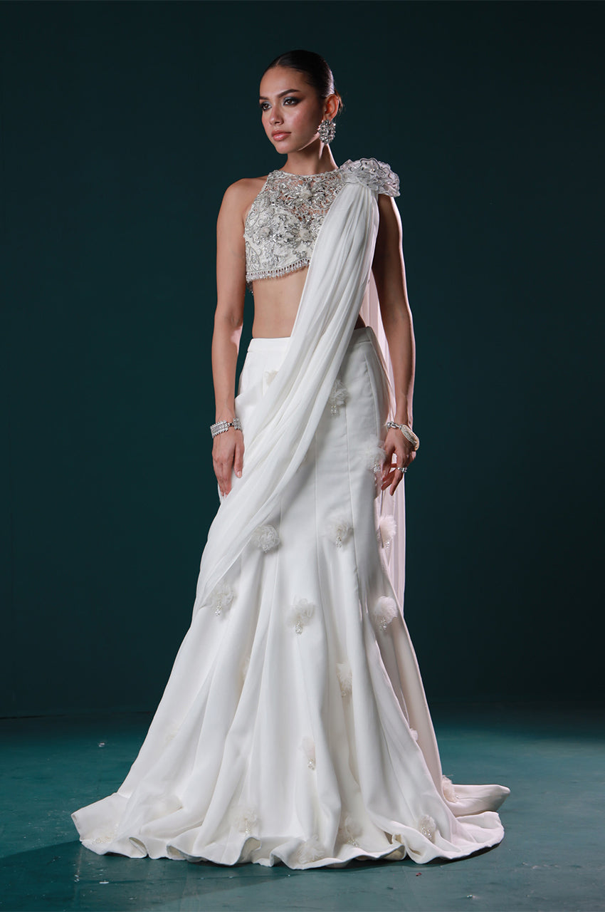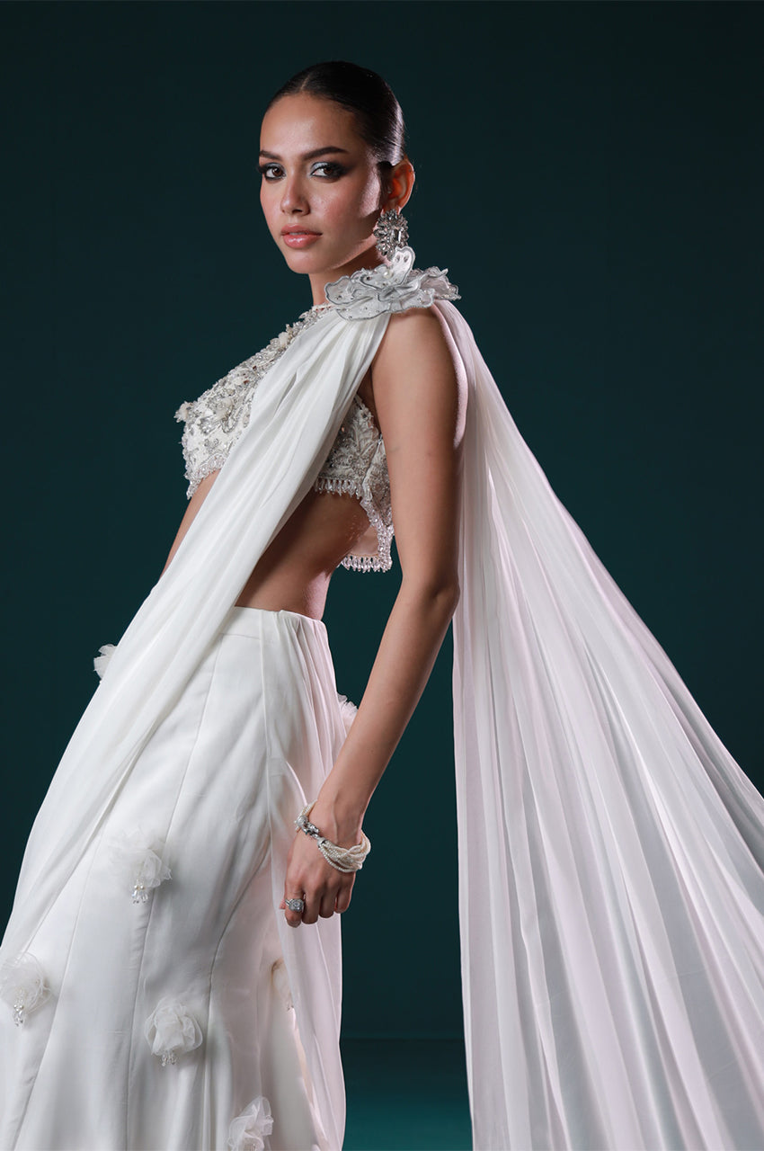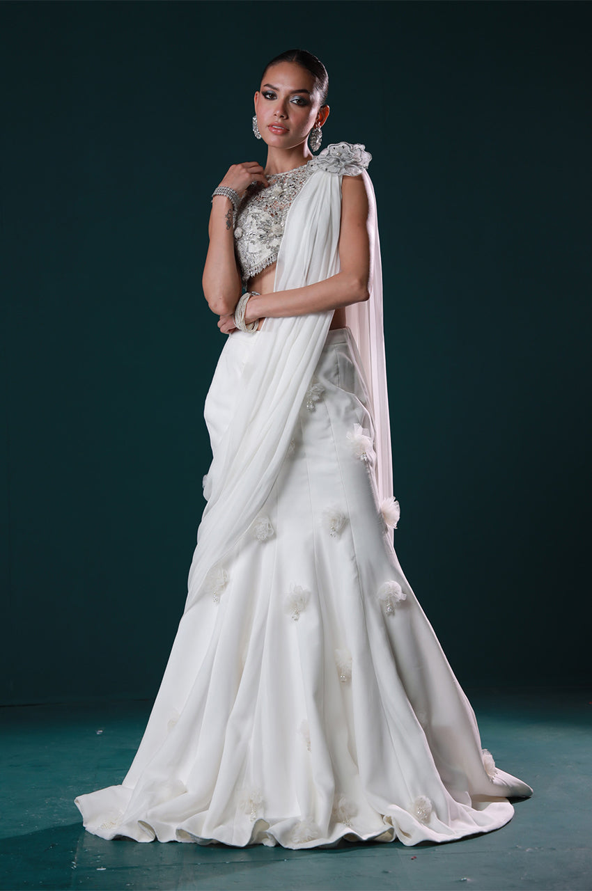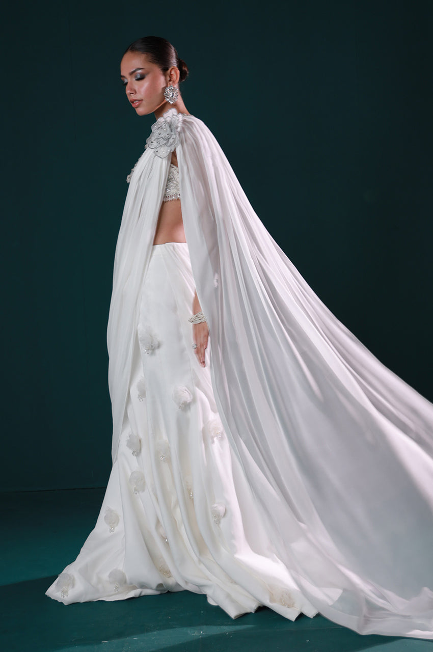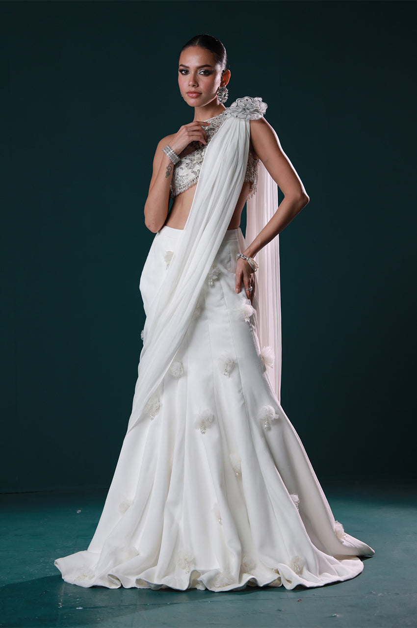 Orel, a celestial white lehenga crafted for the modern muse. Adorned with delicate floral appliqués and a hand-embellished sculpted choli, it flows effortlessly with a one-shoulder drape. Minimal yet profoundly impactful, perfect for receptions, nikkahs, and contemporary bridal moments.