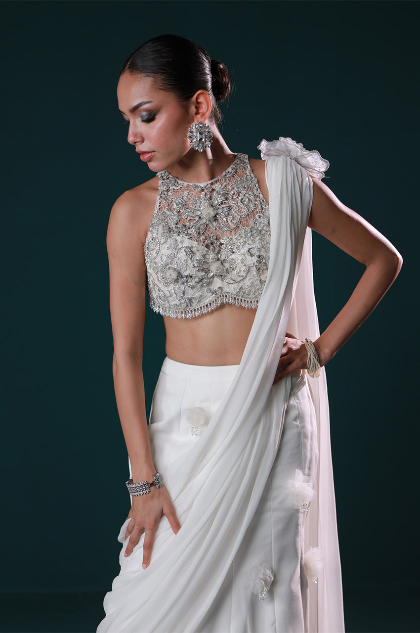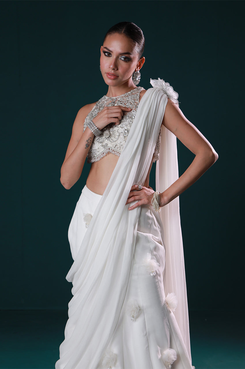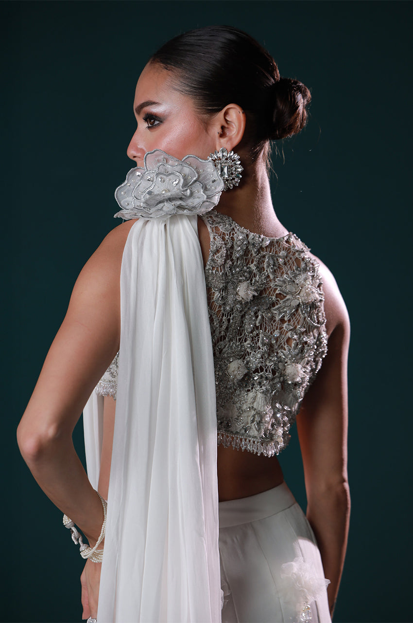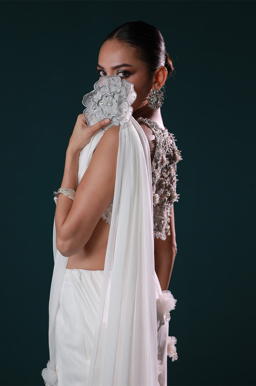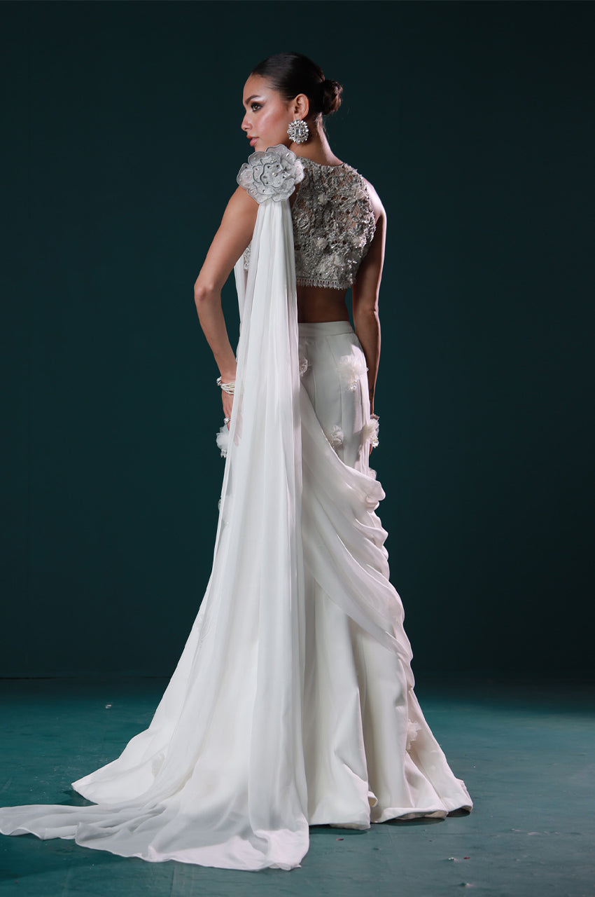 Orel, a celestial white lehenga crafted for the modern muse. Adorned with delicate floral appliqués and a hand-embellished sculpted choli, it flows effortlessly with a one-shoulder drape. Minimal yet profoundly impactful, perfect for receptions, nikkahs, and contemporary bridal moments.