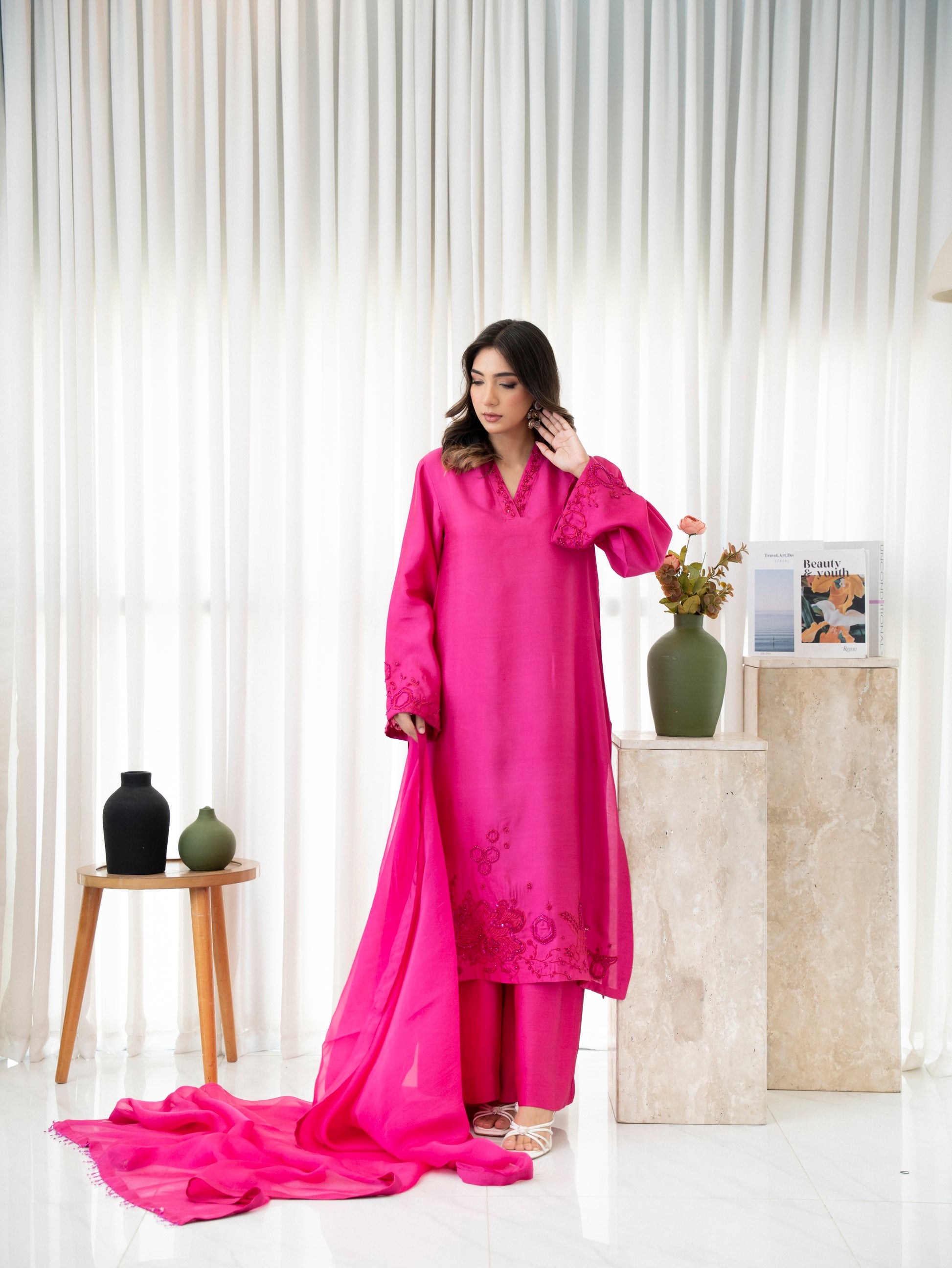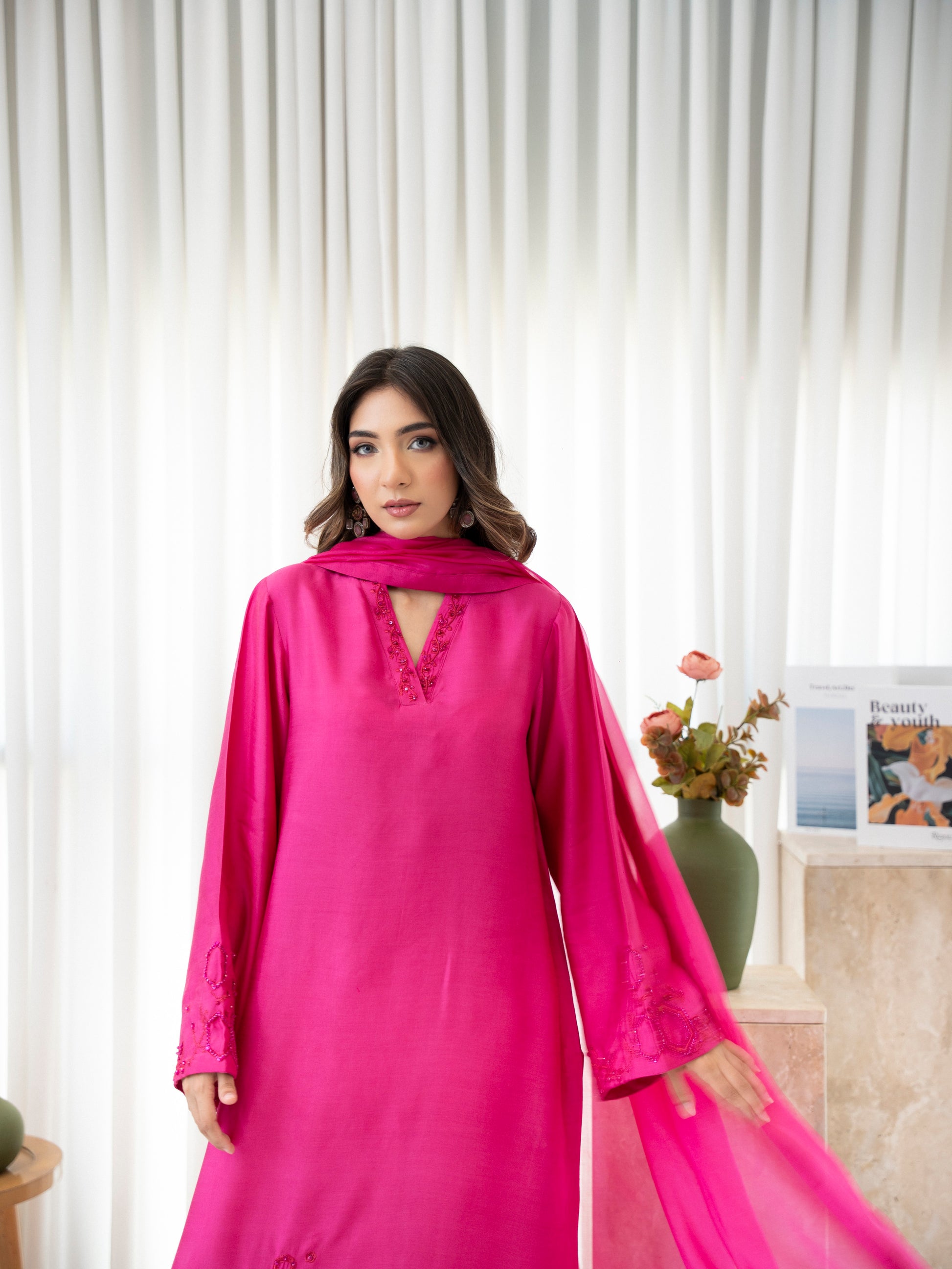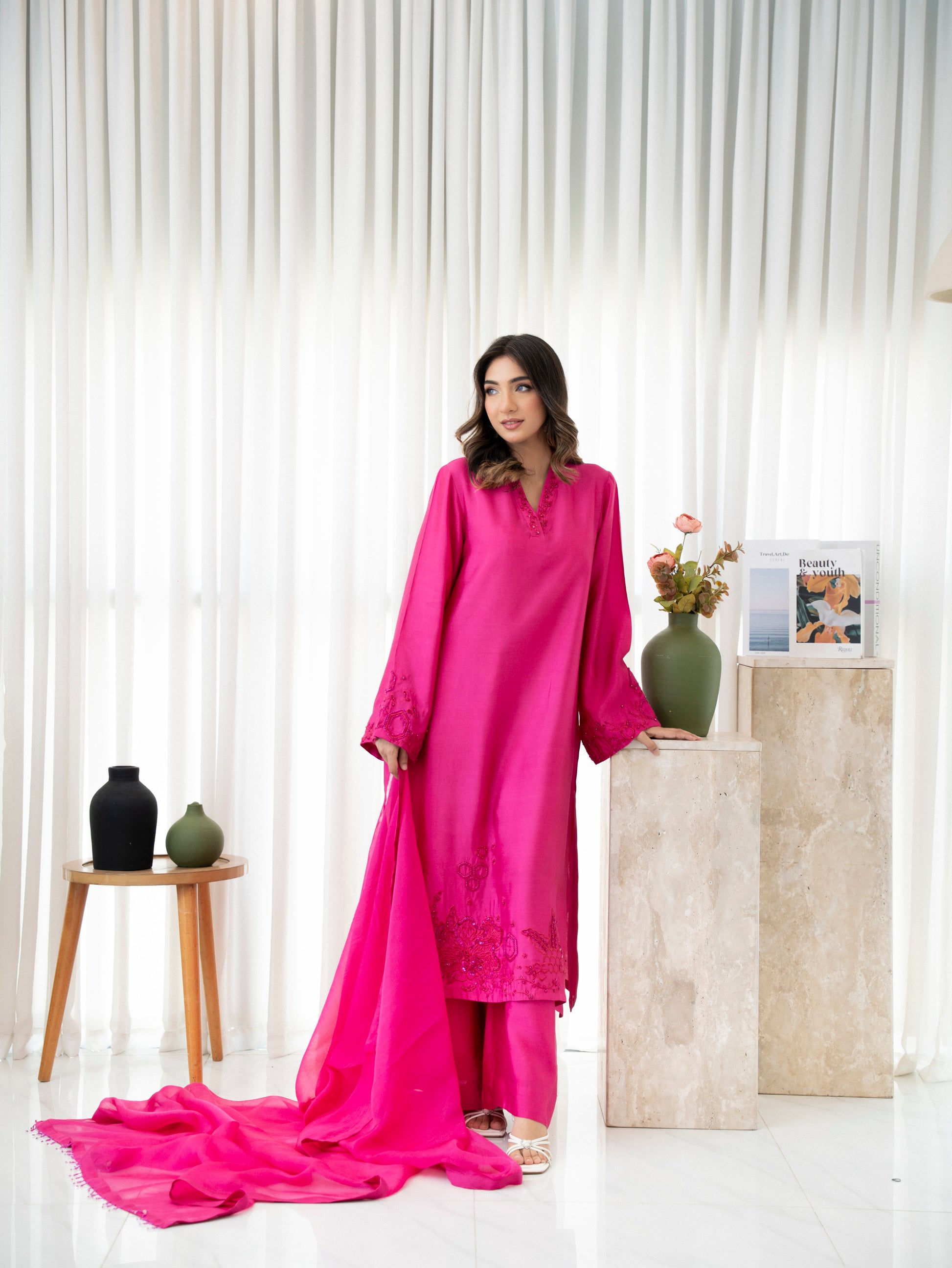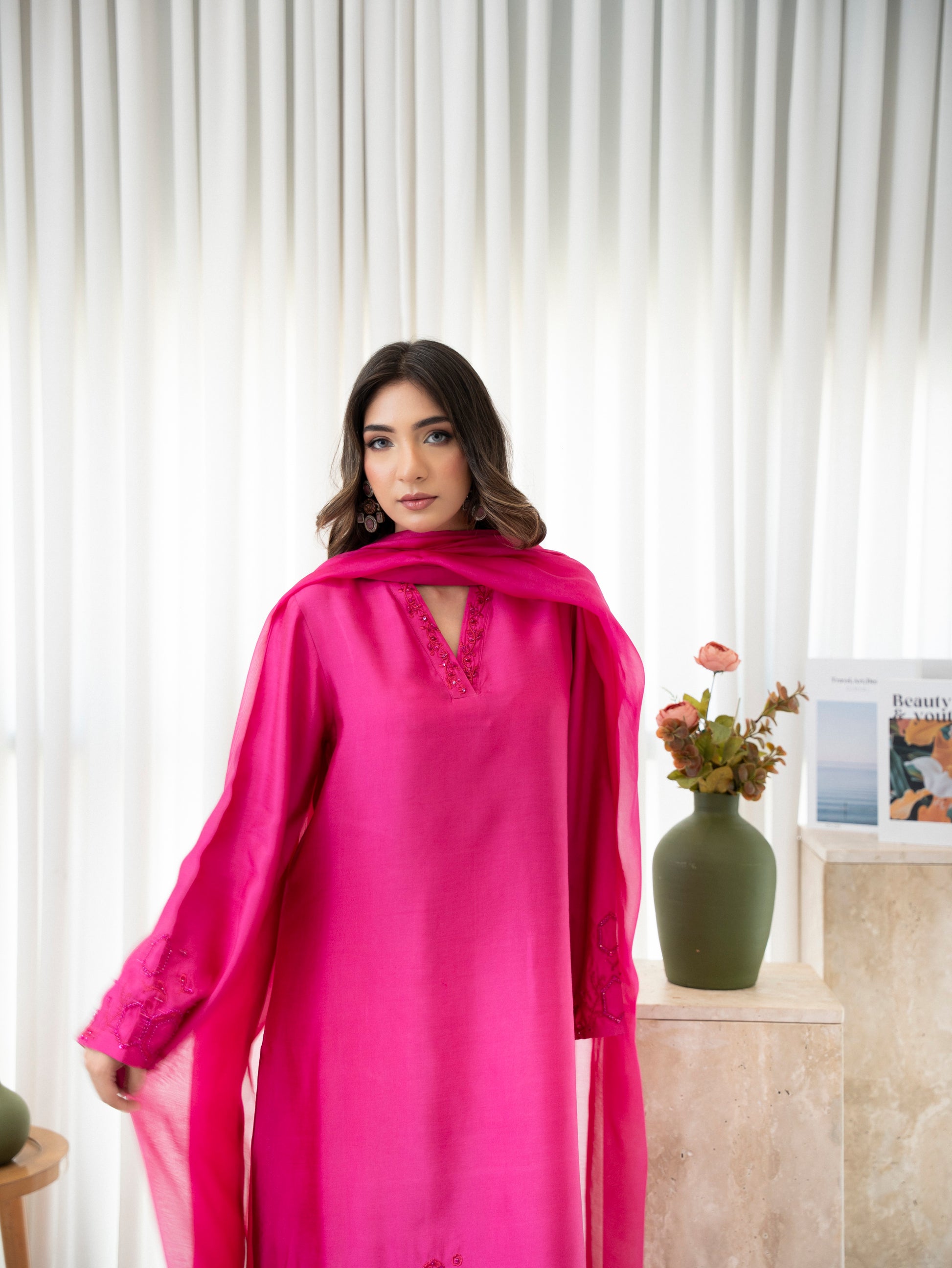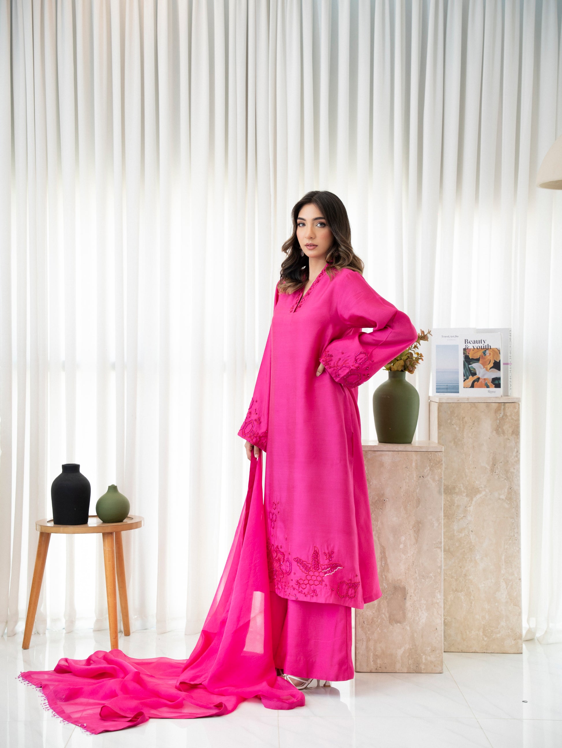 Rosette Blush is a bold yet feminine expression of timeless charm. Rendered in a striking rose pink shade, this premium silk ensemble is adorned with delicate tonal embroidery and finished with a soft, flowy organza dupatta. A radiant 3-piece outfit designed to turn heads—elegant, playful, and effortlessly chic.