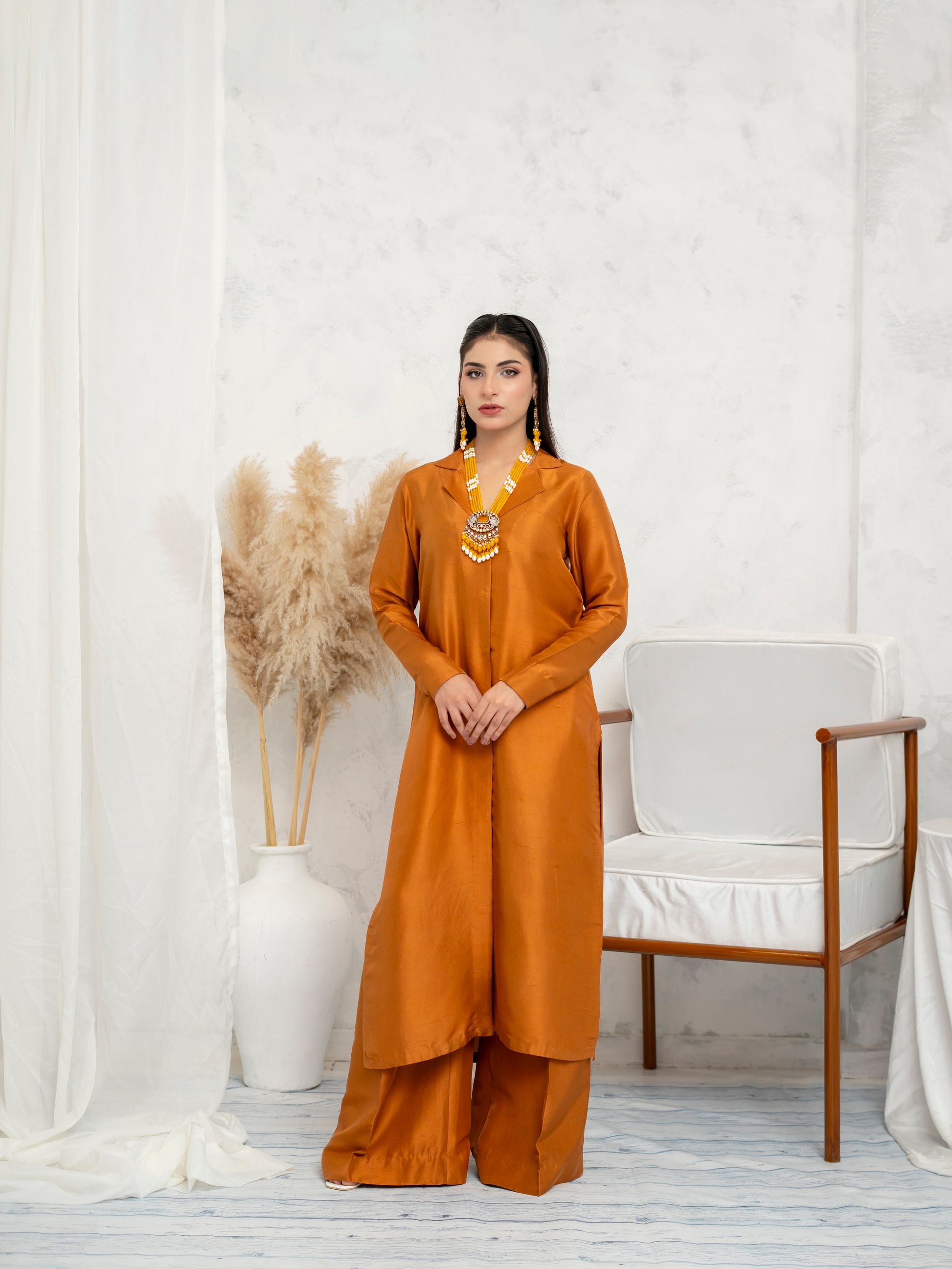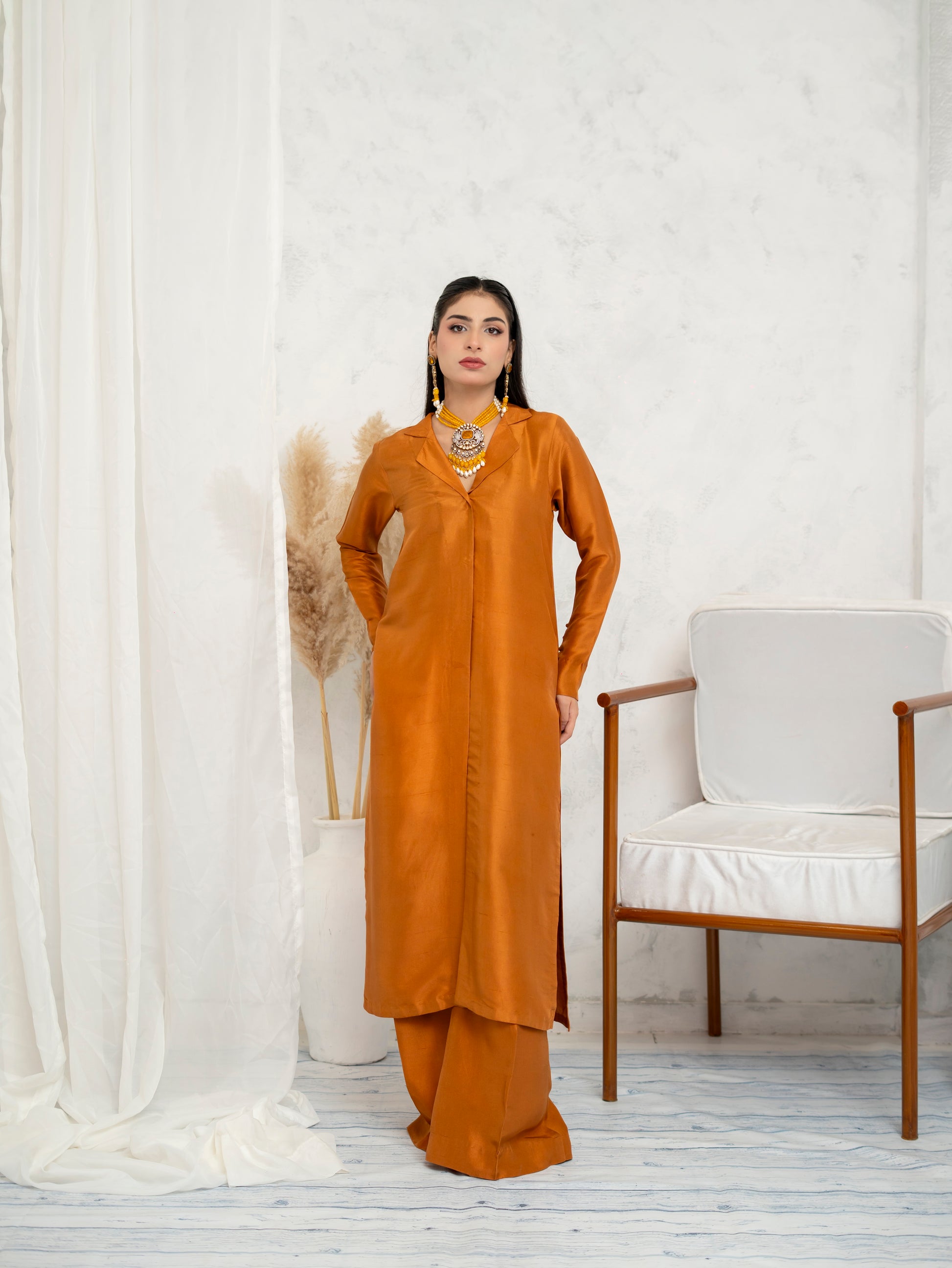 Step into the richness of Sienna Gold — a bold yet elegant ensemble in a burnished amber tone. This long kurta features a polished collar and minimal embellishment, letting the pure vibrancy of the hue command attention. Styled with structured trousers and elevated with traditional jewelry, this look effortlessly blends modernity with heritage sophistication. For the woman who walks in golden light.
