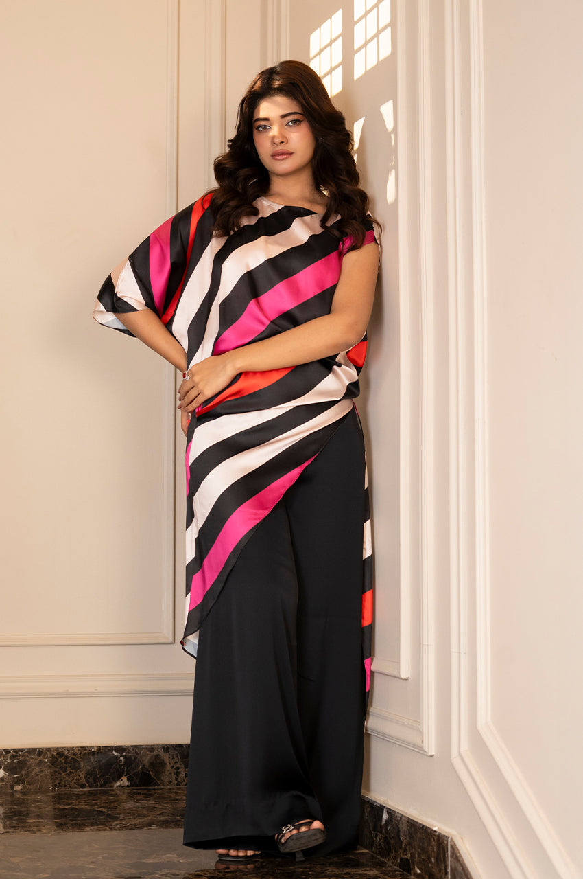 Embrace sophistication with the "Silken Elegance" outfit, crafted from luxurious silk that drapes beautifully against the skin. This ensemble features a striking asymmetrical top, adorned with bold stripes in vibrant hues of pink, black, and white, creating a dynamic and eye-catching design. Paired with sleek black wide-leg pants, the outfit offers both comfort and style, making it perfect for a chic evening out or a sophisticated gathering. The flowing silhouette enhances the wearer's grace, while the high-quality silk material adds a touch of opulence, ensuring that you stand out with effortless elegance.