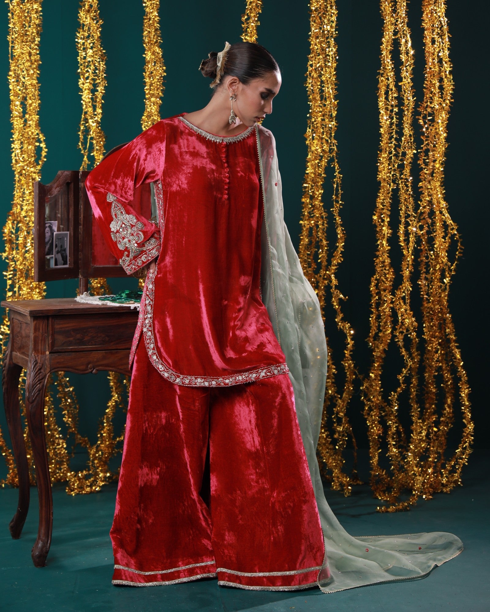 Jahanara is a striking red velvet ensemble designed with timeless elegance in mind. The rich tone is elevated by intricate gold embroidery and paired with a soft mint dupatta for a royal contrast. From winter weddings to intimate mehfils, this look channels grandeur with grace.