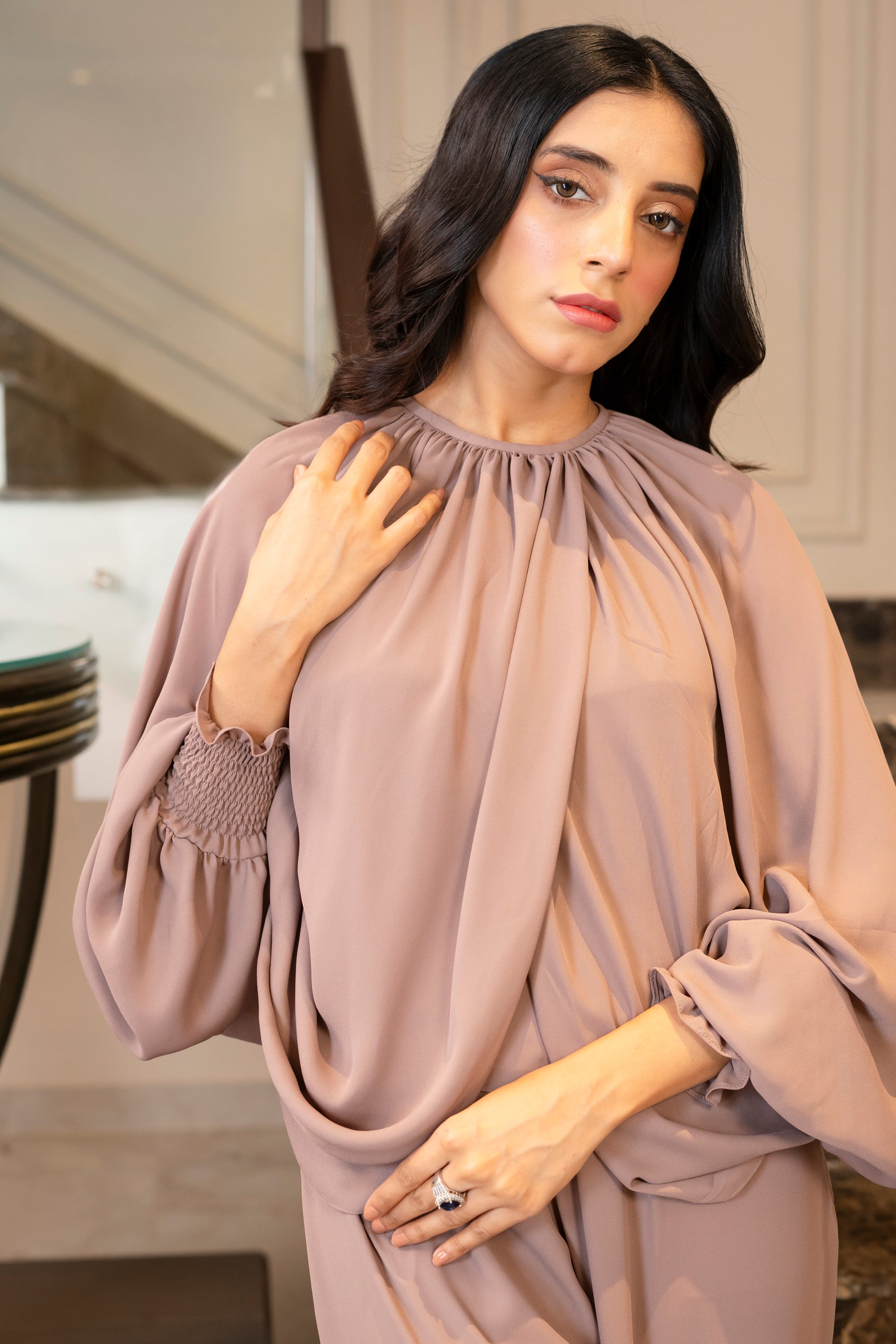 Experience the charm of understated sophistication with the "Soft Elegance" outfit, crafted from delicate Georgette fabric. This stunning ensemble features a soft taupe top designed with gentle pleats and a relaxed silhouette, complemented by flowing, bell-shaped sleeves that add a touch of whimsy. The lightweight material drapes beautifully, allowing for effortless movement and comfort. The outfit can be paired with tailored trousers or a sleek skirt to create a polished look suitable for both casual outings and formal occasions. The muted color palette embodies a serene aesthetic, making it a versatile addition to any wardrobe.