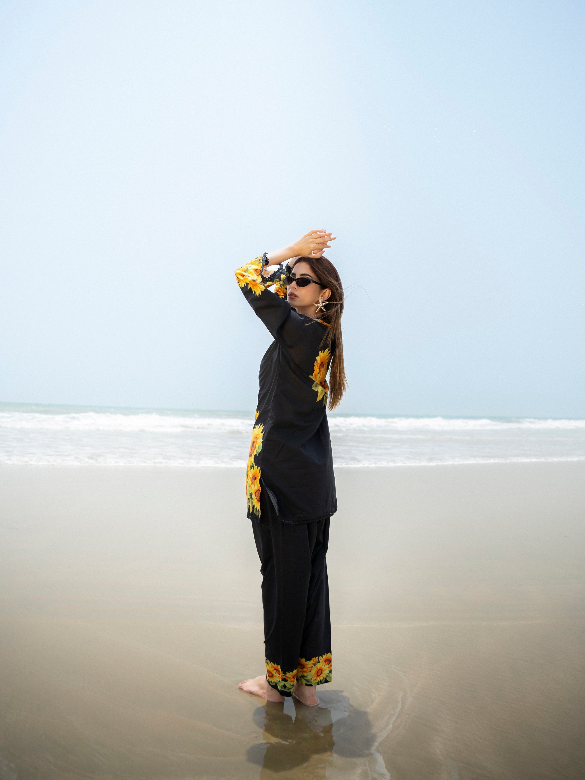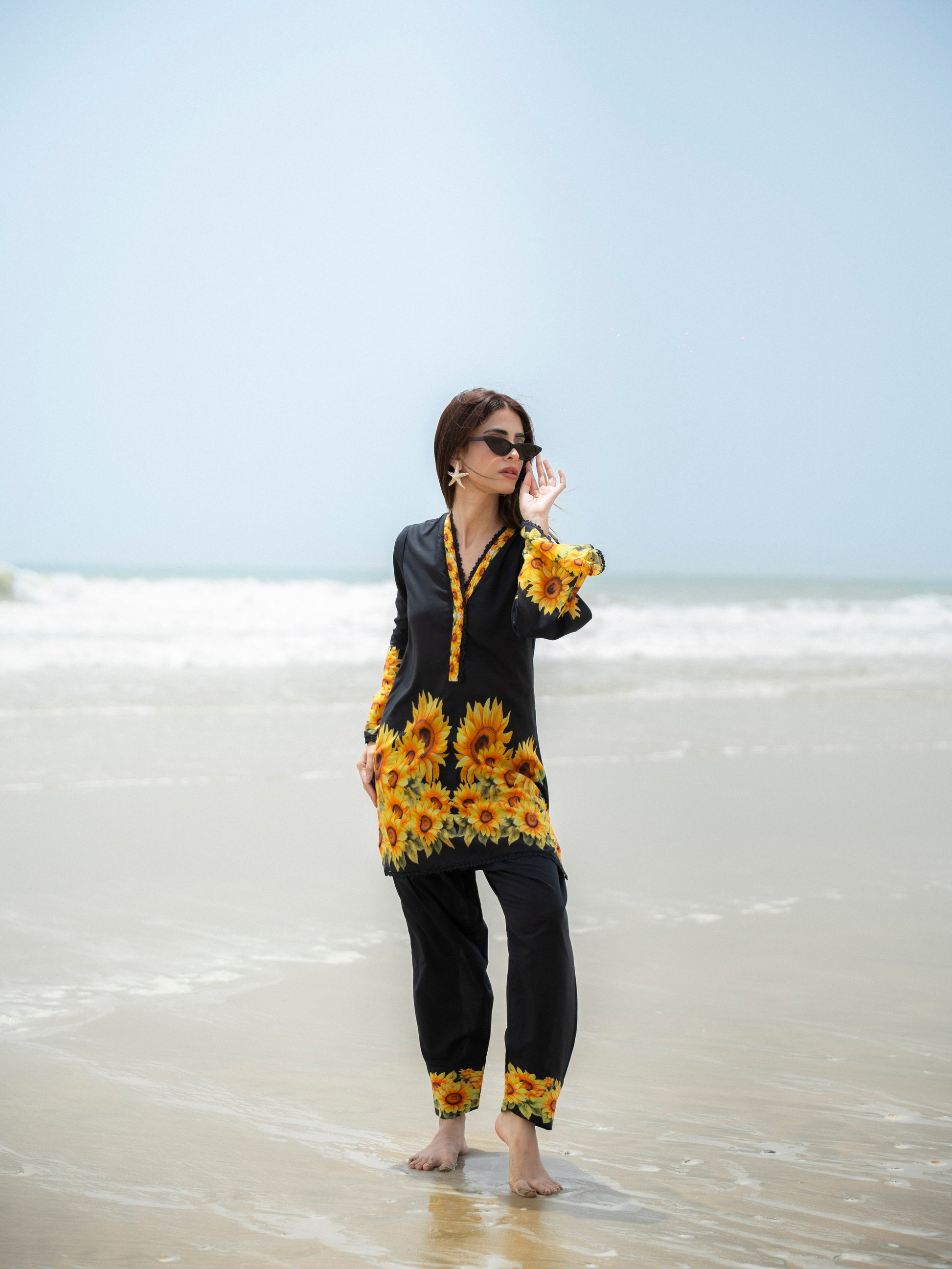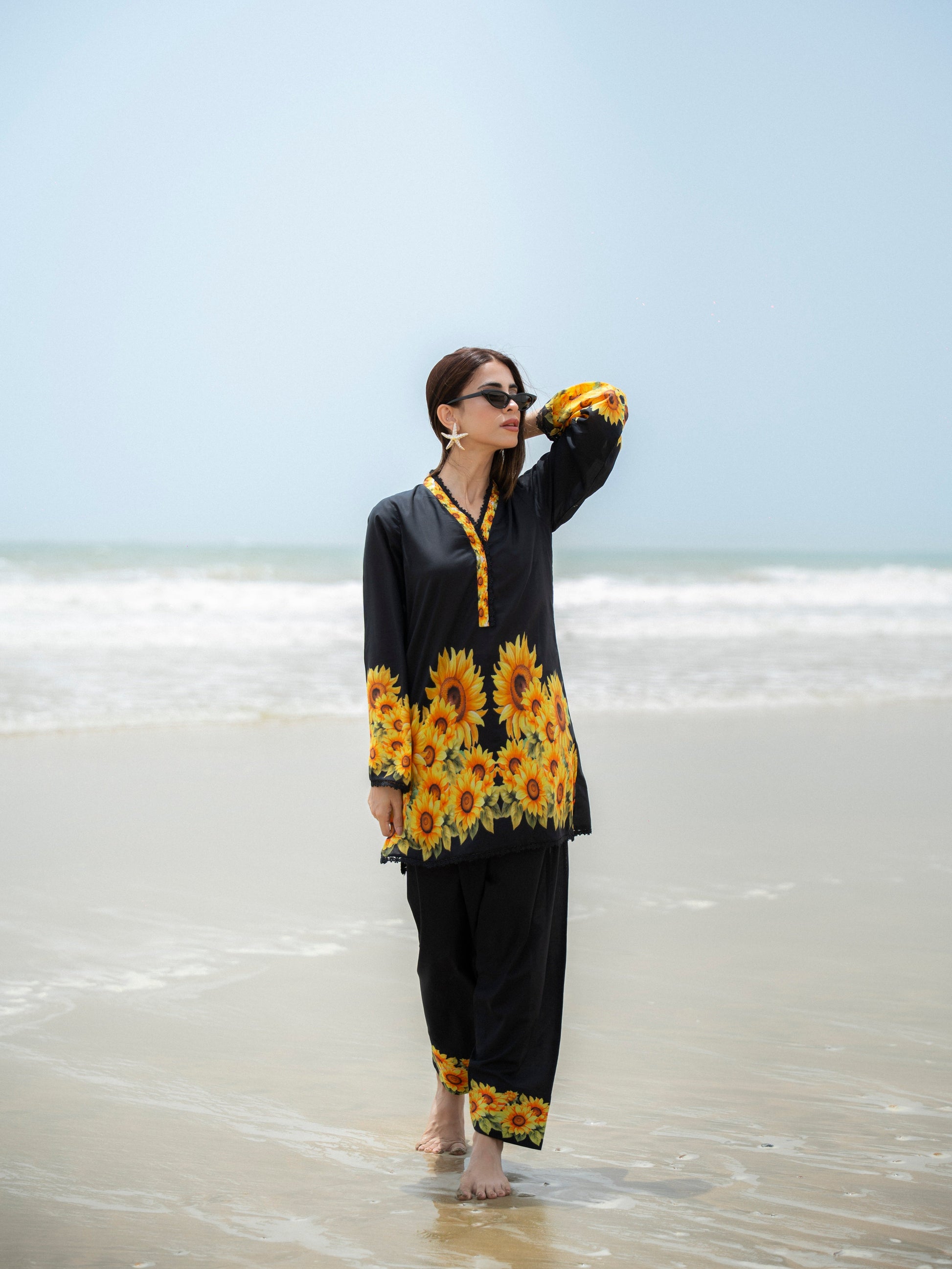 embrace sunshine in style with “solora”, a black ensemble bursting with vibrant sunflowers that capture the essence of summer. designed in a comfortable cut with statement sleeves and tapered pants, this look is perfect for seaside escapes or casual gatherings. a refreshing blend of bold and elegant—just like you.