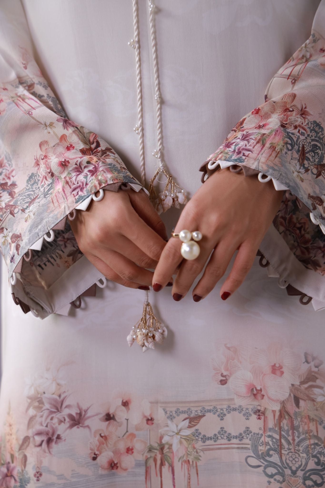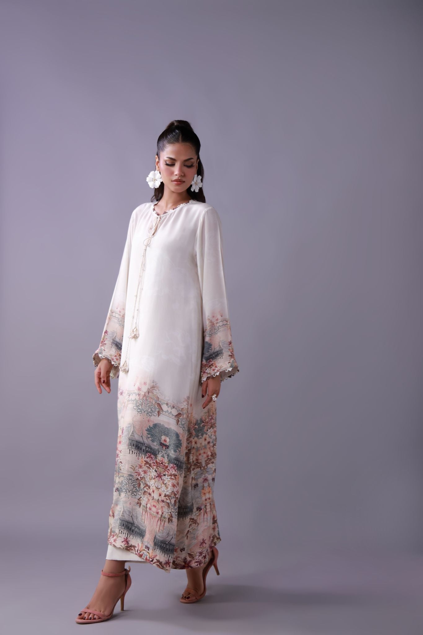 A poetic expression in ivory silk, Sonnet features a garden-inspired print rendered in romantic pastels. Its flowing silhouette and delicate tassel tie neckline capture the softness of springtime serenity with effortless charm and modern finesse.