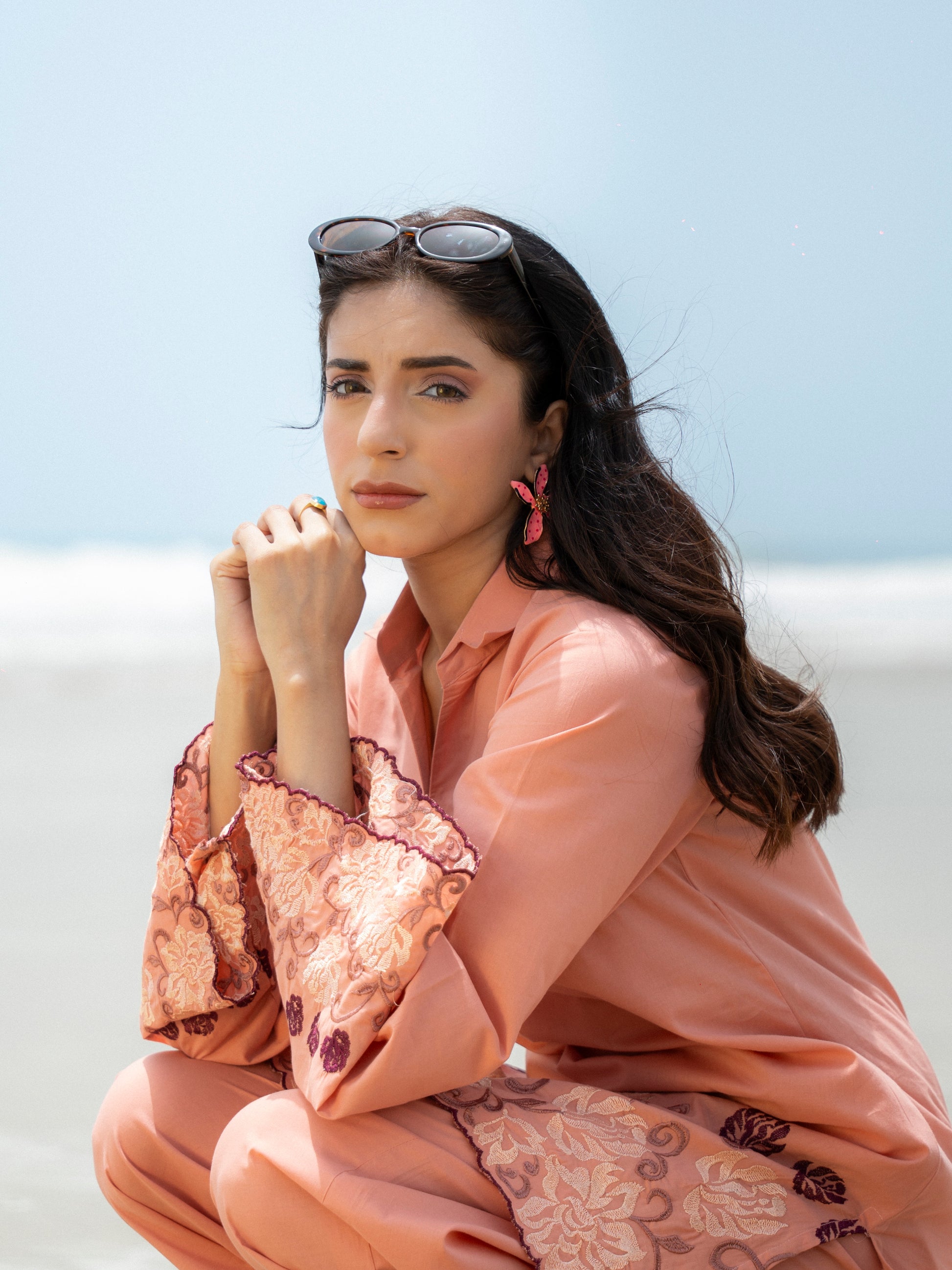 “soraya” brings a whisper of luxury to summer style—with a warm peach base and rich maroon embroidery that dances along the hemlines. classic, calm, and effortlessly chic.
