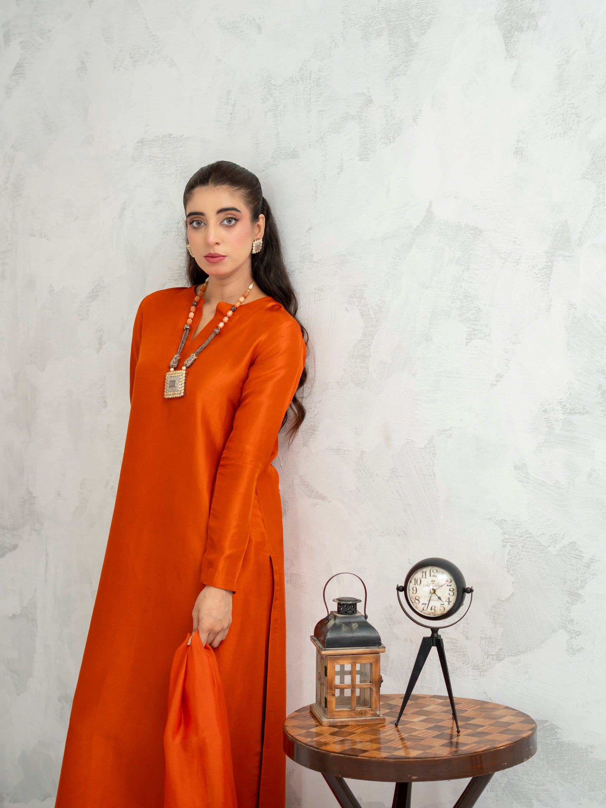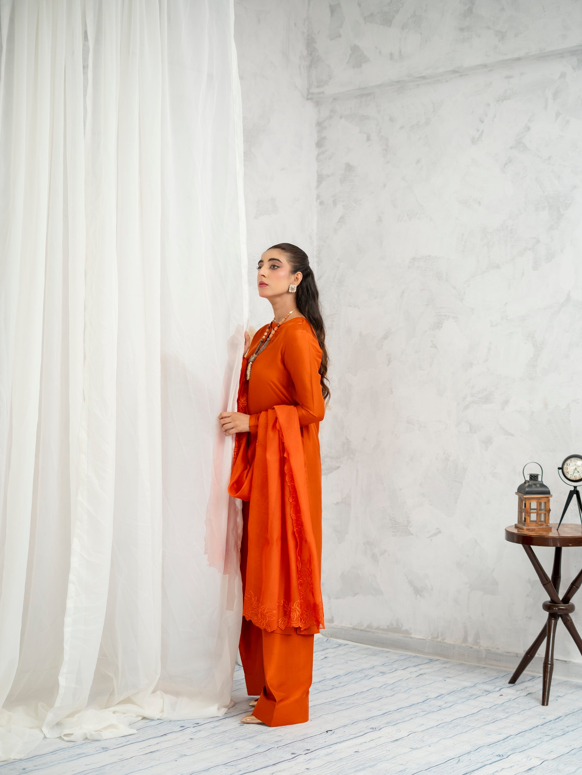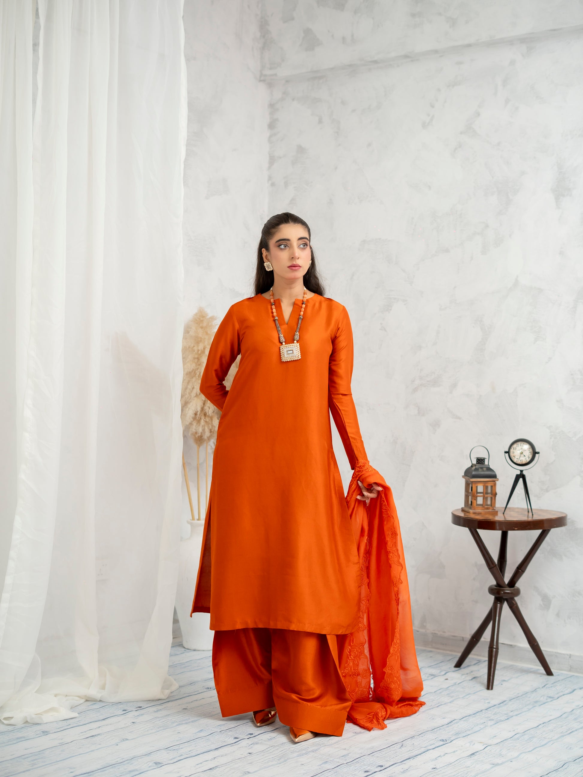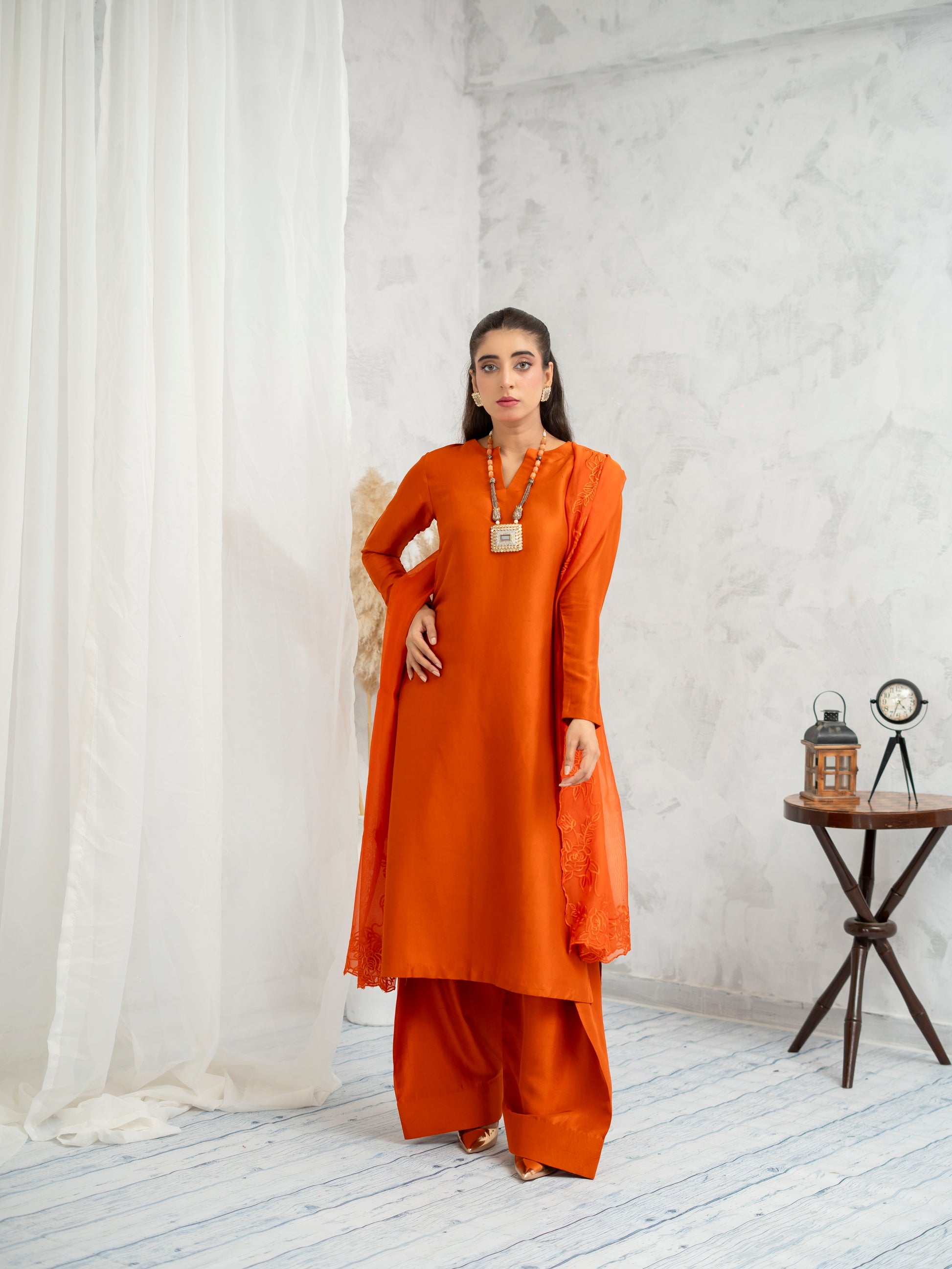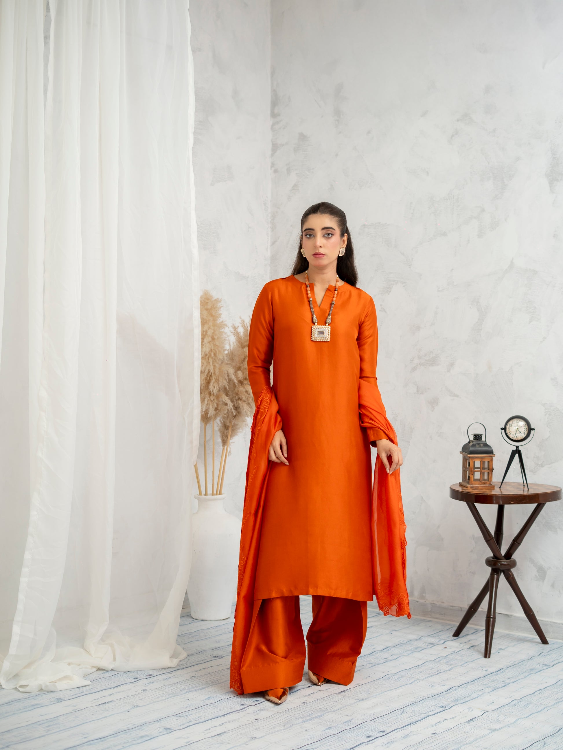 Ignite your presence in Sunset Flame — a striking ensemble in deep amber orange that mirrors the warmth of a golden hour. Cut in a clean silhouette with wide-leg trousers and flared sleeves, the design evokes modern tradition. The accompanying dupatta with subtle detailing adds depth, while the rich tone breathes energy into every movement. A perfect blend of power and elegance for festive gatherings.