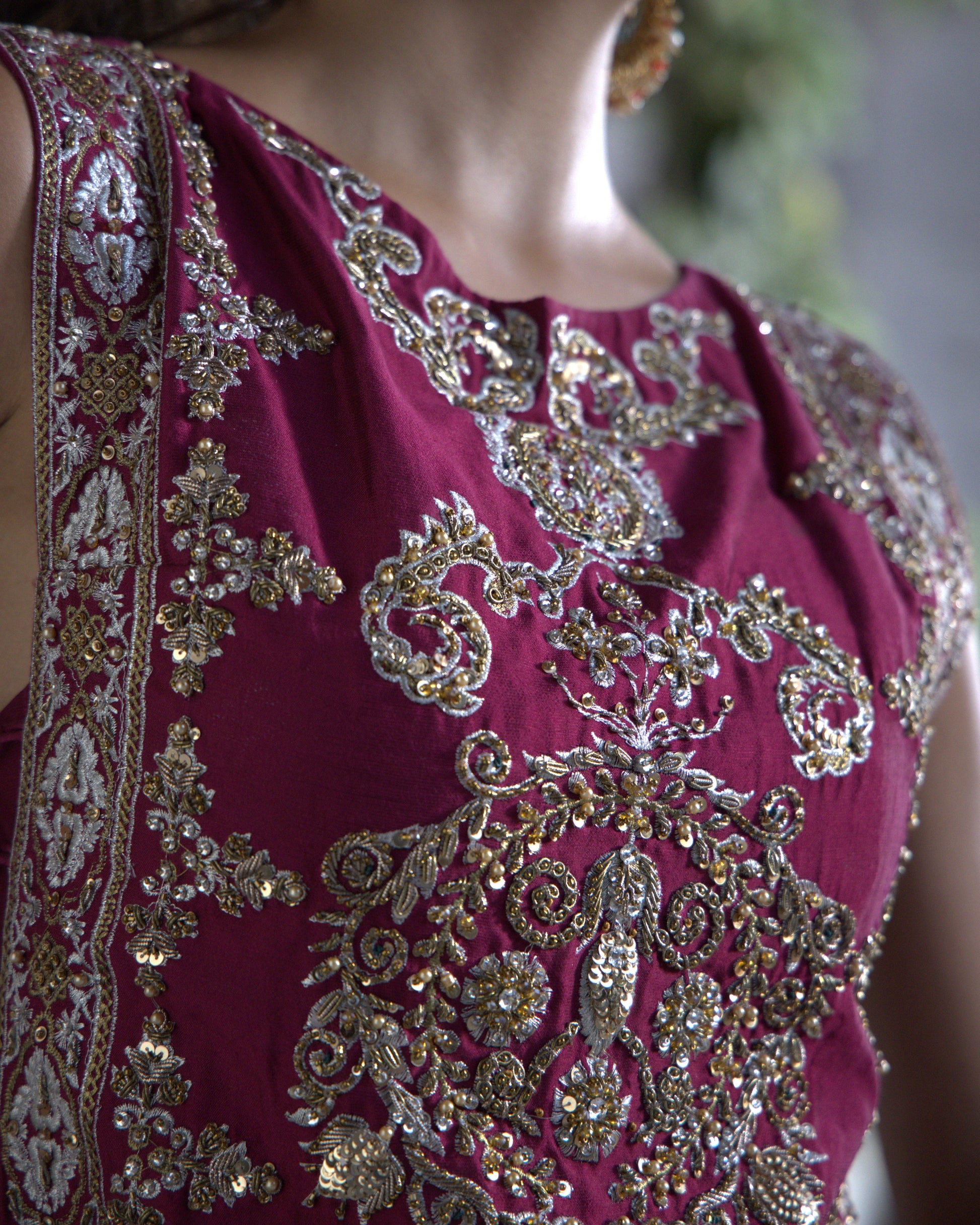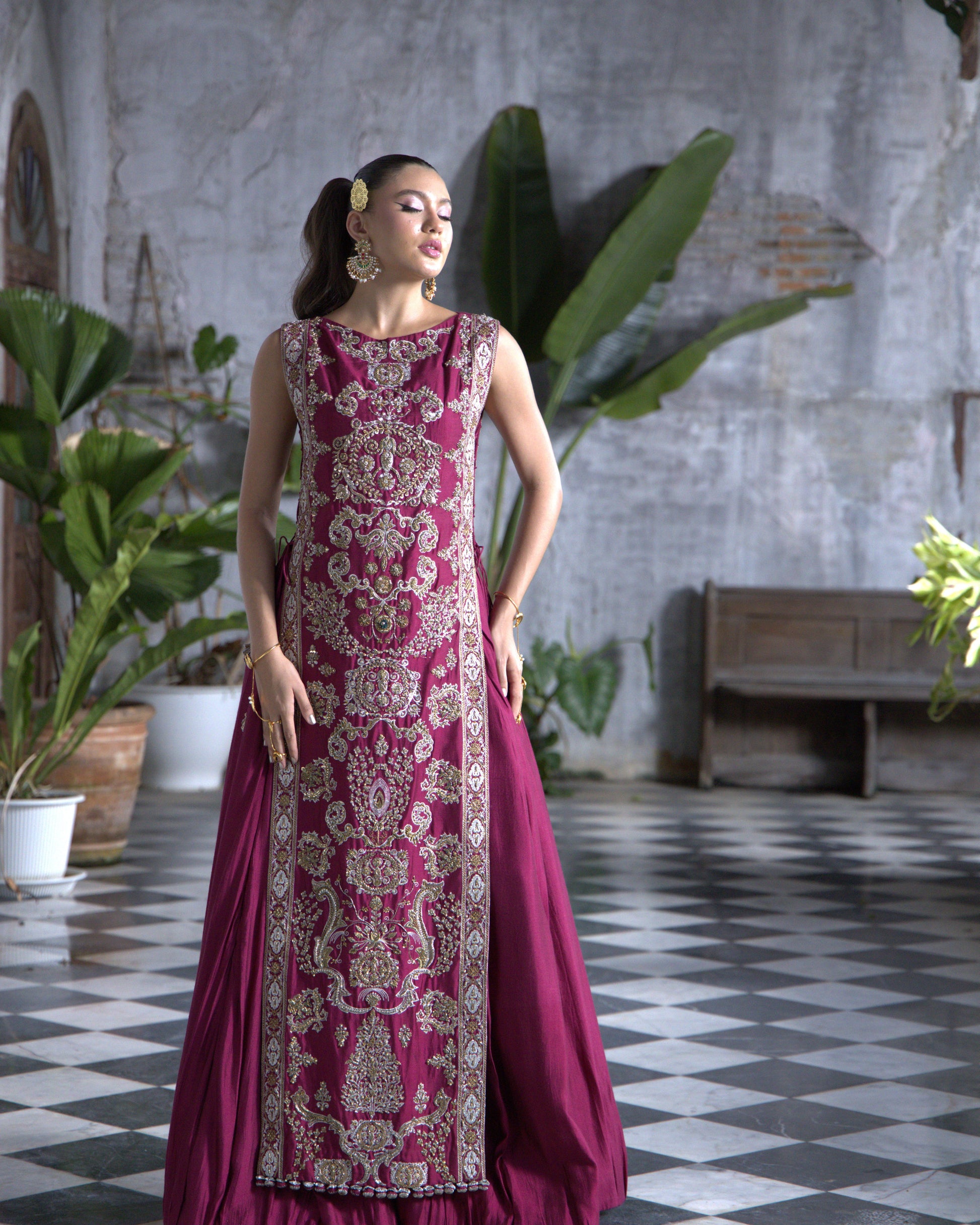 A vision in berry pink, this premium silk long panel shirt is exquisitely adorned with zari embroidery and zardozi handwork. An ode to tradition and artistry, crafted to celebrate the grandeur of a bride’s timeless journey.
