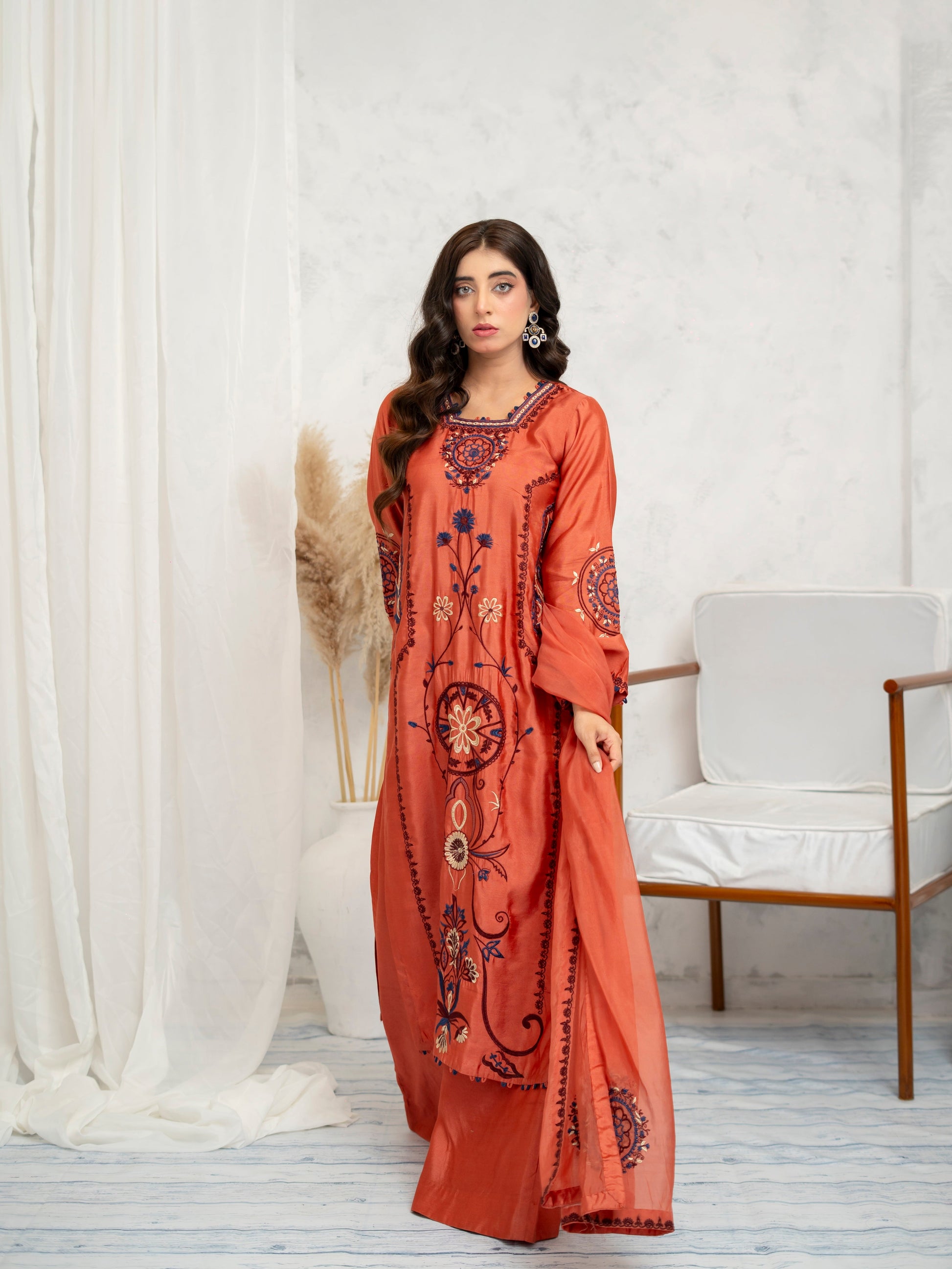 Tangerine Heritage is a celebration of bold tradition and artistry. The kurta bursts with intricate navy and maroon embroidery set against a radiant burnt-orange base, creating a stunning contrast. Ornamental patterns adorn the front and sleeves, while the matching dupatta reflects the same regal energy. A vibrant ensemble for the modern woman rooted in legacy and style