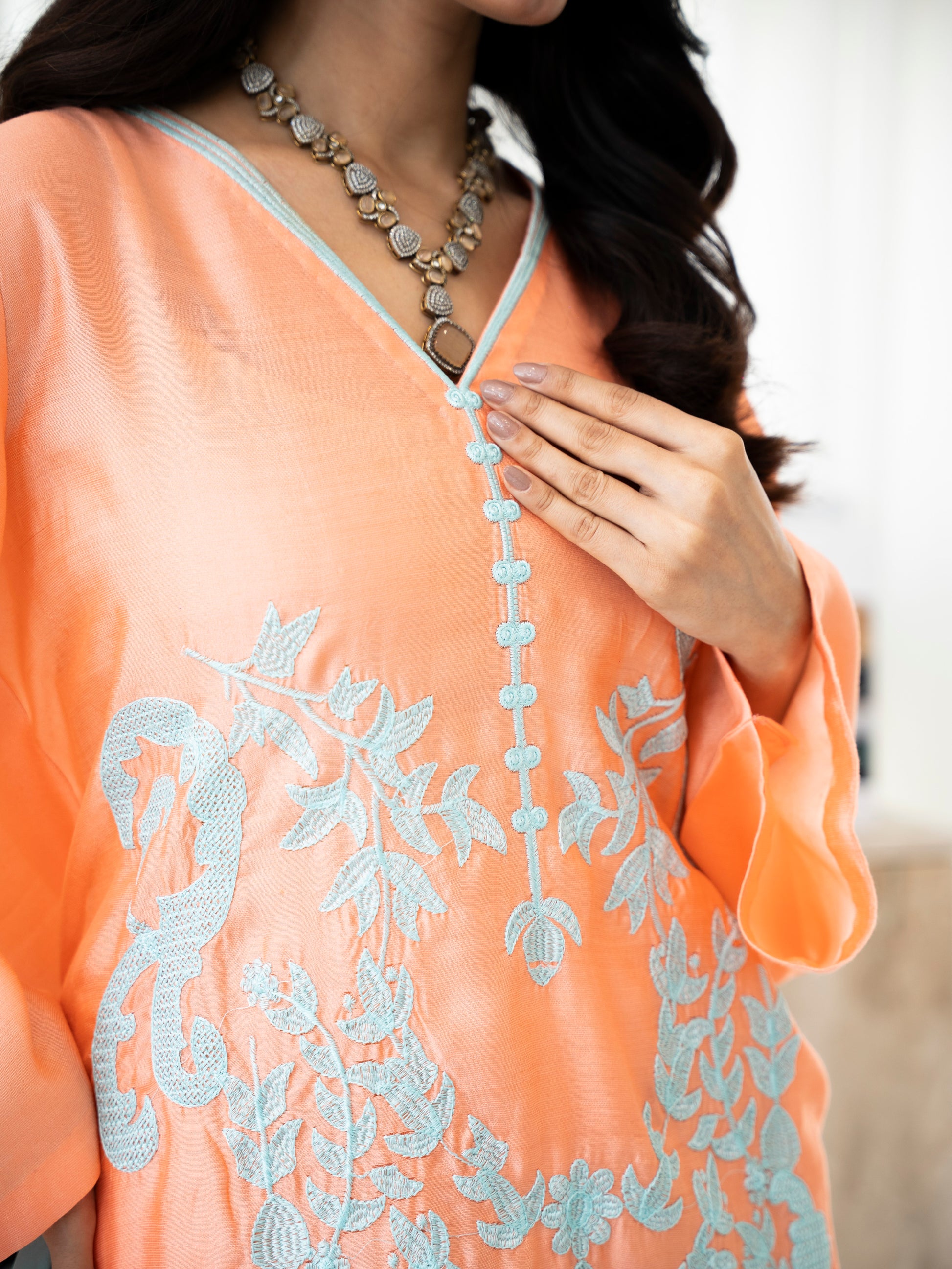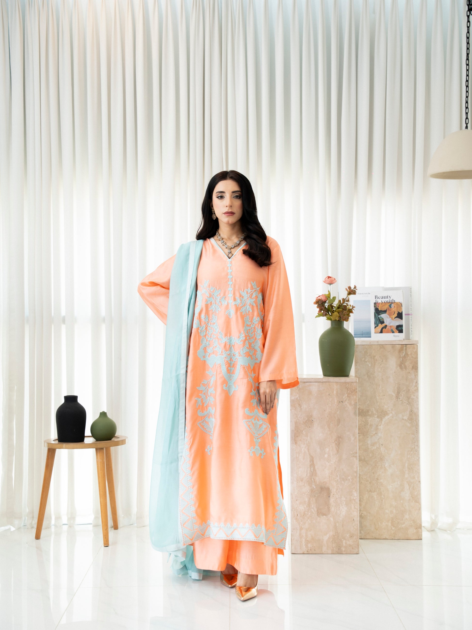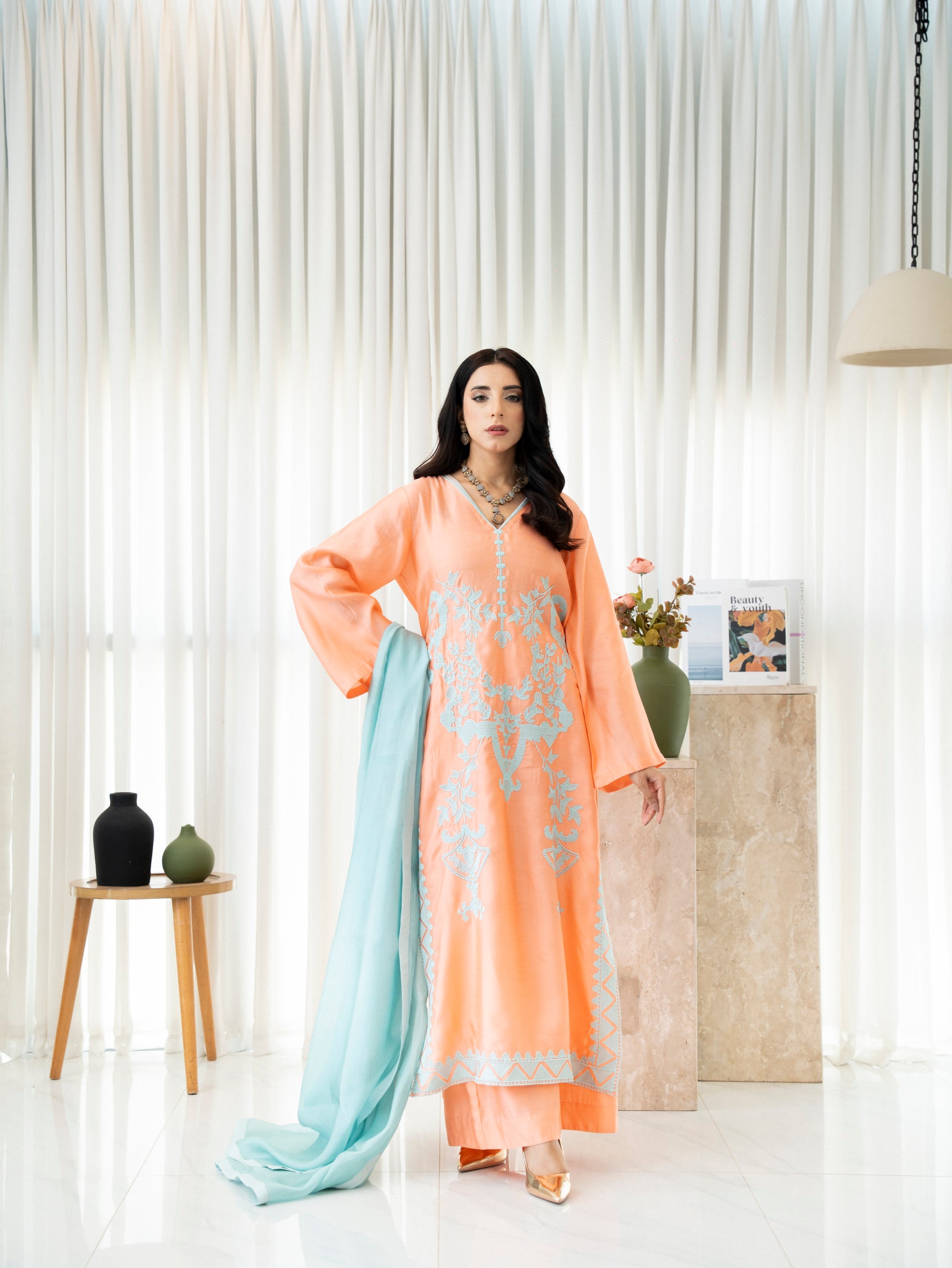 Tangerine Mist brings together the warmth of a soft tangerine canvas and the breezy coolness of aqua embroidery and an ethereal organza dupatta. Crafted from premium silk, this 3-piece ensemble is a fresh expression of summer luxury—light, luminous, and effortlessly graceful. Ideal for festive brunches or daytime celebrations under the sun.