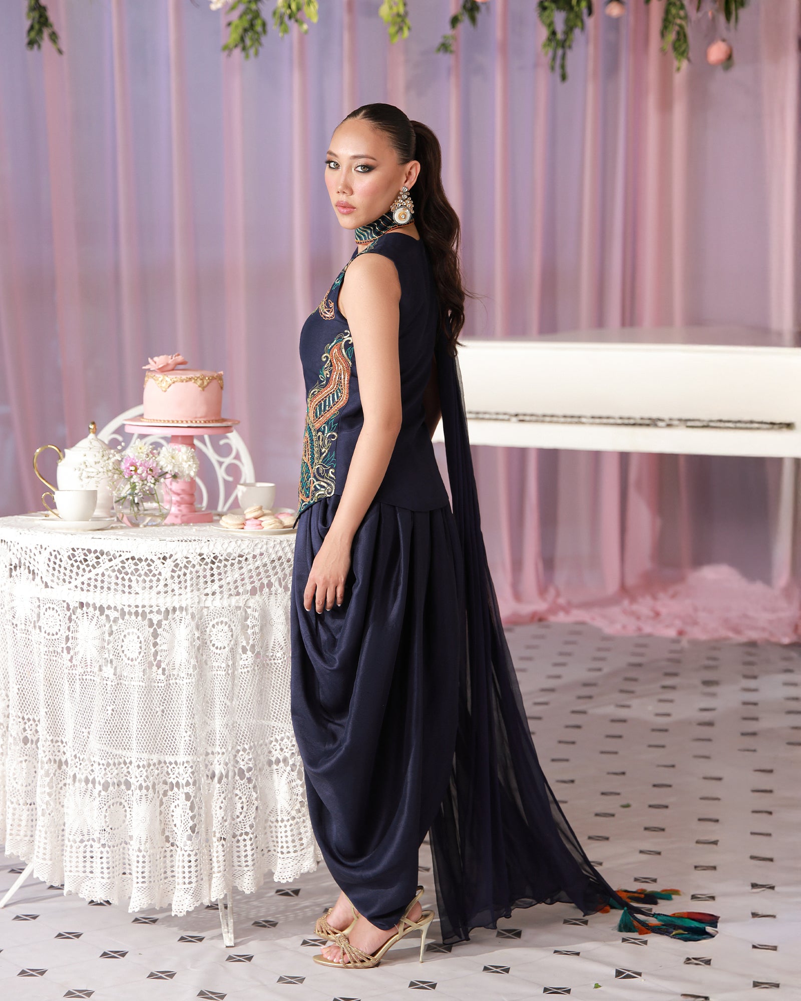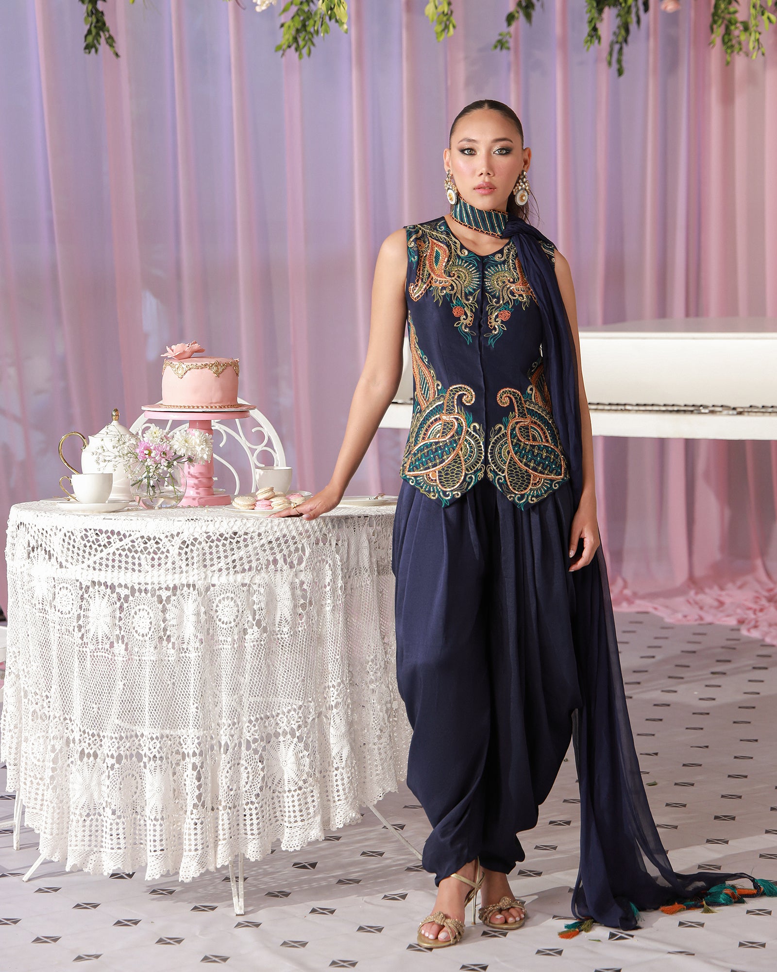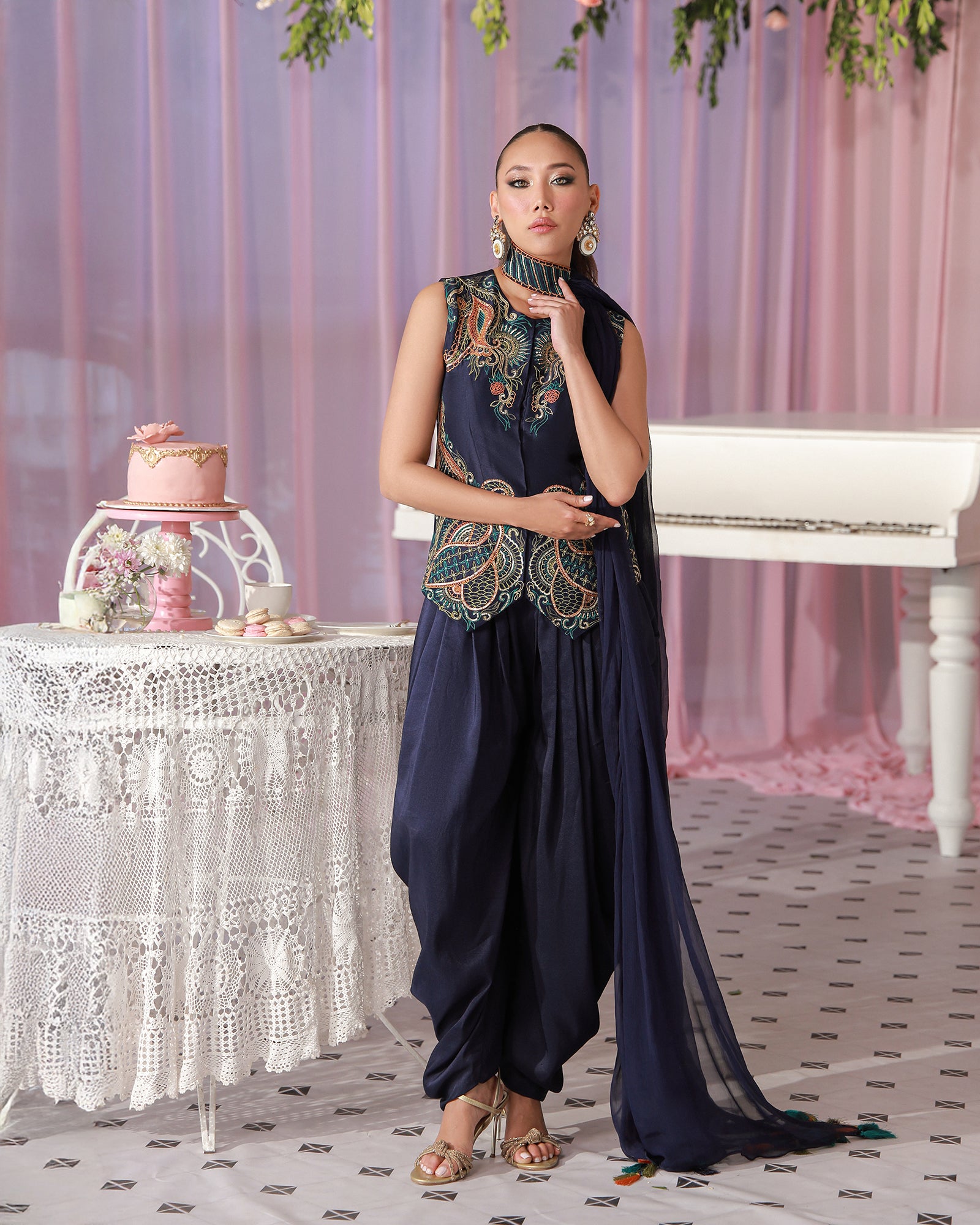Crafted from pure raw silk in a deep navy hue, Vayra embodies bold sophistication and refined artistry. The intricate embroidered jacket and fluid drape pants create a seamless fusion of elegance and power, reflecting contemporary couture with timeless allure.