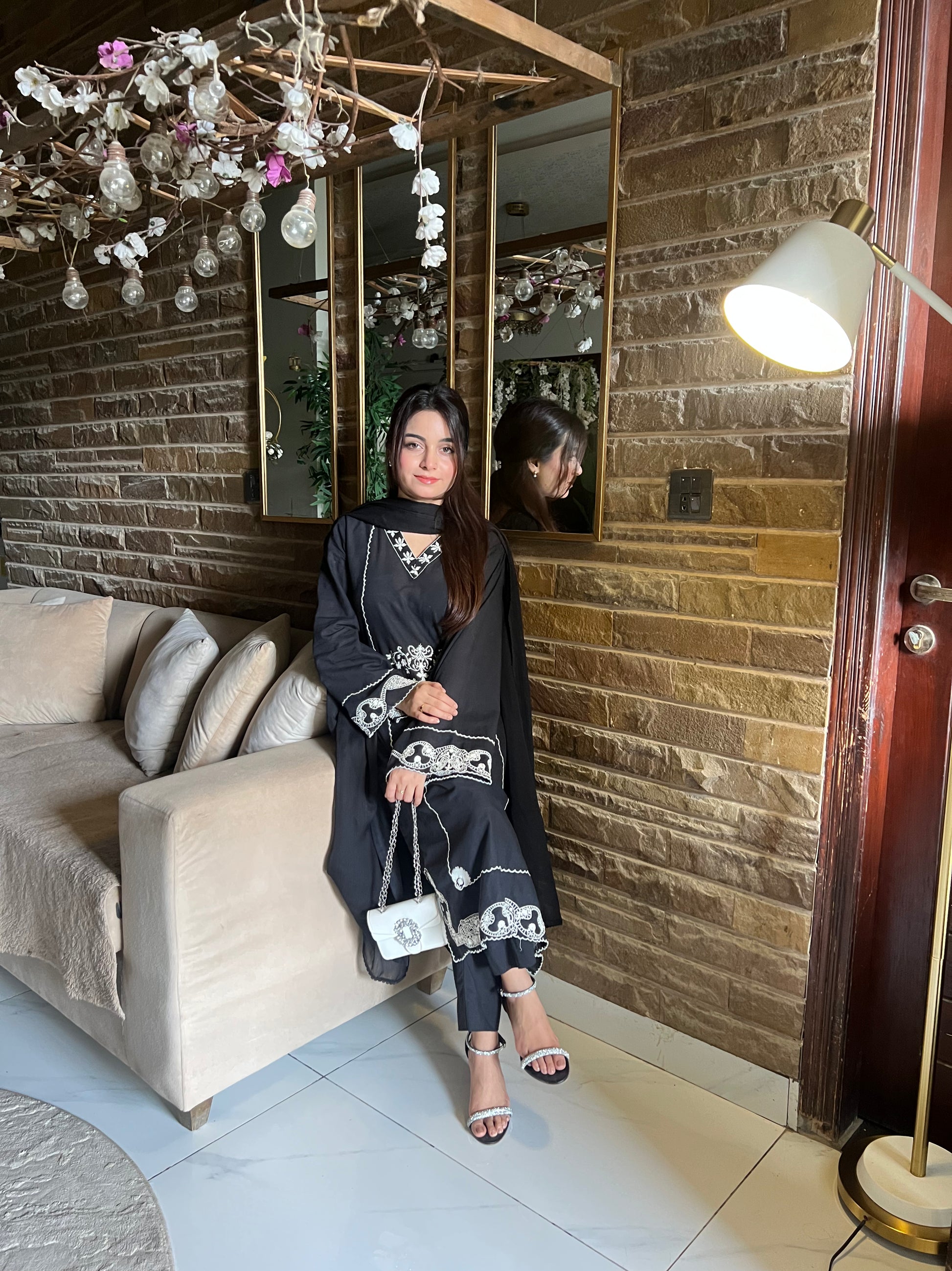 Classic black canvas adorned with fine ivory embroidery — this minimal yet striking ensemble balances timeless style with everyday wearability.
