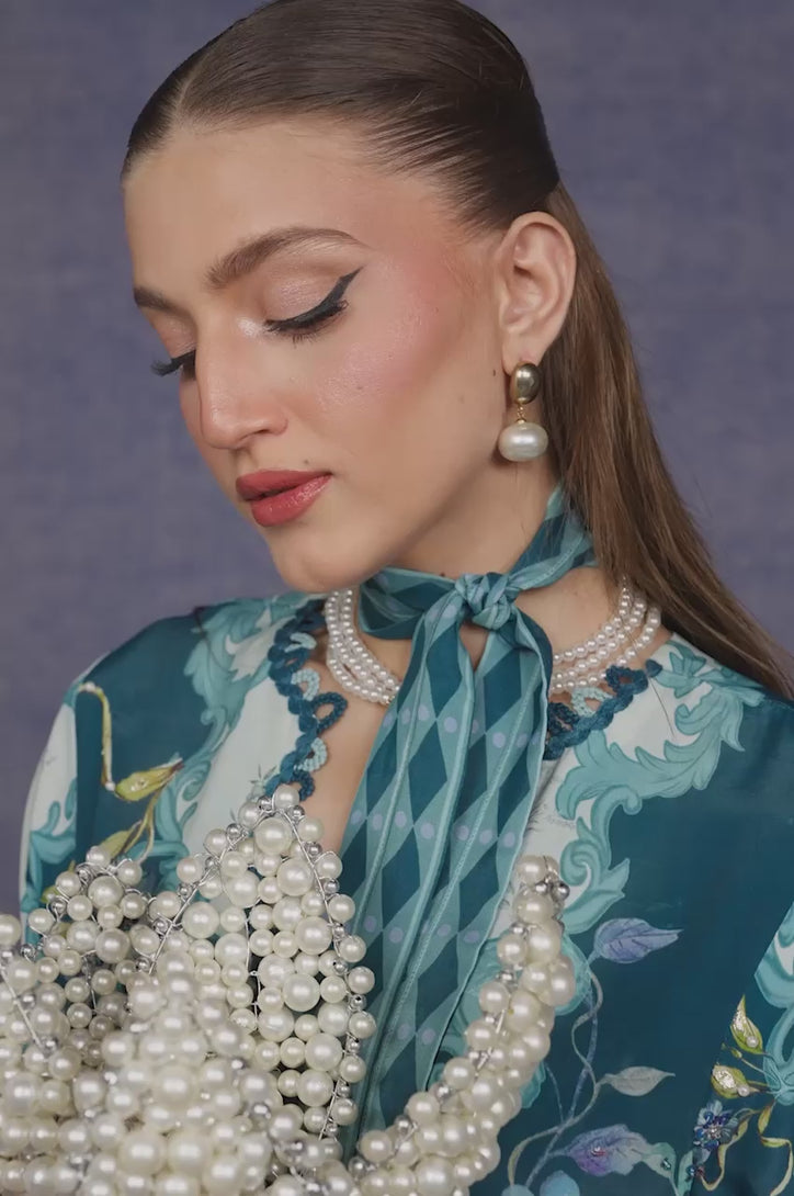A fluid teal kaftan adorned with intricate floral motifs and a soft neckline, Vera is designed for the woman who embodies grace with quiet confidence. The delicate print, flowing drape, and modern cut make it an effortless statement for Ramadan evenings and Eid elegance.