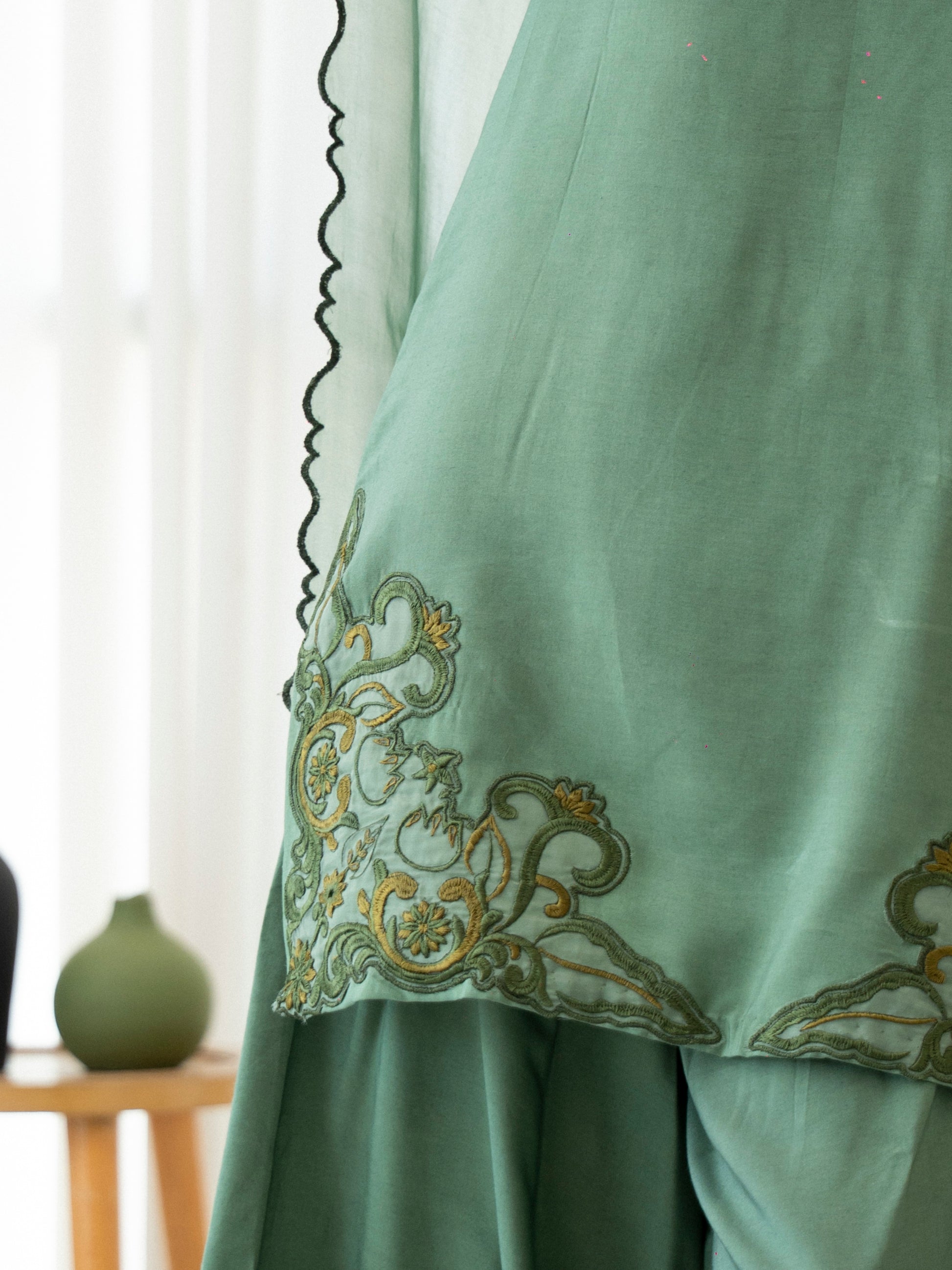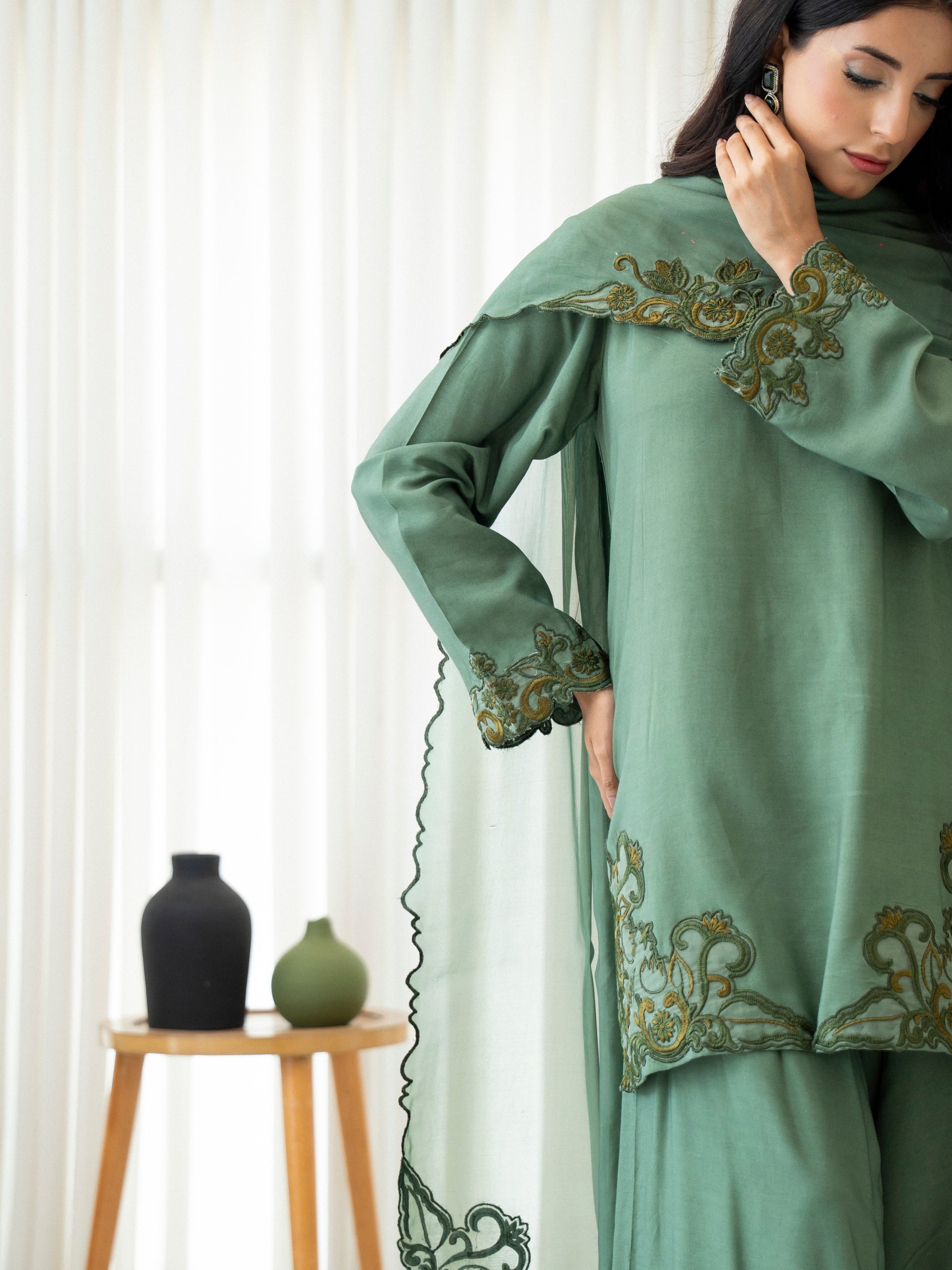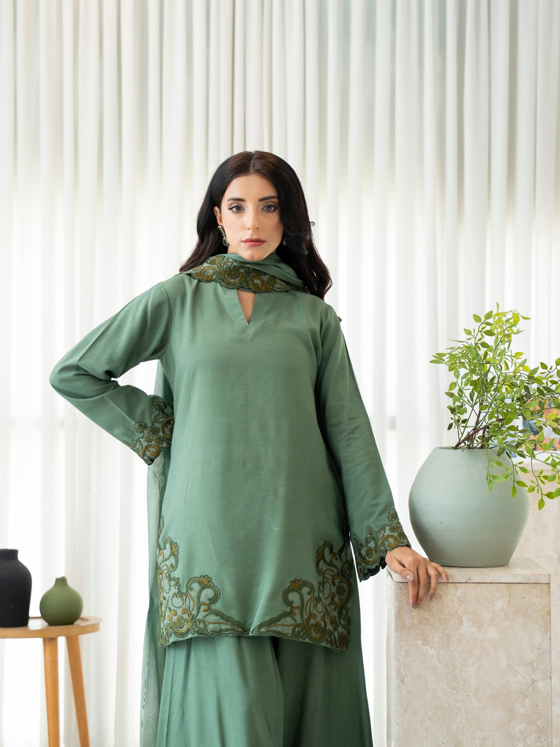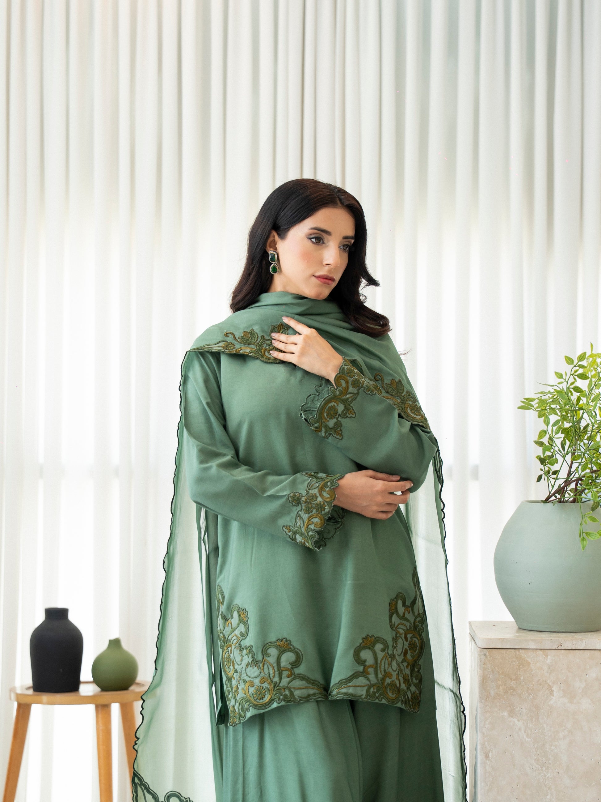 Verdant Bloom is a refreshing take on understated luxury. Rendered in a soft olive green hue with intricate moss-toned embroidery at the hem and cuffs, this 3-piece ensemble is crafted from premium silk and paired with a light-as-air pure organza dupatta. A graceful option for serene occasions, it blends comfort with timeless sophistication.