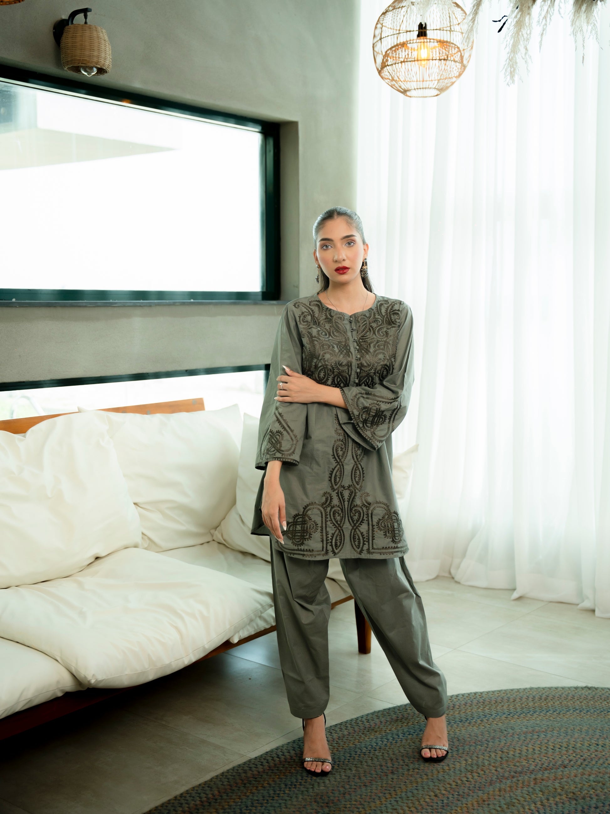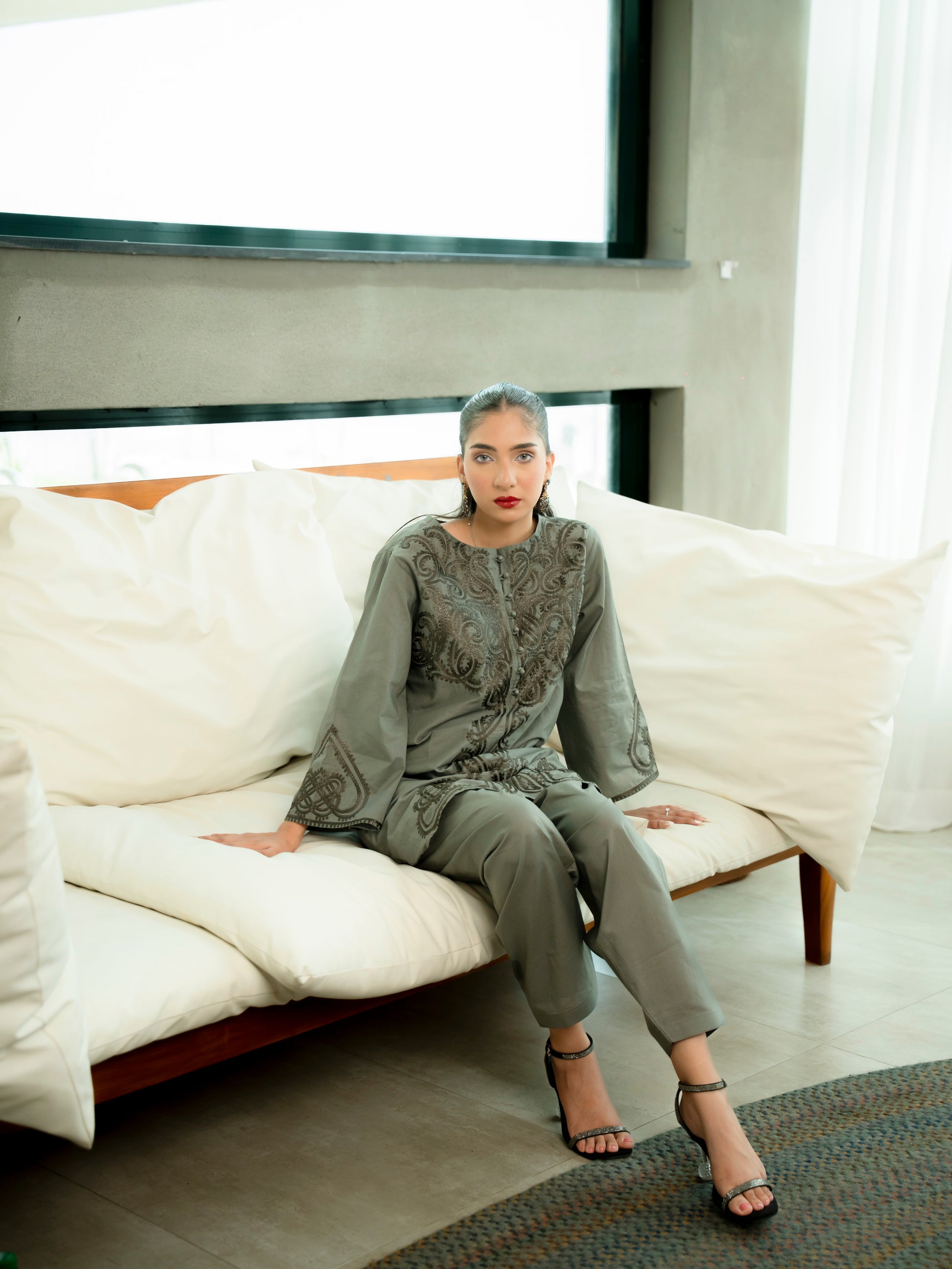 Zael is rooted in earthy elegance—a rich olive ensemble with intricate tonal embroidery that feels both grounded and grand. this look is a nod to tradition, reimagined for modern moments