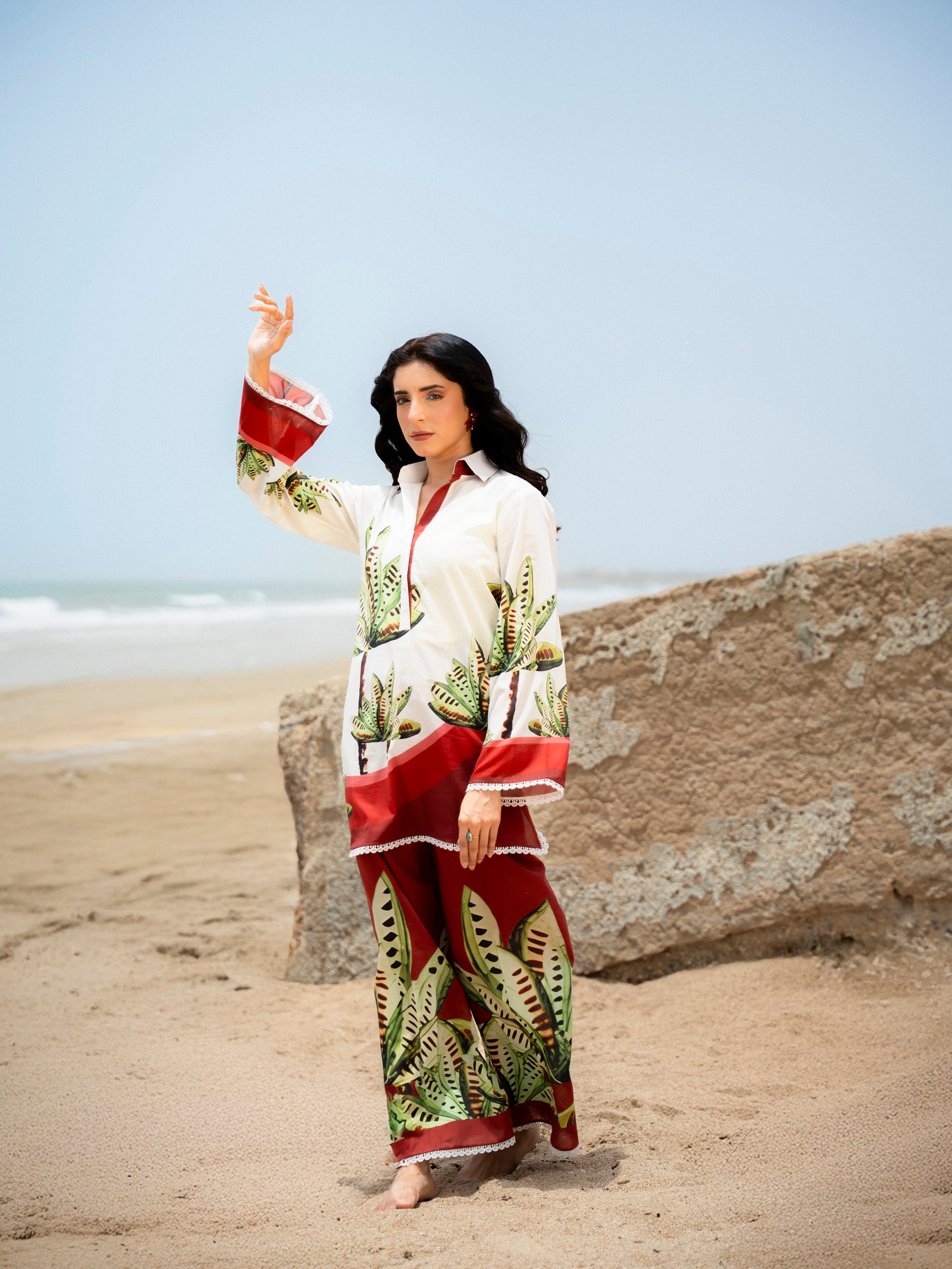 “zafra” is a breezy botanical dream, featuring lush leaf prints on a cream canvas with rich maroon accents. crafted for comfort with a straight silhouette and flared sleeves, this look brings tropical elegance to life. perfect for beach escapes or sunset soirées.