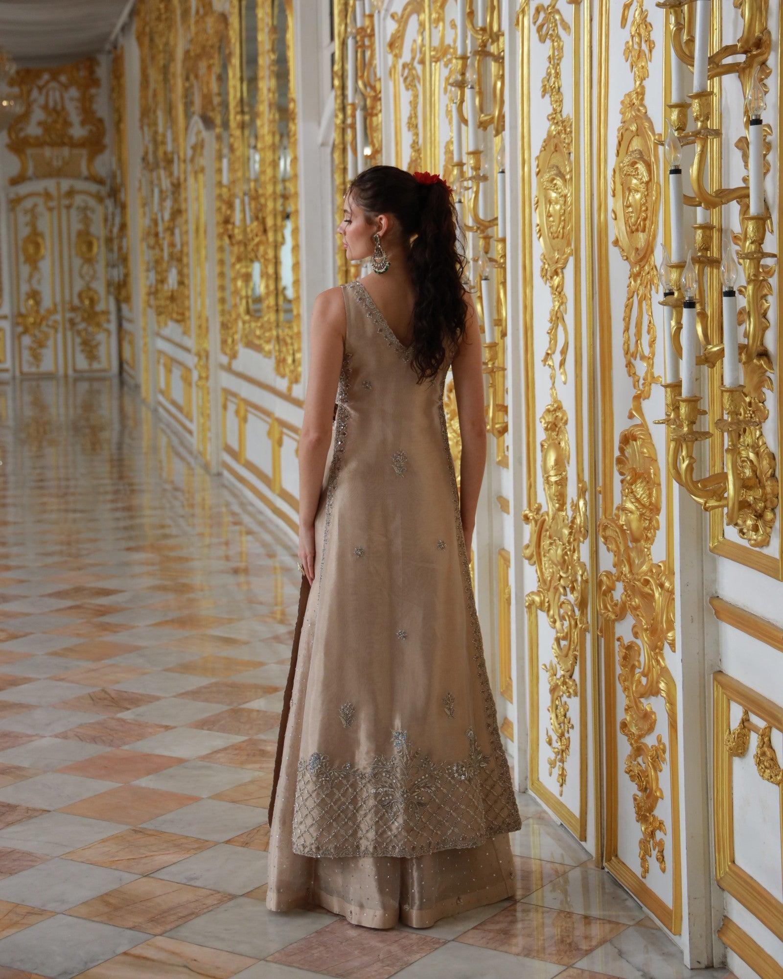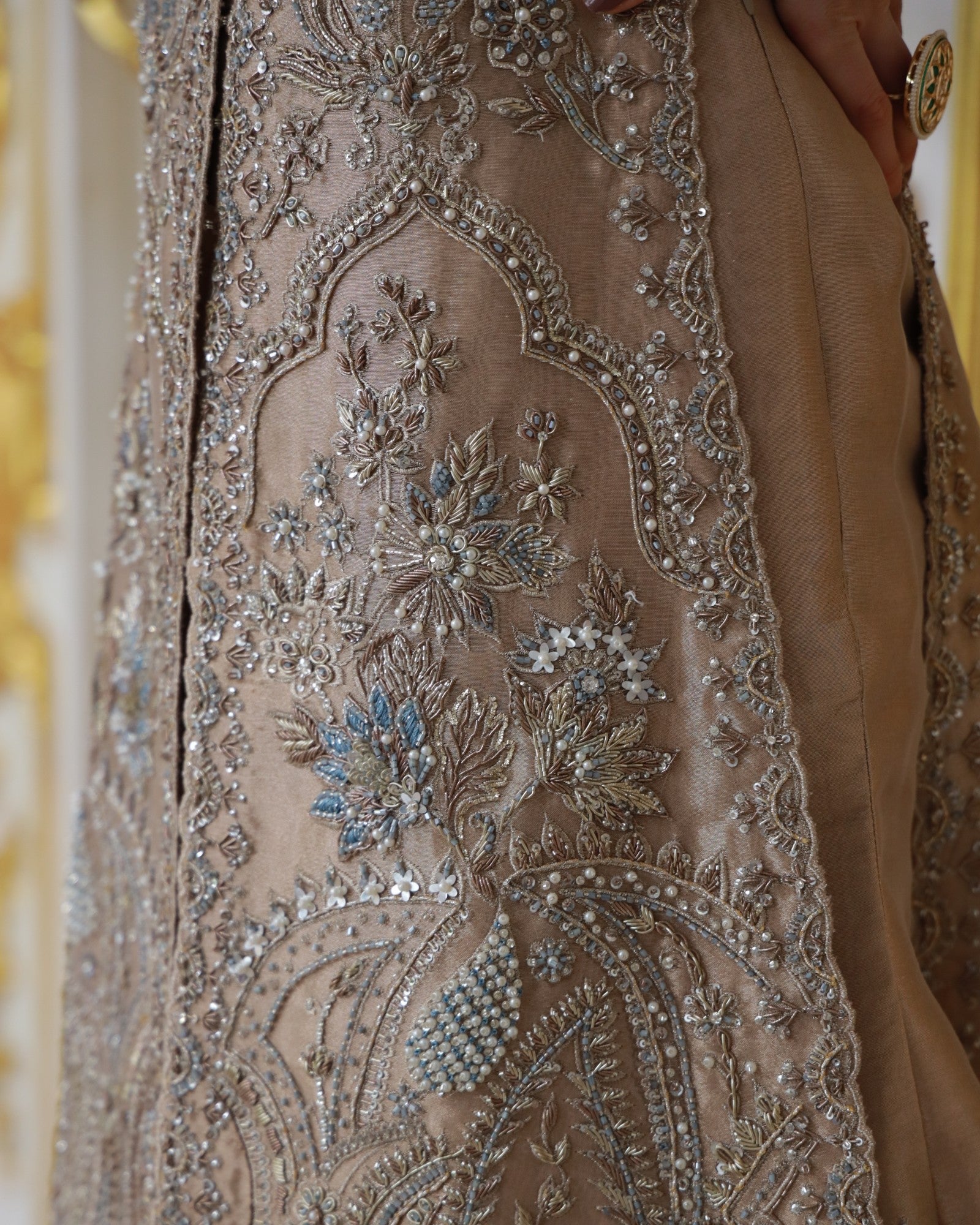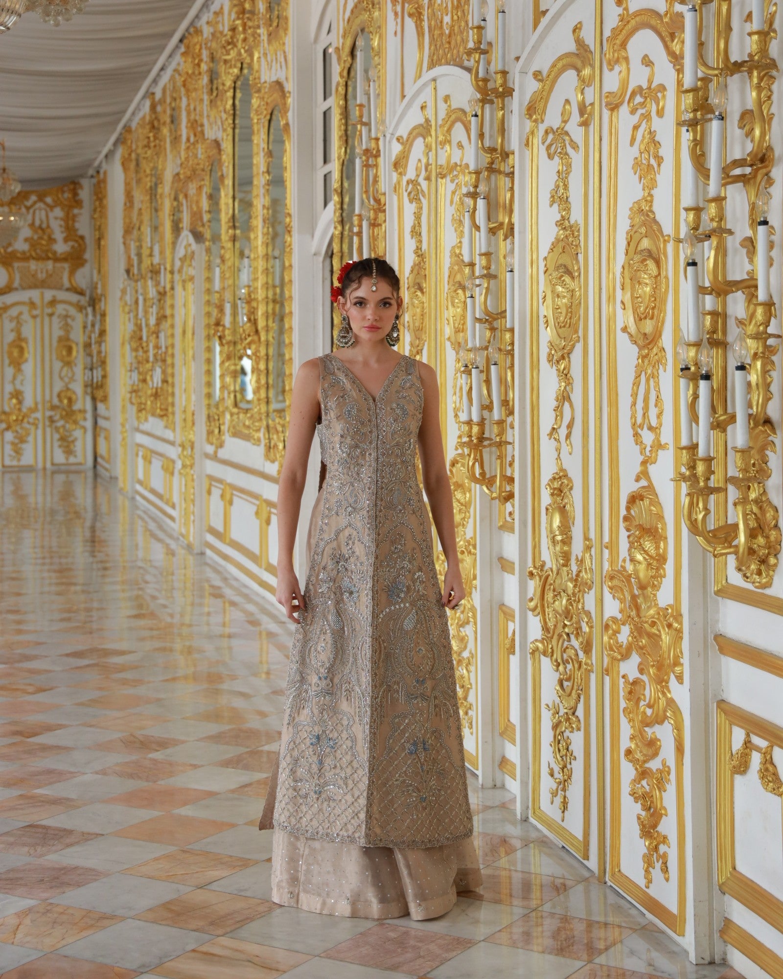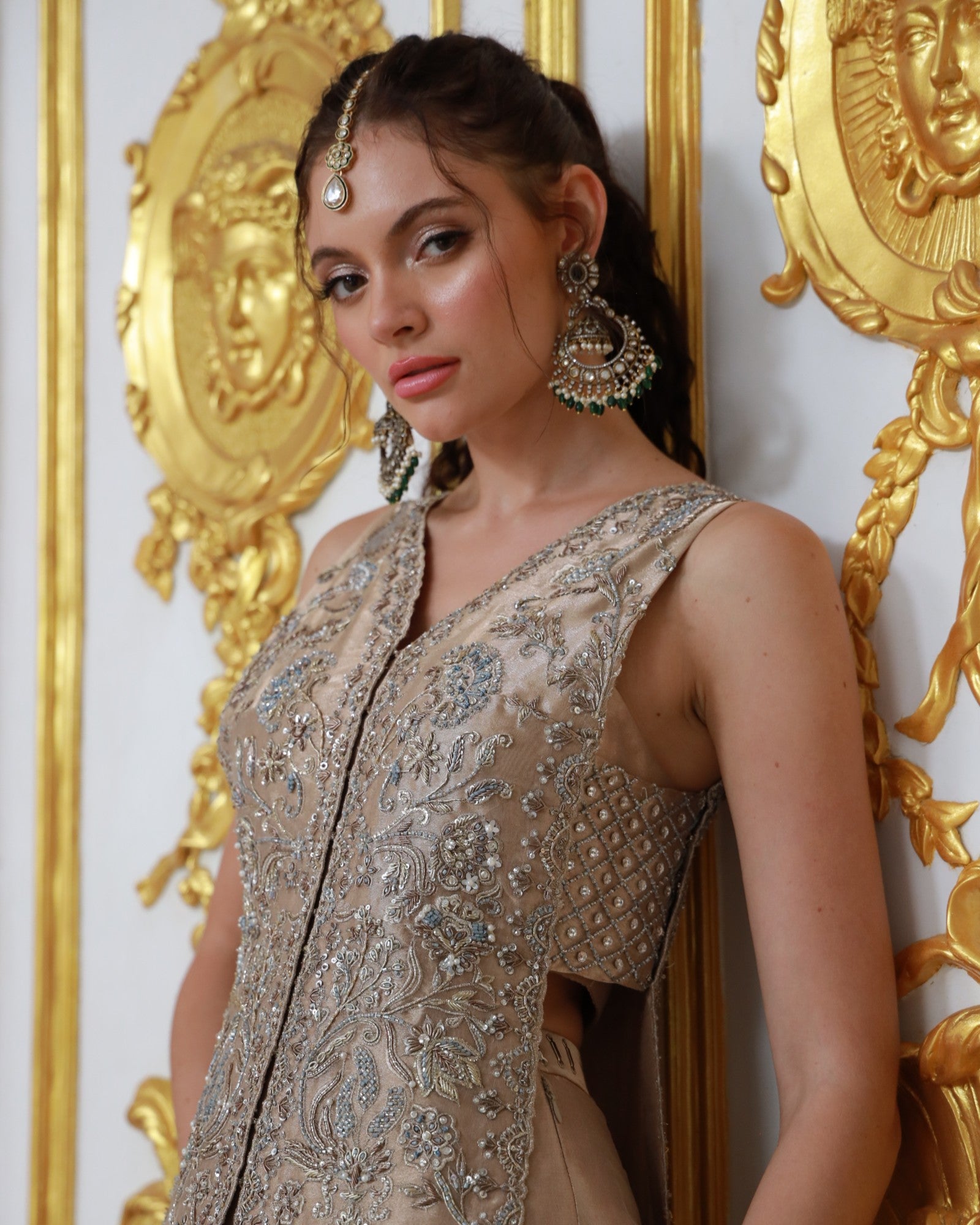 In lustrous gold lama, this sleeveless silhouette is meticulously hand-embroidered with delicate motifs in gold, silver, and pastel blue hues. A statement of sophistication and modern grace, tailored for weddings and grand occasions where tradition and refinement come together.