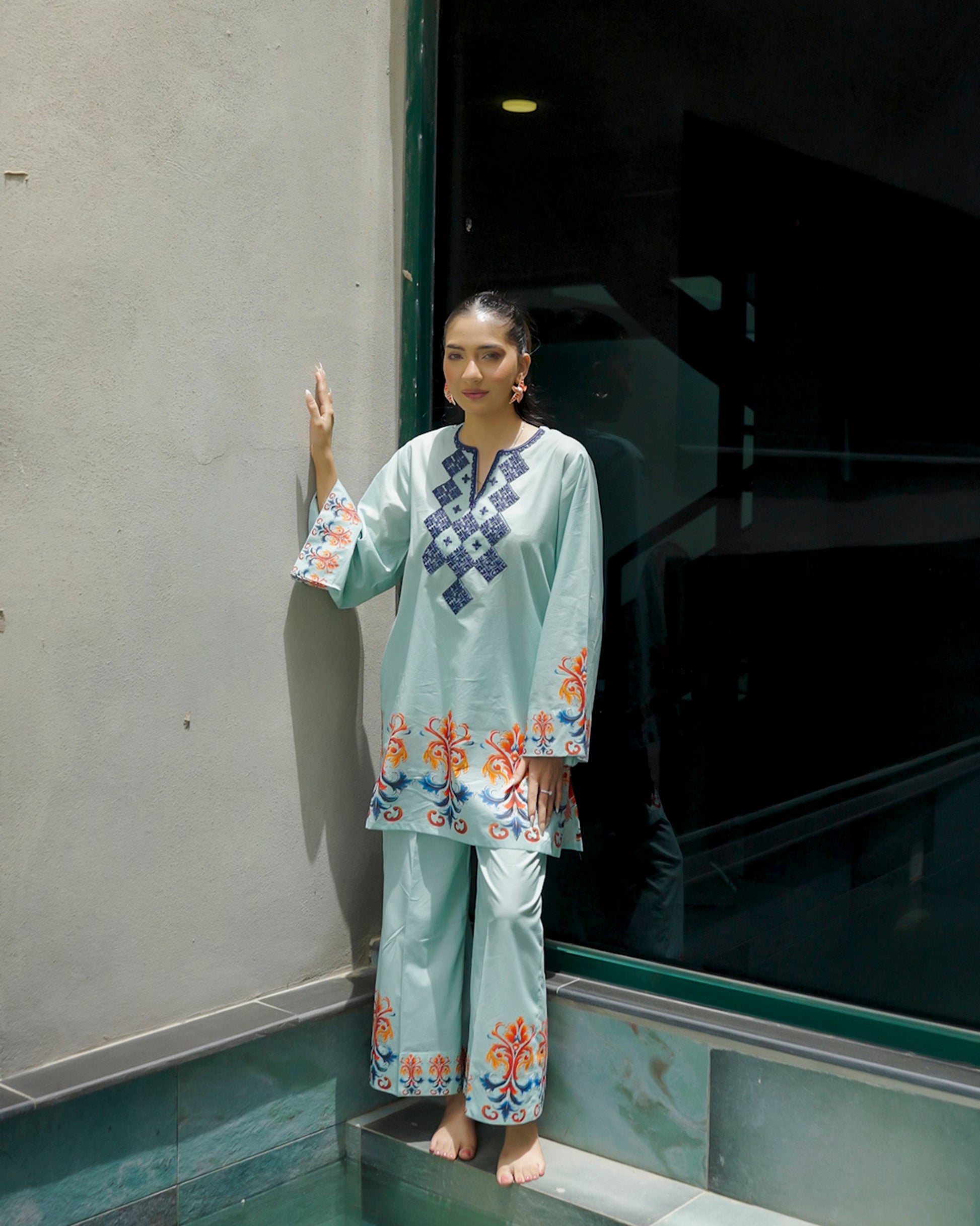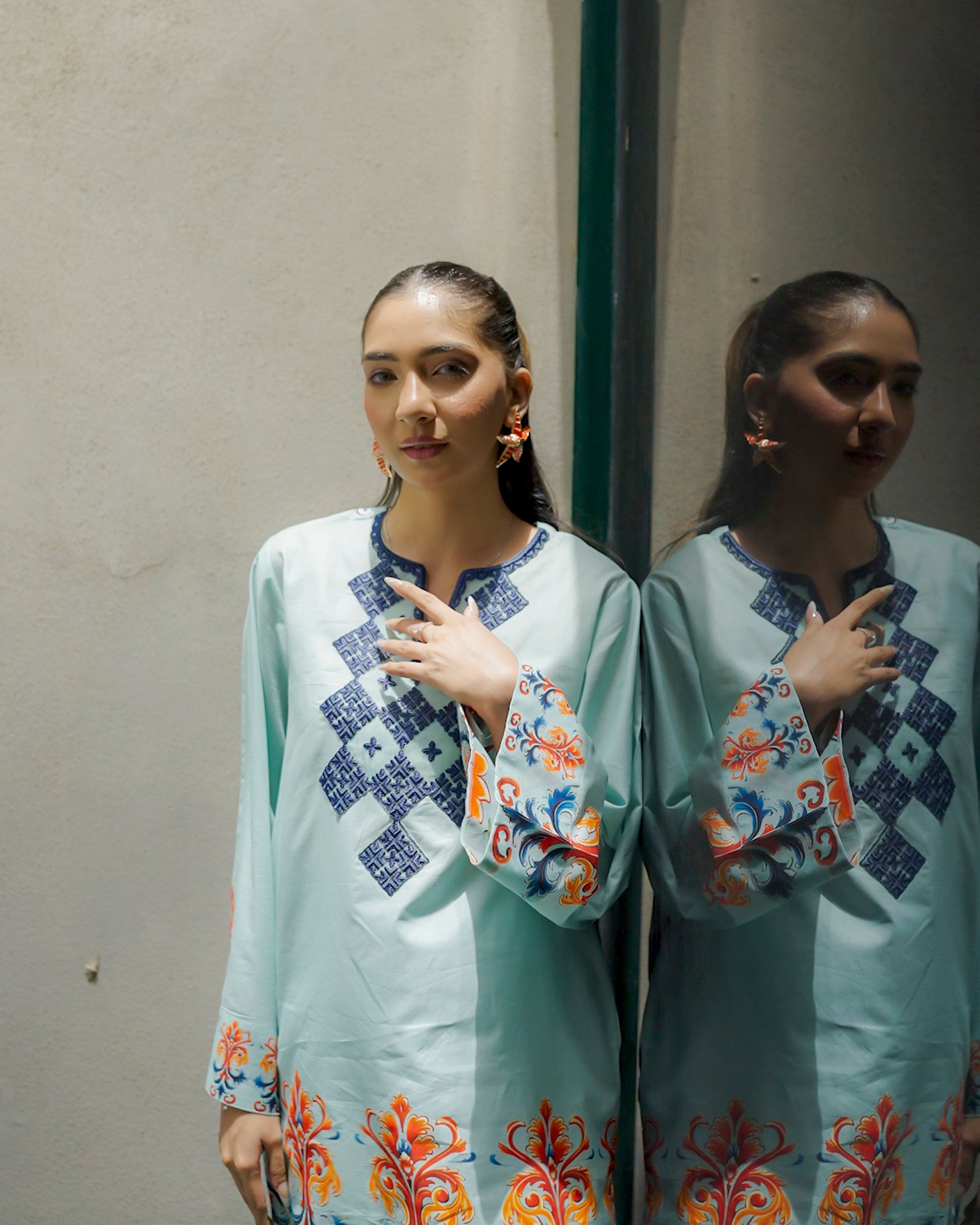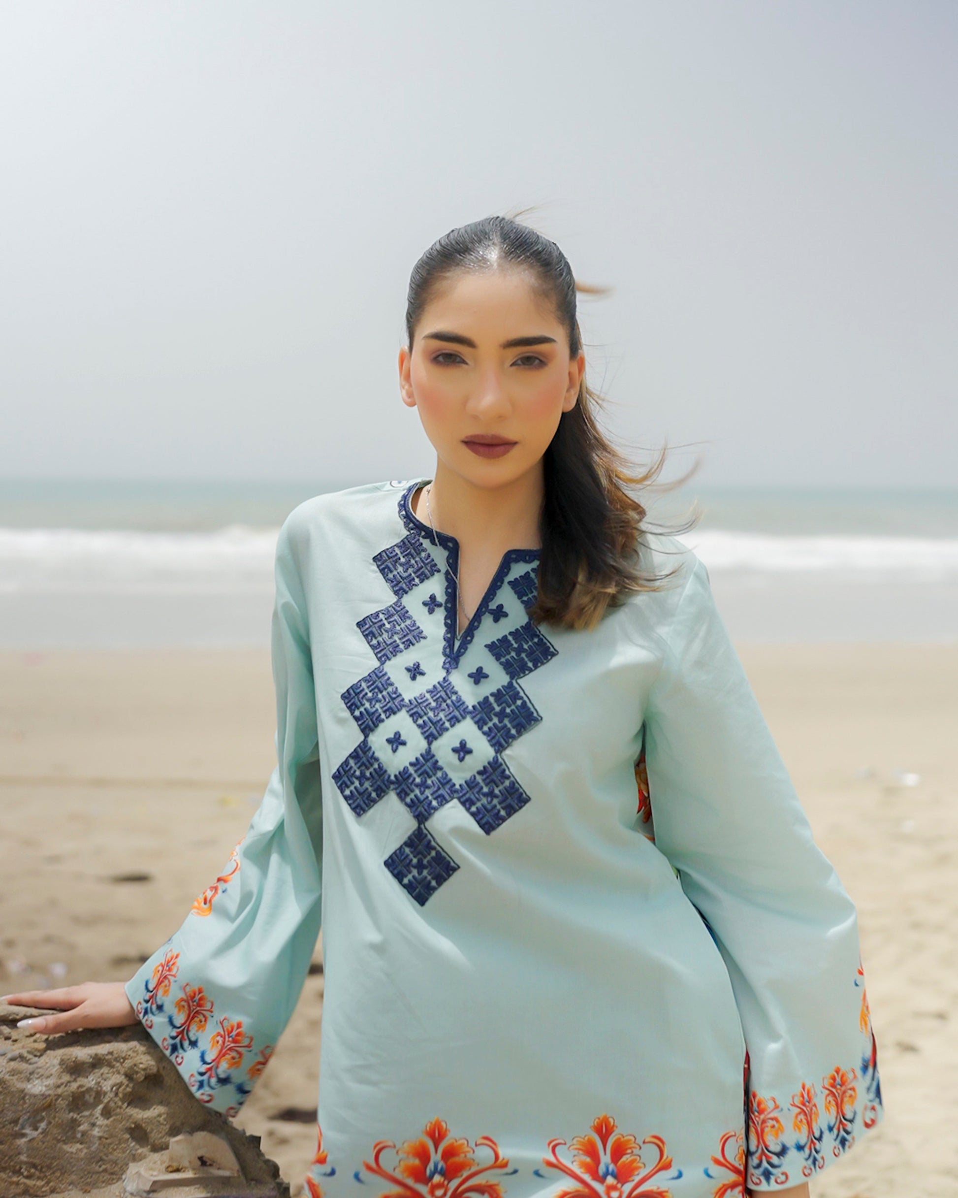 A fresh wave of tradition meets statement style in Zalea. Set in a serene aqua hue, this ensemble is adorned with geometric navy embroidery and lively floral bursts in coral and sapphire. A bold, confident look that celebrates cultural artistry with a radiant twist