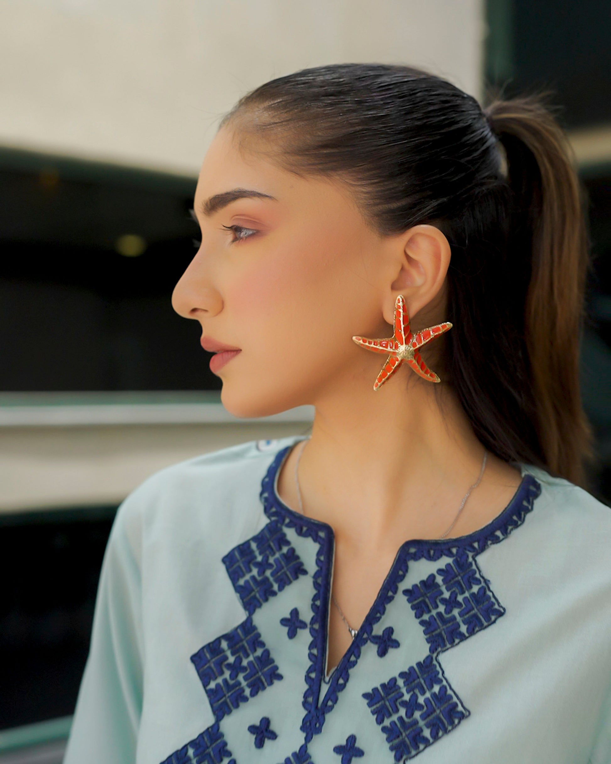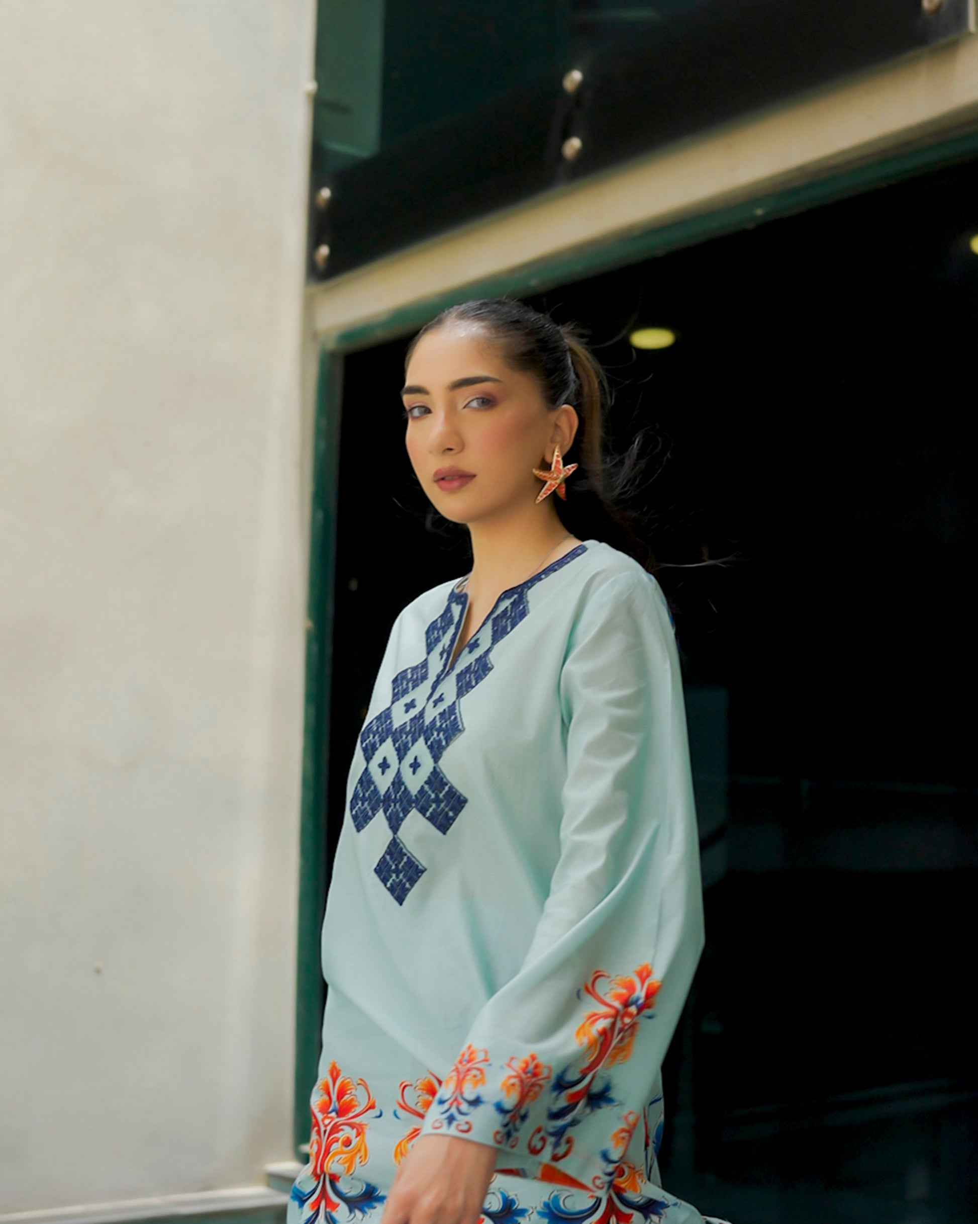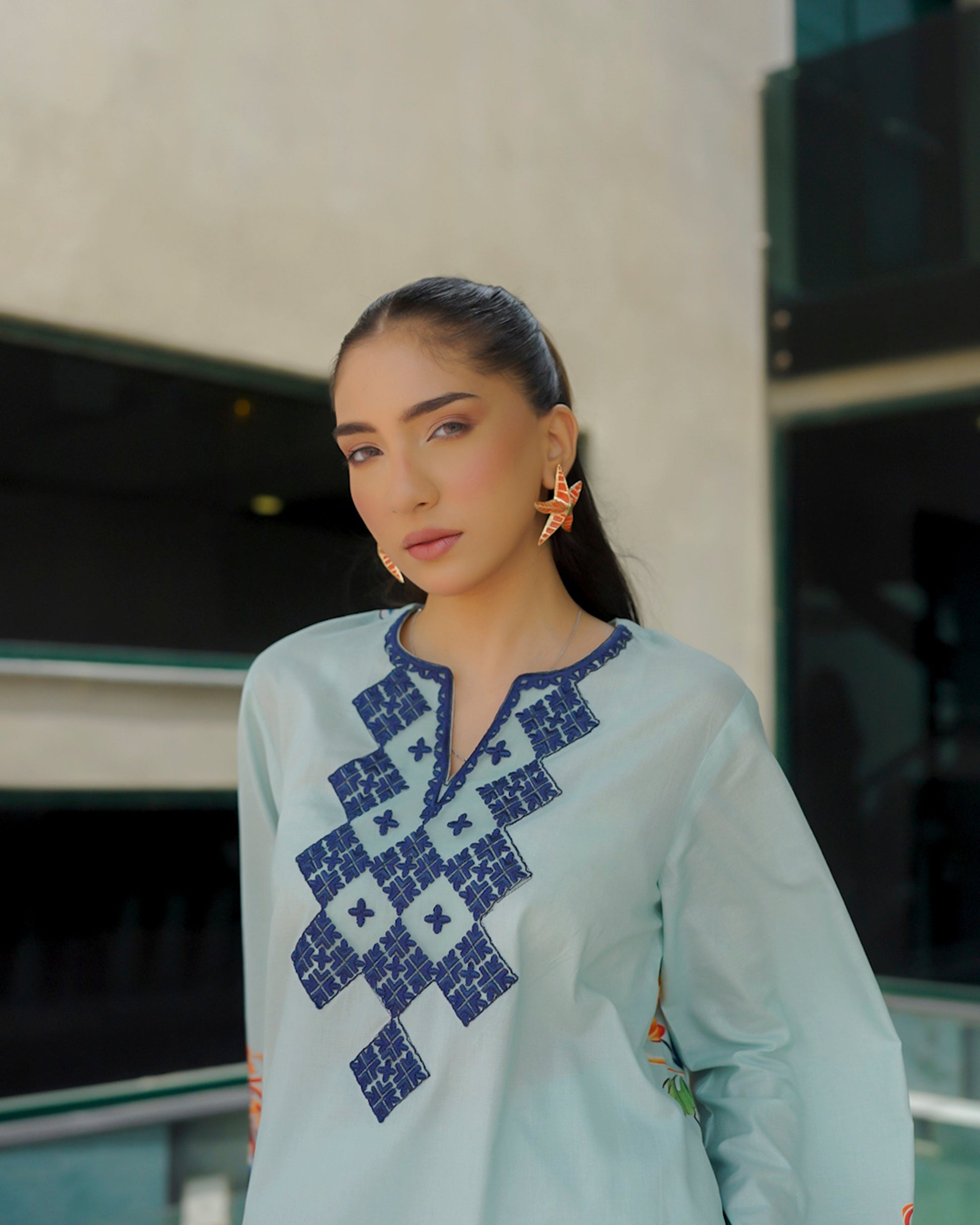 A fresh wave of tradition meets statement style in Zalea. Set in a serene aqua hue, this ensemble is adorned with geometric navy embroidery and lively floral bursts in coral and sapphire. A bold, confident look that celebrates cultural artistry with a radiant twist