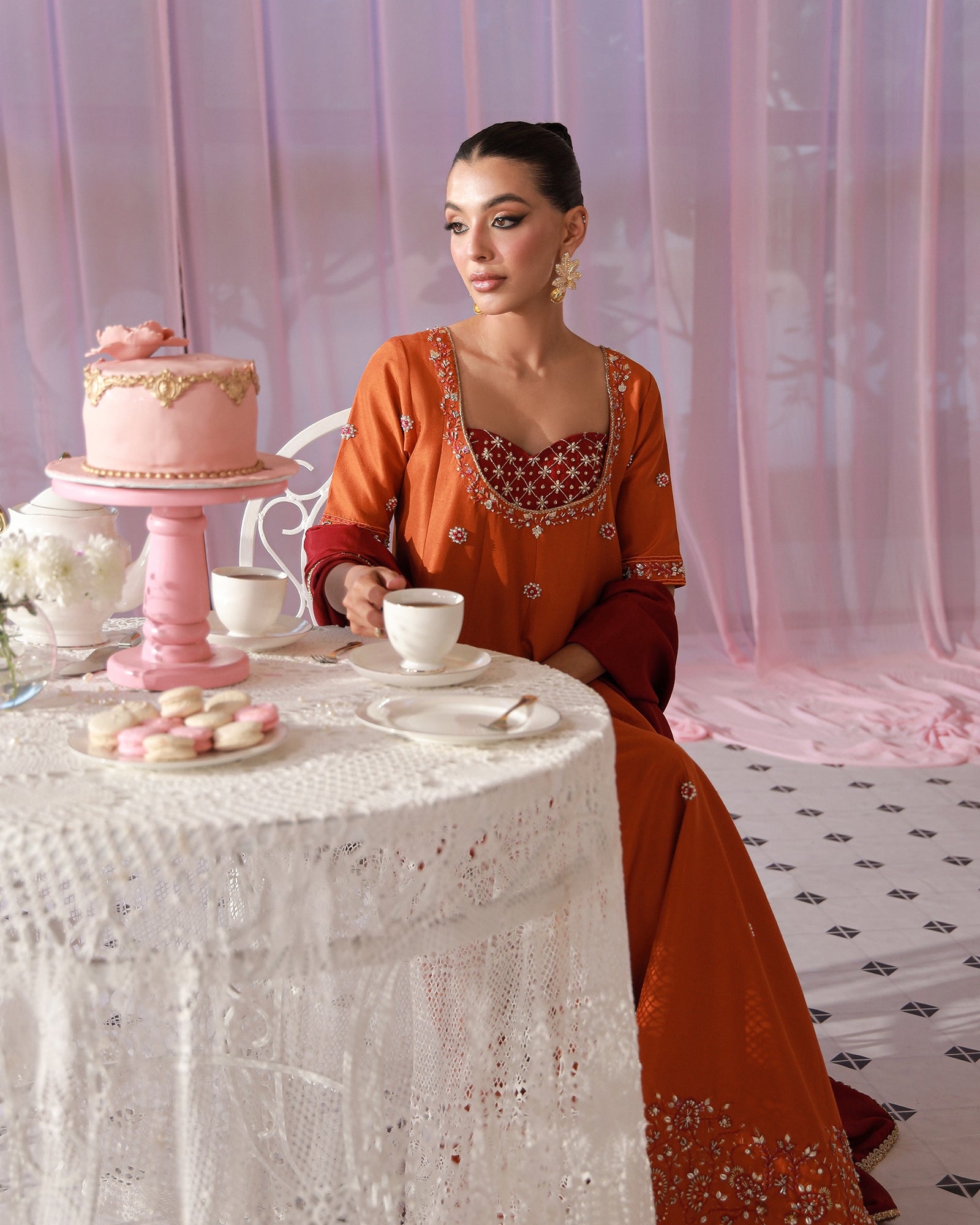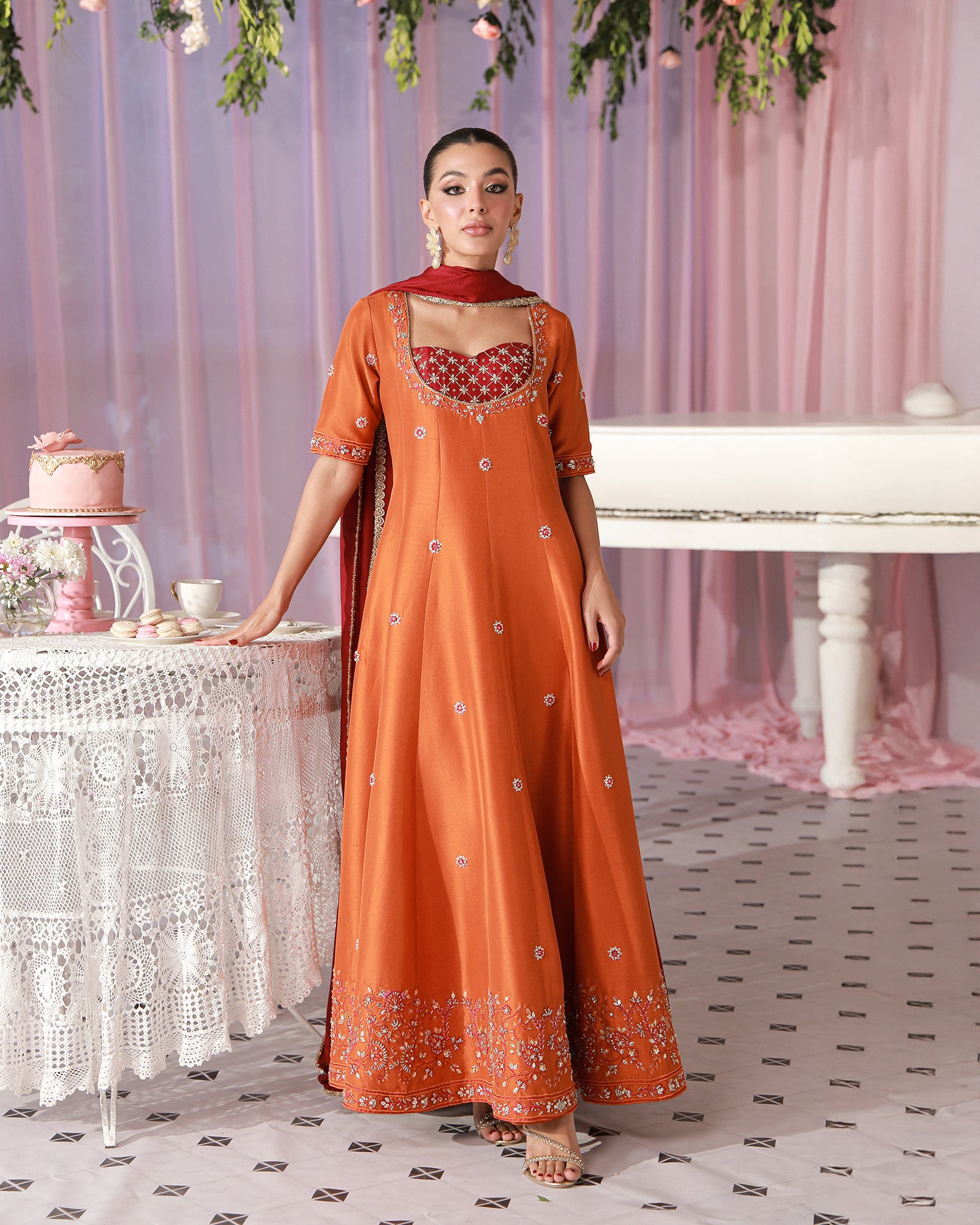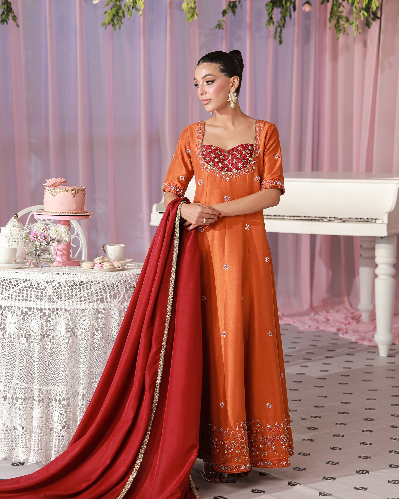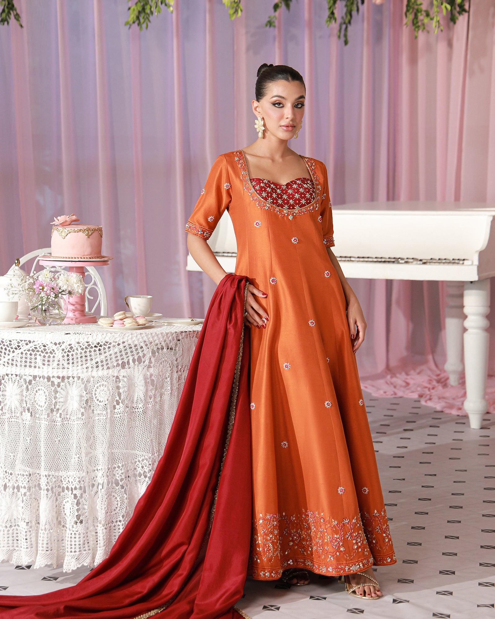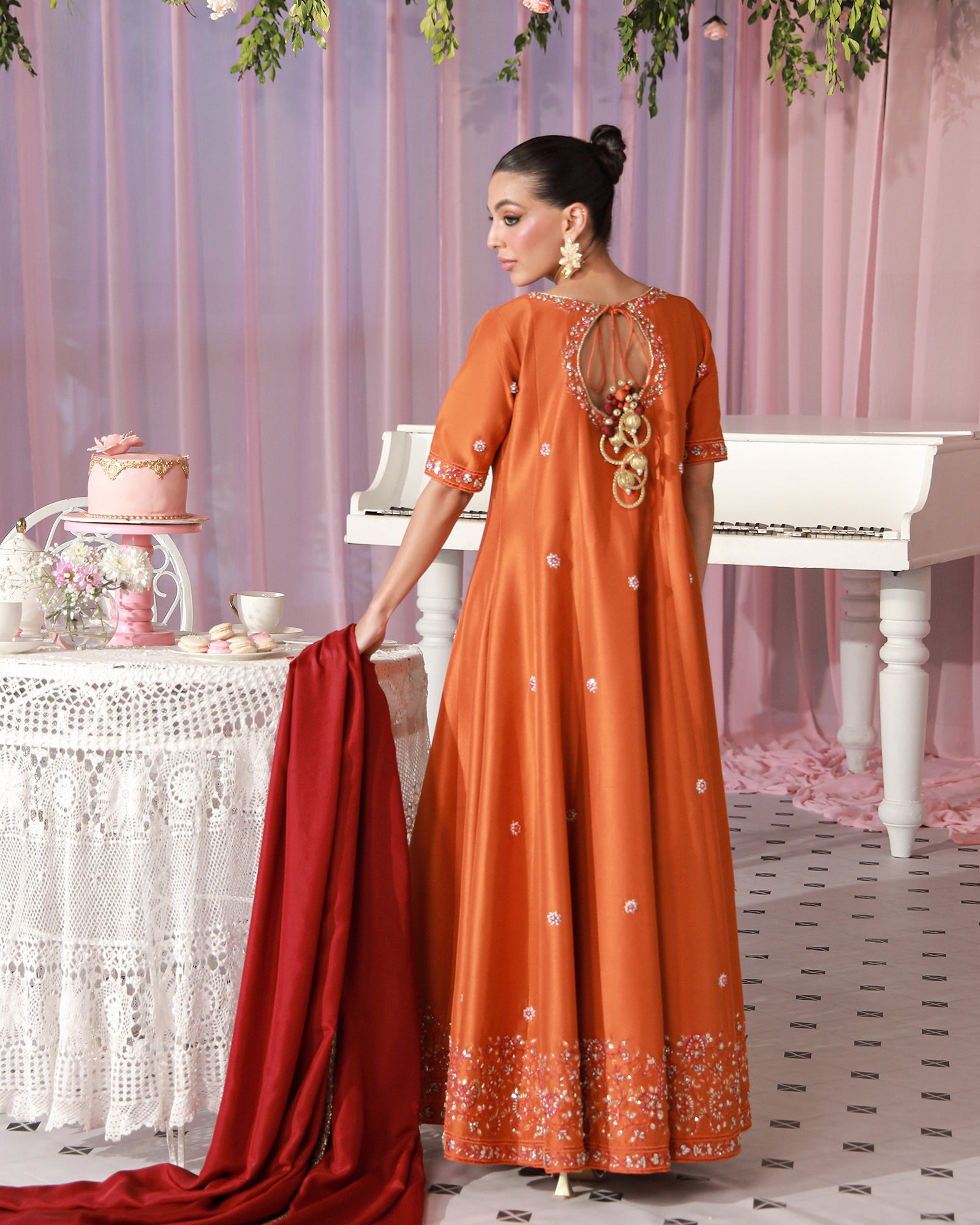 Crafted from pure raw silk in a deep orange hue, Zarel embodies festive grace and modern refinement. The intricate embroidery and subtle crimson detailing enhance its regal charm, creating a silhouette that glows with timeless elegance and contemporary allure.
