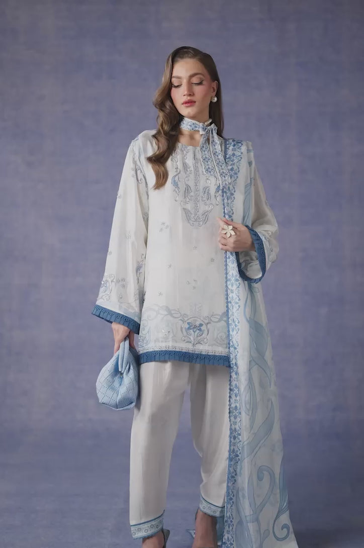 A delicate harmony of sky-blue florals and ornate borders, Zaria feels light, serene, and endlessly graceful. Designed in soft lawn with a flowing printed dupatta, it’s the perfect daytime eid look.