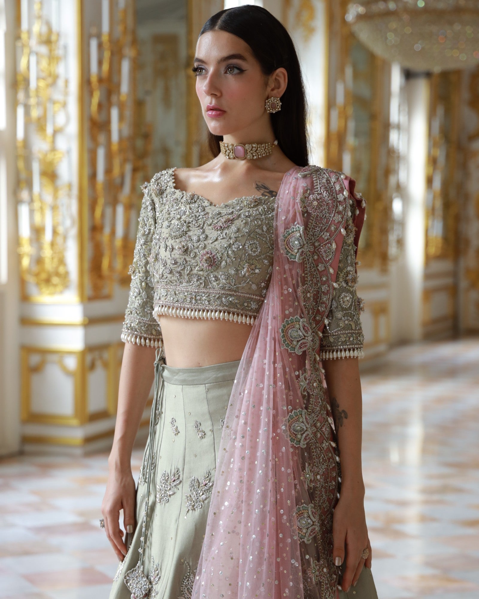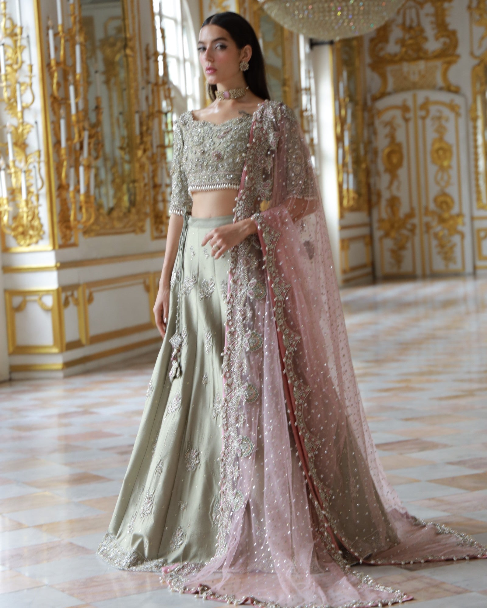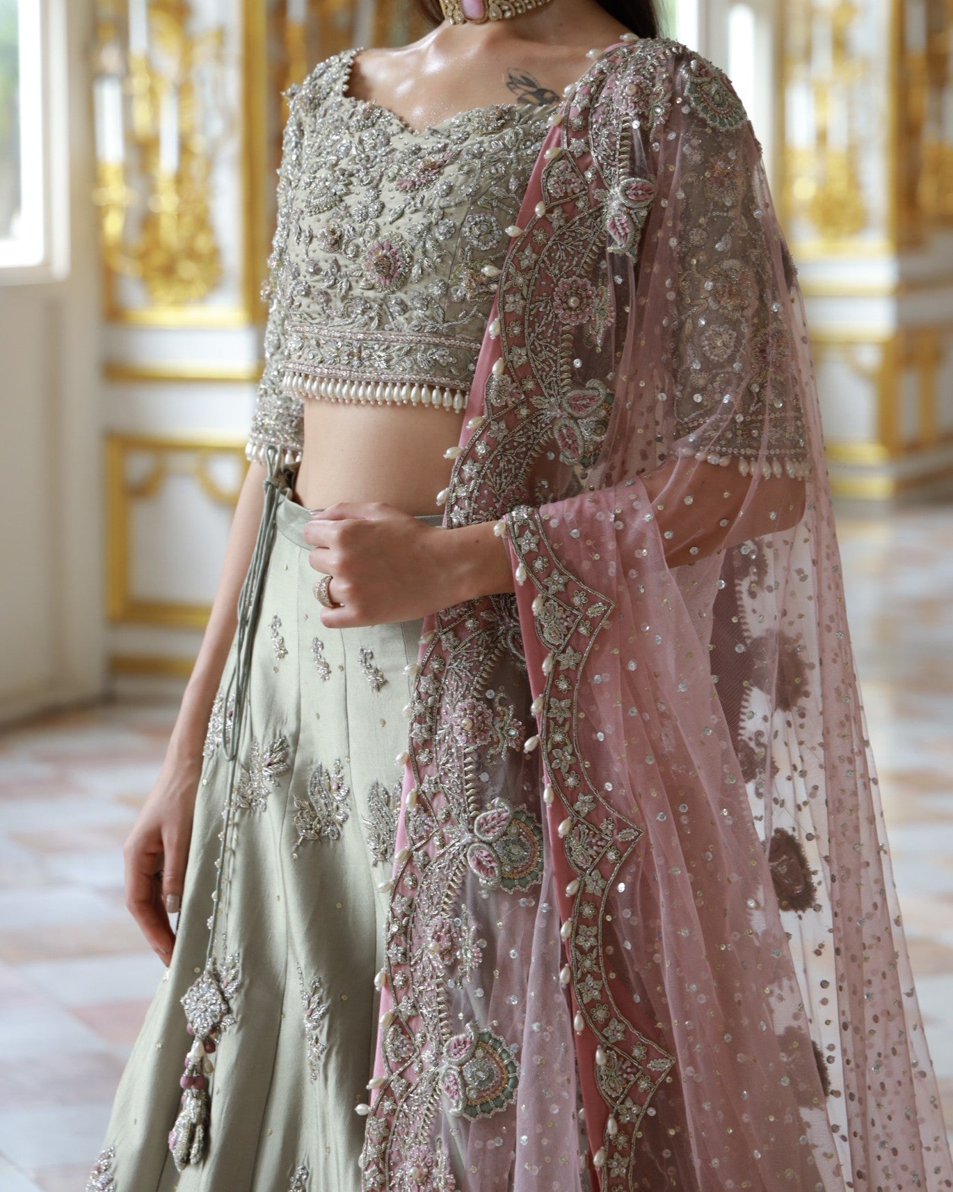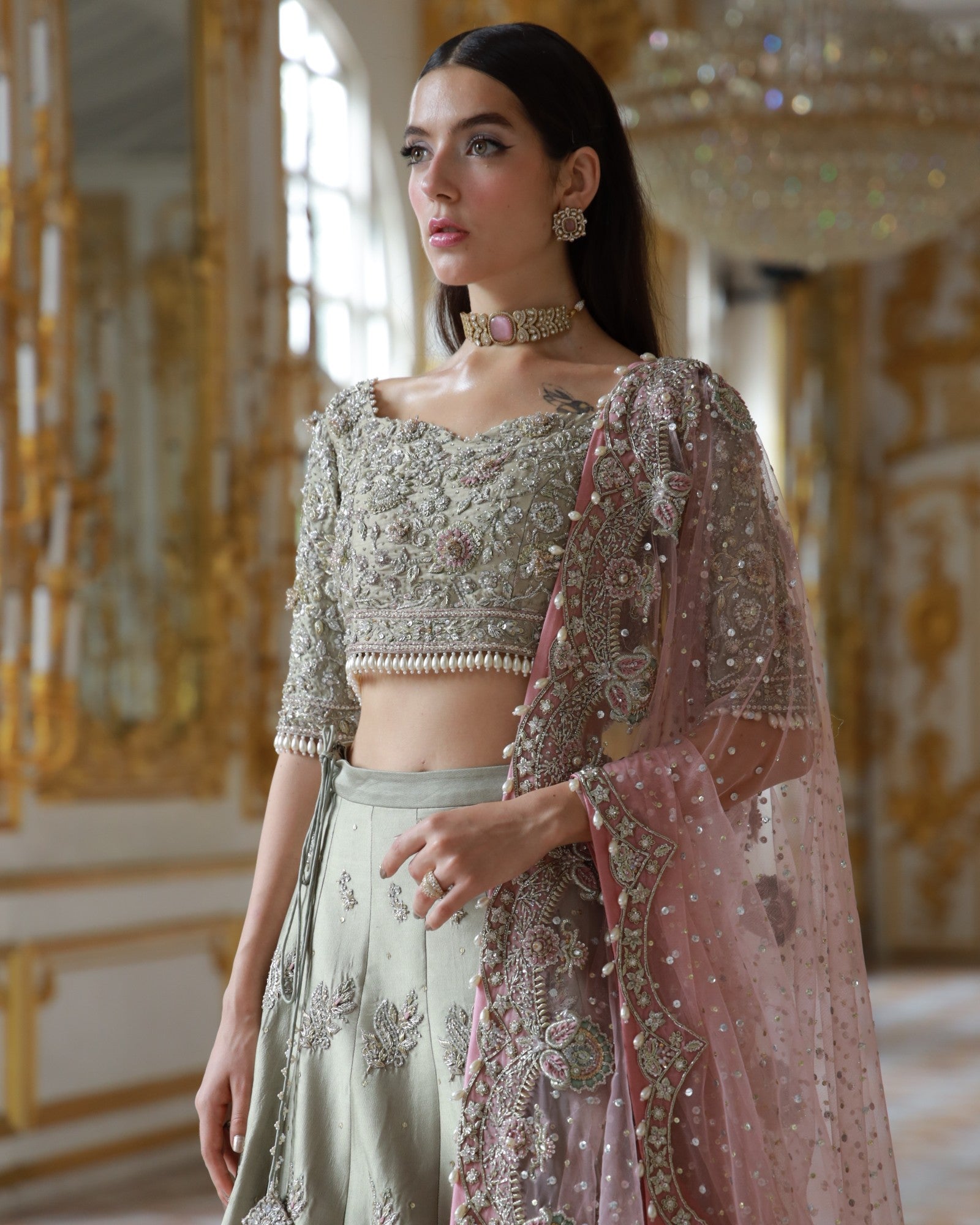 In soft sage green net and silk, this cropped blouse with a voluminous lehenga and sheer pink scalloped dupatta is delicately hand-embellished with silver and pastel hues. A poetic ensemble that blends tradition with charm, designed for day weddings and pre-bridal festivities.