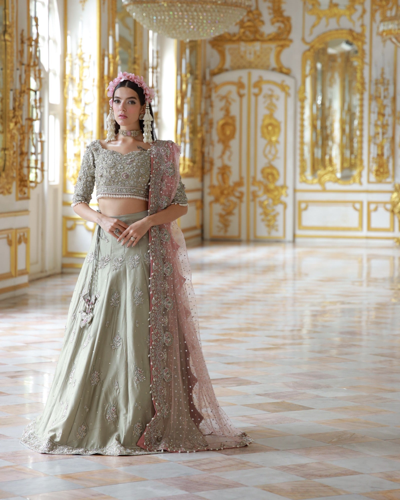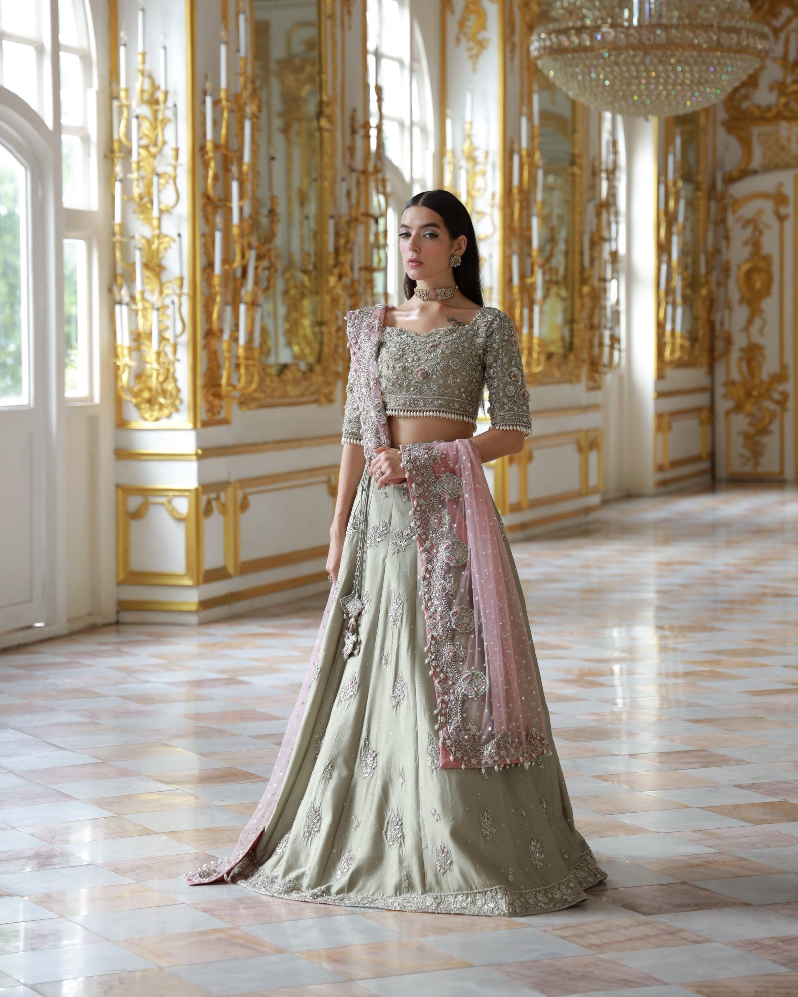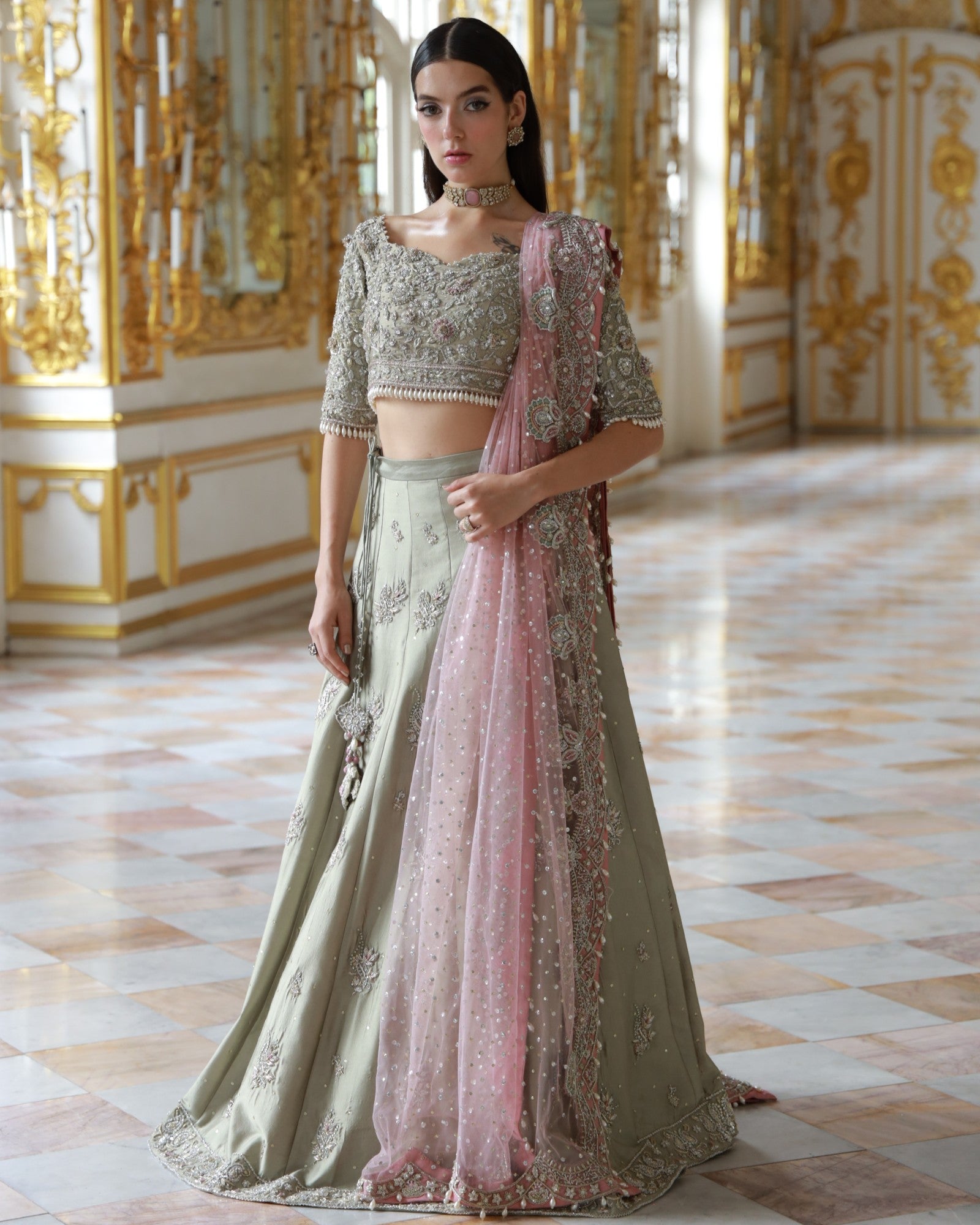 In soft sage green net and silk, this cropped blouse with a voluminous lehenga and sheer pink scalloped dupatta is delicately hand-embellished with silver and pastel hues. A poetic ensemble that blends tradition with charm, designed for day weddings and pre-bridal festivities.