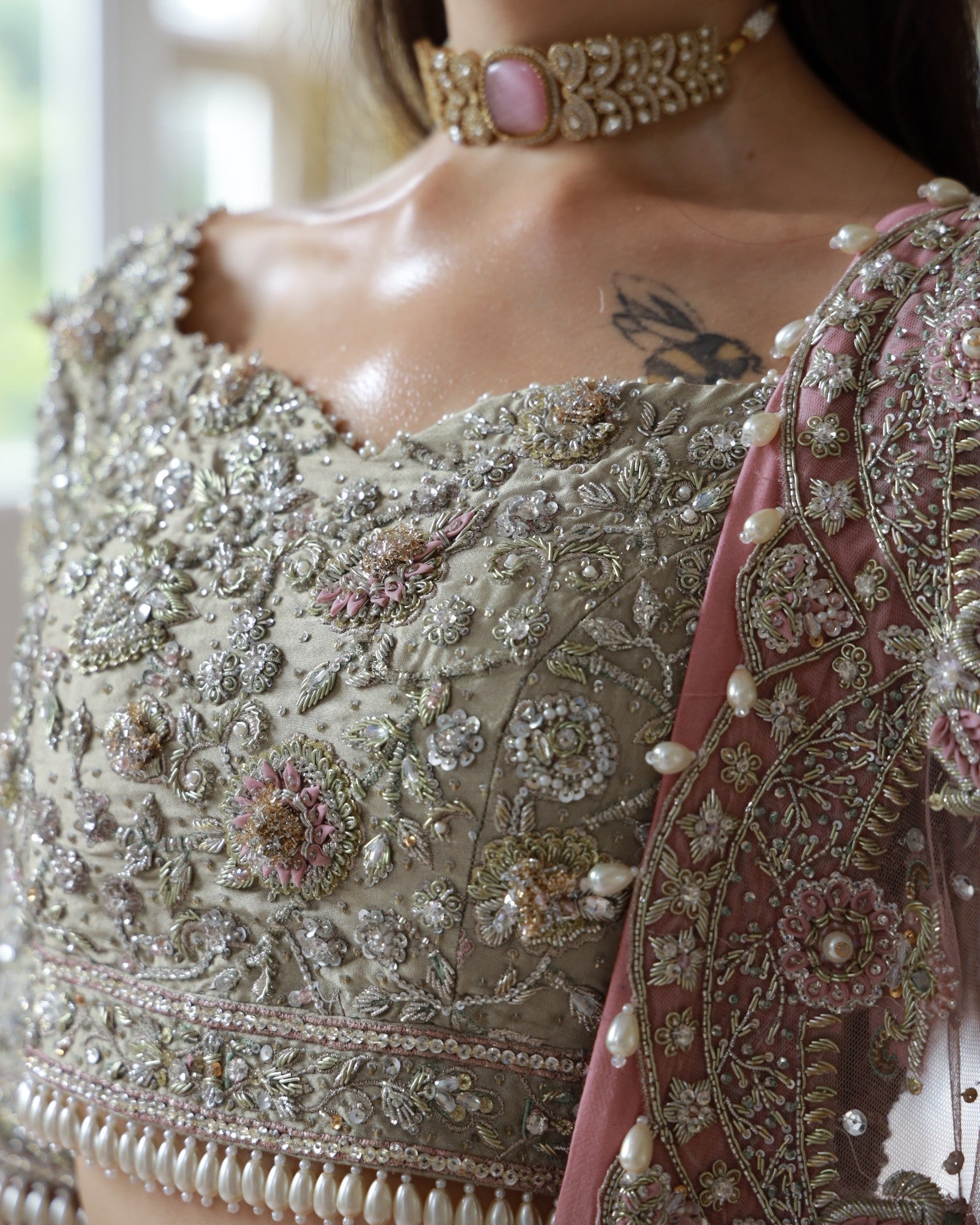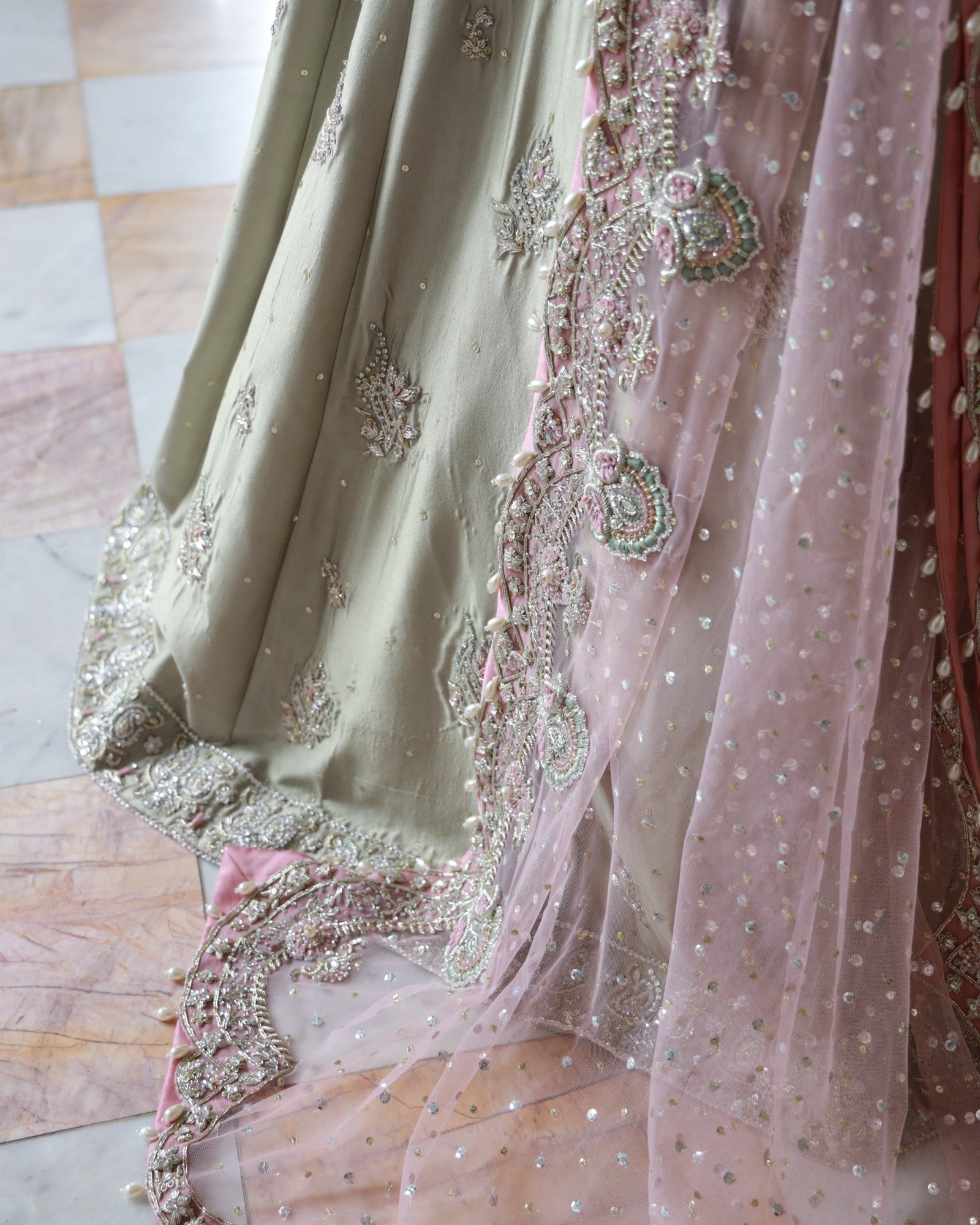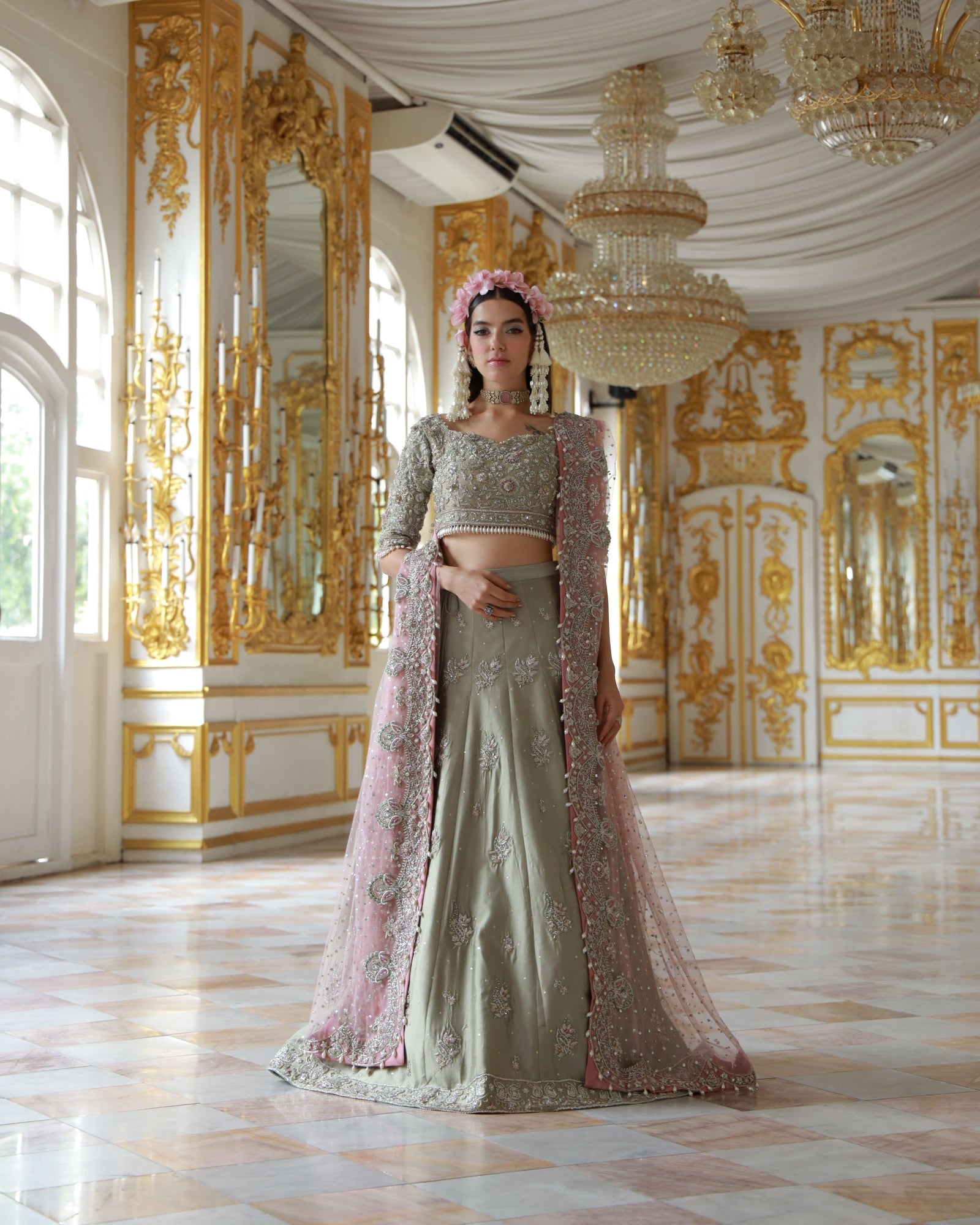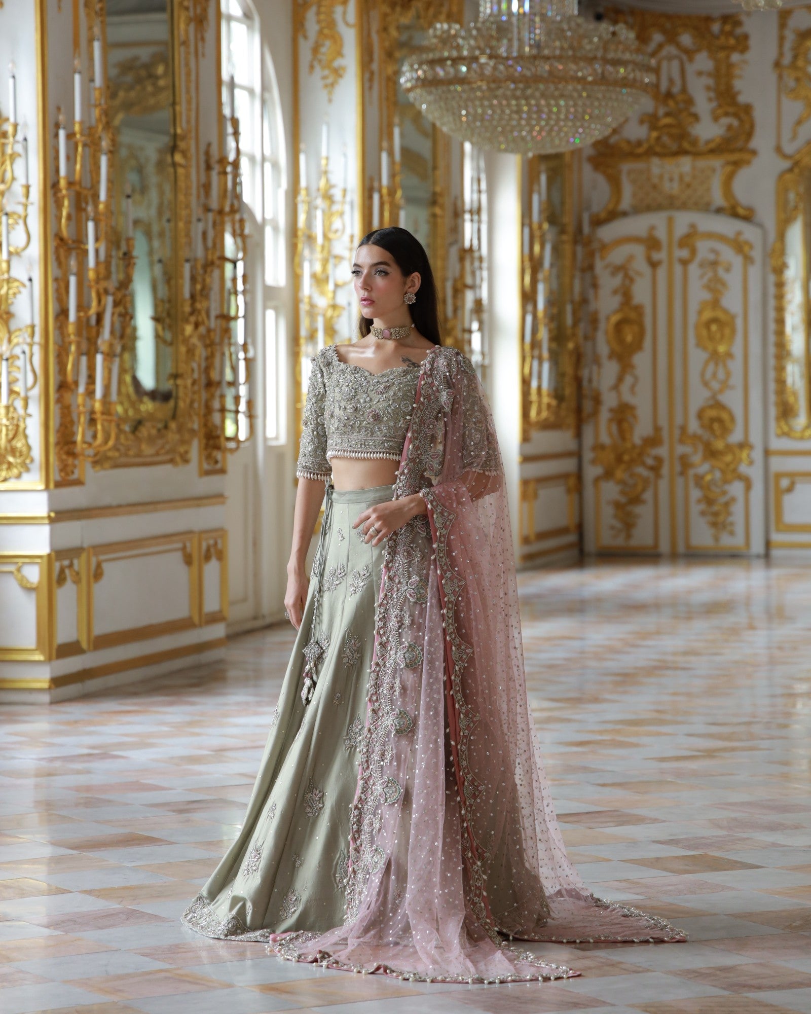 In soft sage green net and silk, this cropped blouse with a voluminous lehenga and sheer pink scalloped dupatta is delicately hand-embellished with silver and pastel hues. A poetic ensemble that blends tradition with charm, designed for day weddings and pre-bridal festivities.