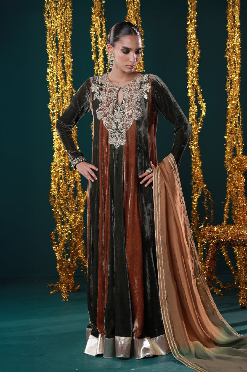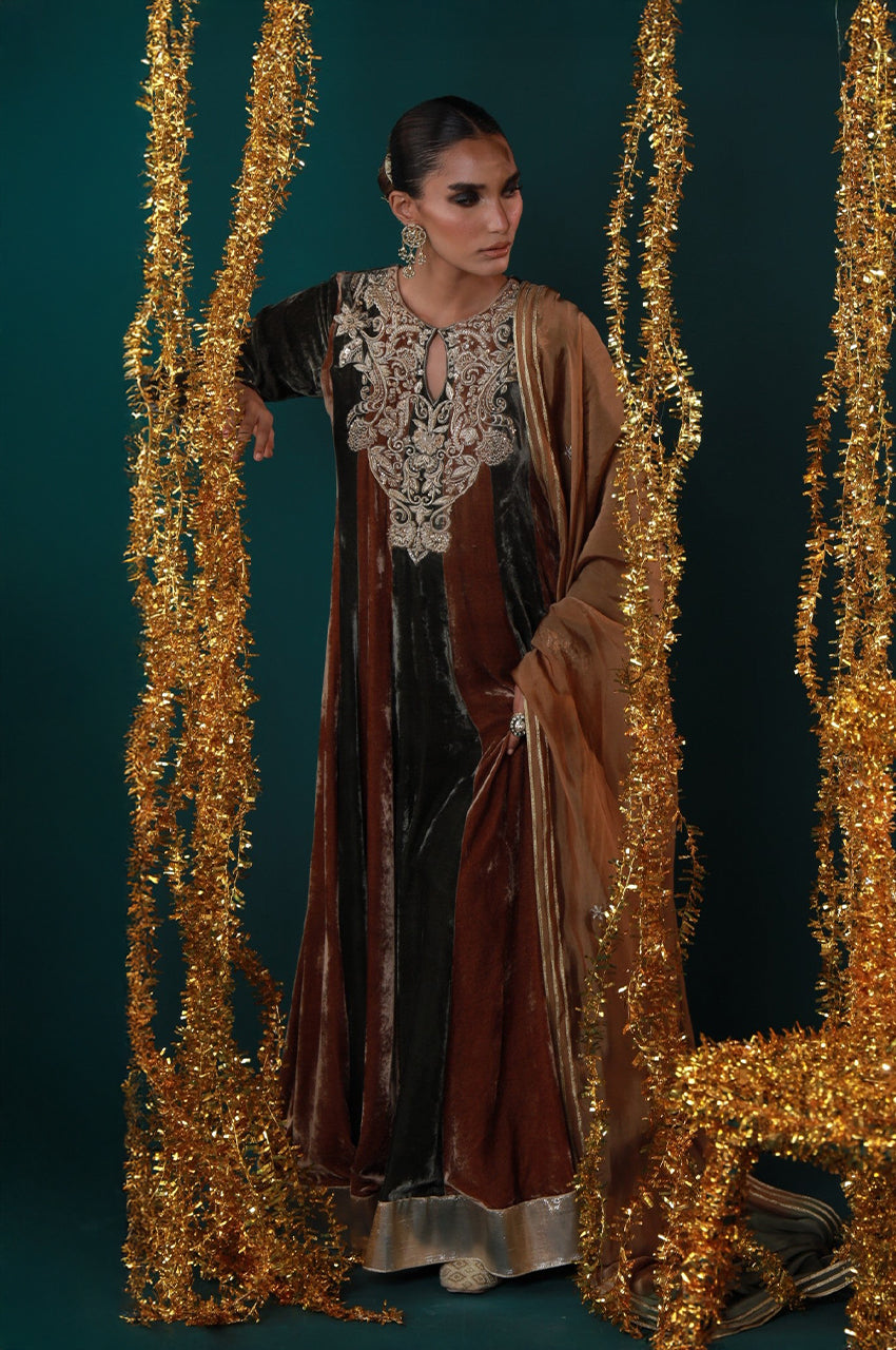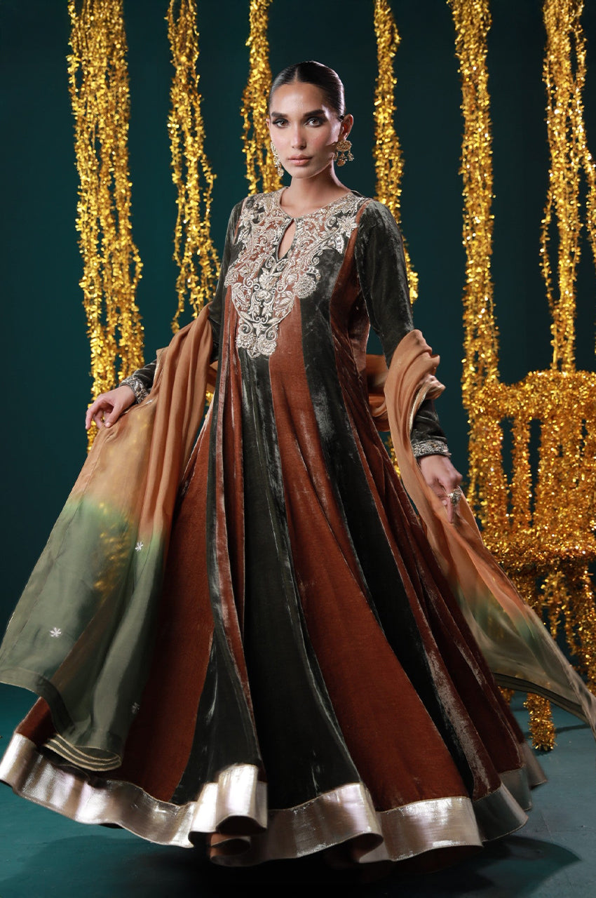 Embodying warmth, grace, and grandeur. Designed in rich rust and black velvet panels, this peshwas is adorned with intricate embroidery on the neckline and sleeves, paired with a deep ochre dupatta edged in silver. A regal harmony of heritage tones and timeless elegance, perfect for festive evenings and winter wedding soirées