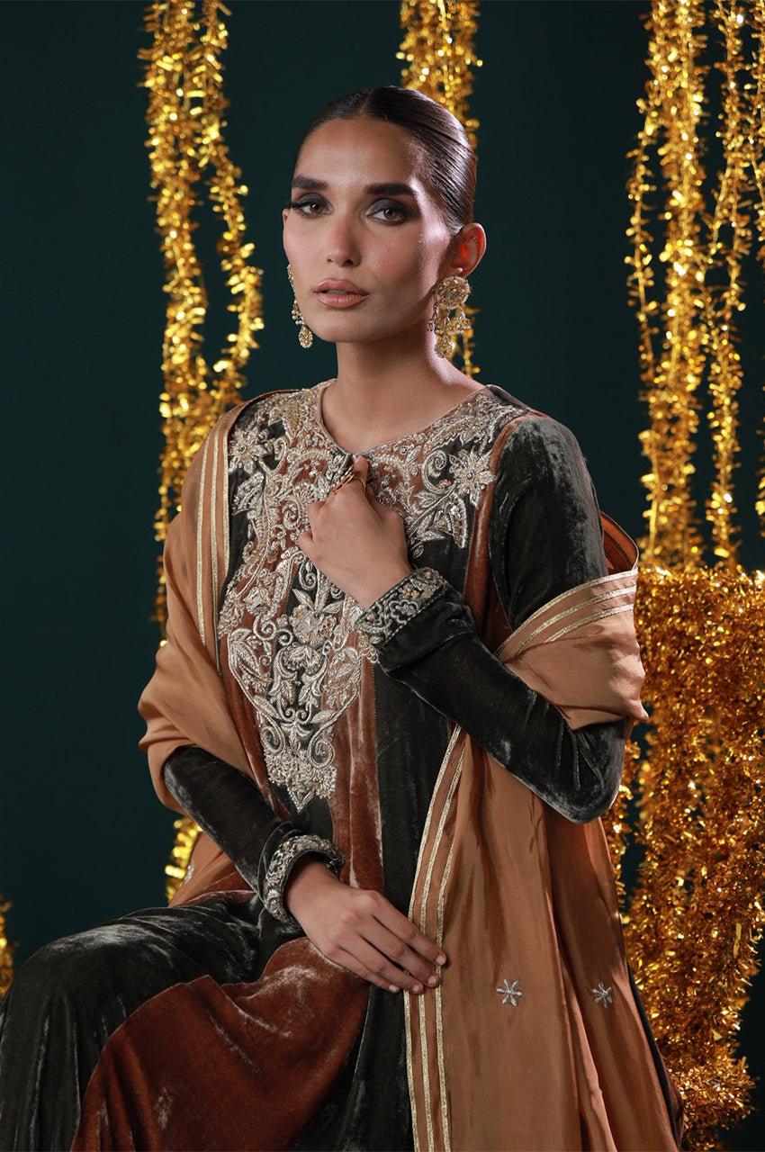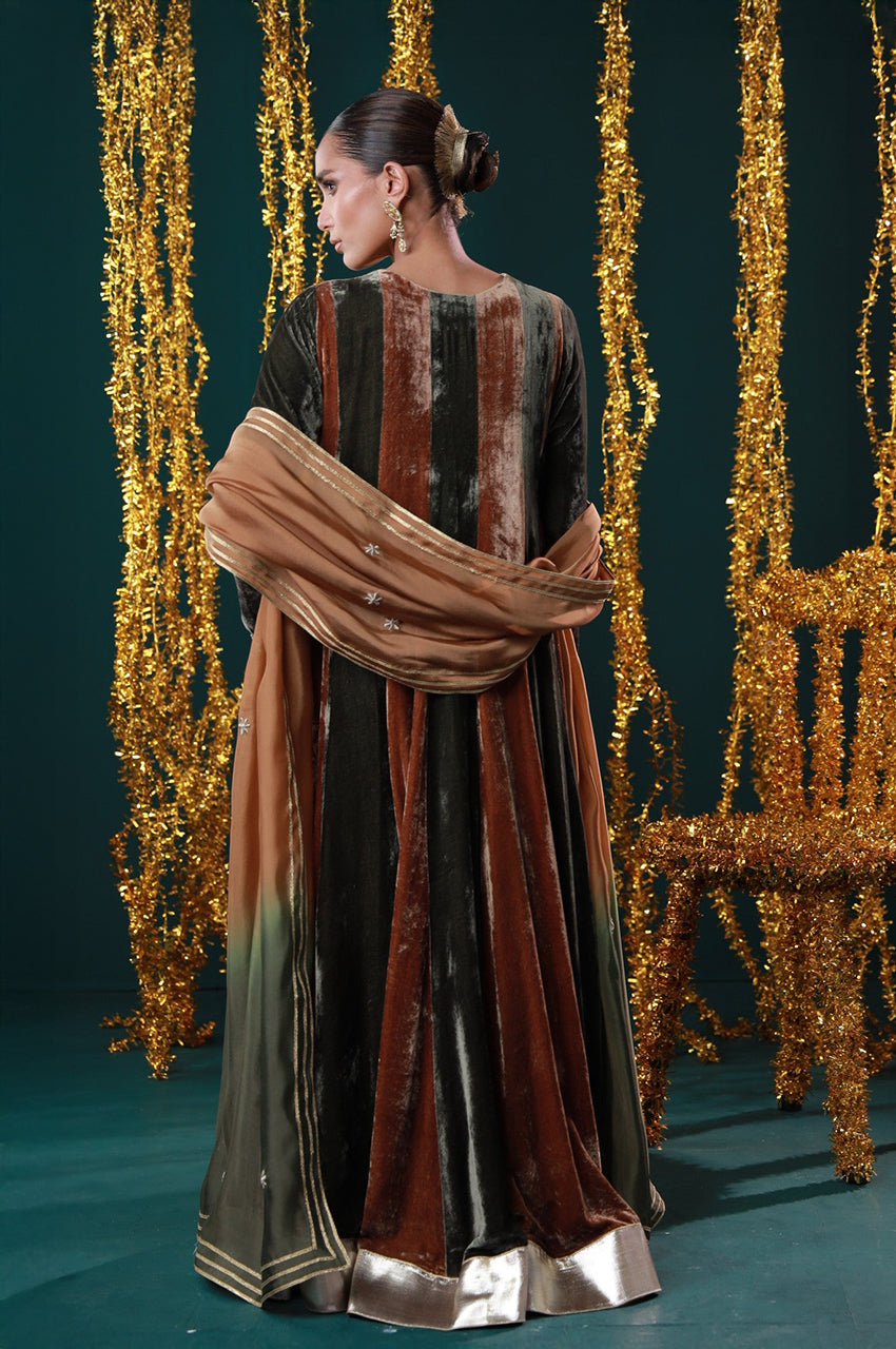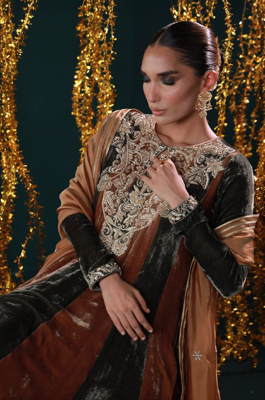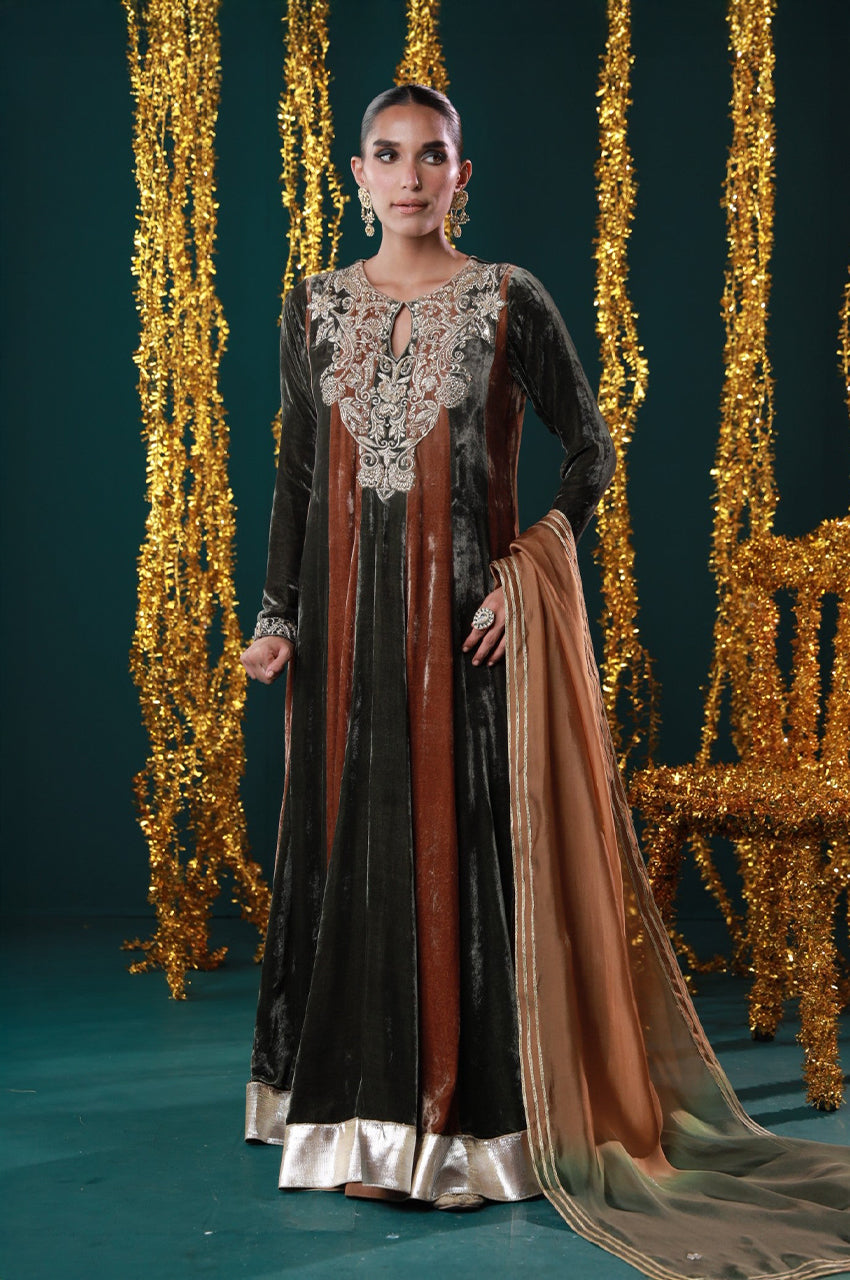 Embodying warmth, grace, and grandeur. Designed in rich rust and black velvet panels, this peshwas is adorned with intricate embroidery on the neckline and sleeves, paired with a deep ochre dupatta edged in silver. A regal harmony of heritage tones and timeless elegance, perfect for festive evenings and winter wedding soirées