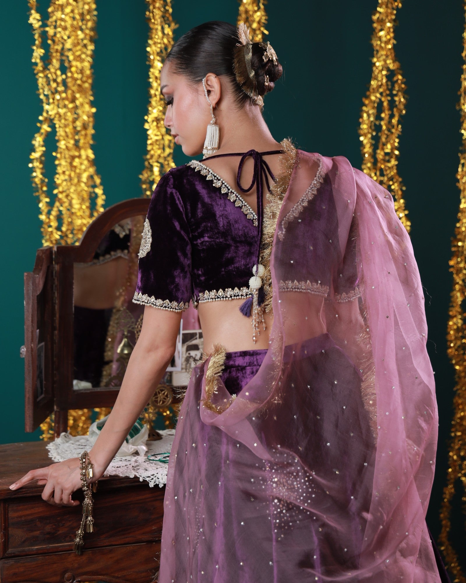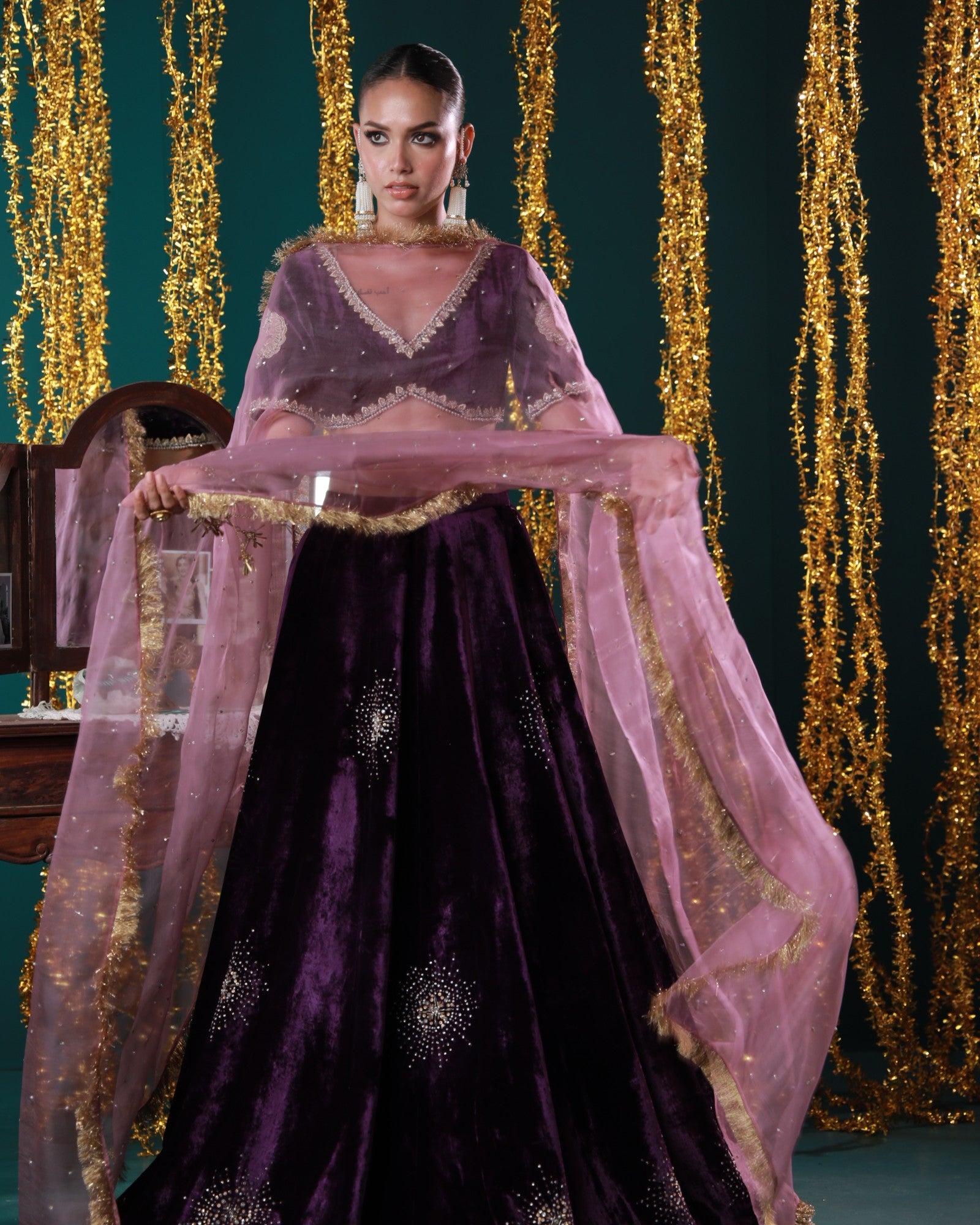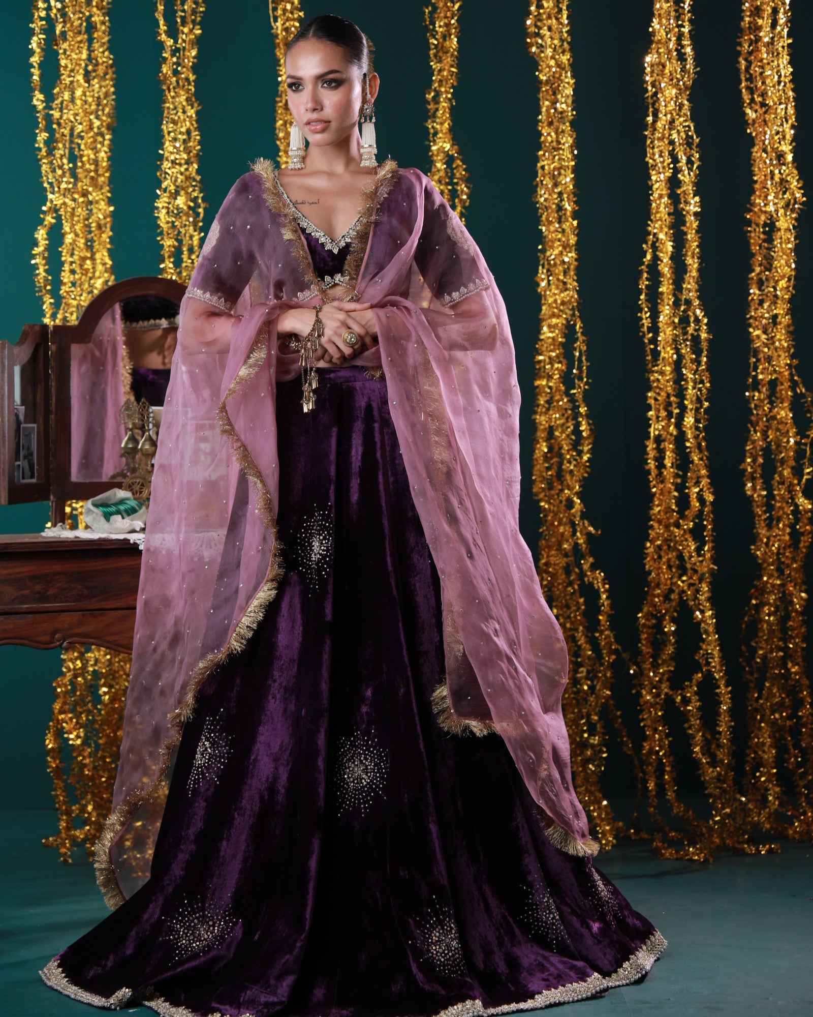 Sitara is a celestial velvet lehenga in a rich purple hue, adorned with radiant pearl bursts that mirror the night sky. The choli features a scalloped neckline trimmed with antique accents, while the pink net dupatta adds softness and balance. A striking silhouette for festive evenings and sangeet nights, where tradition meets bold femininity.