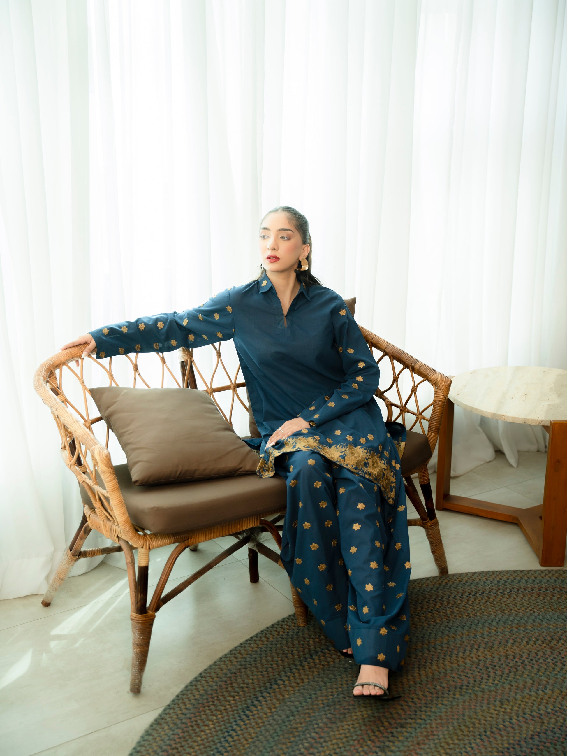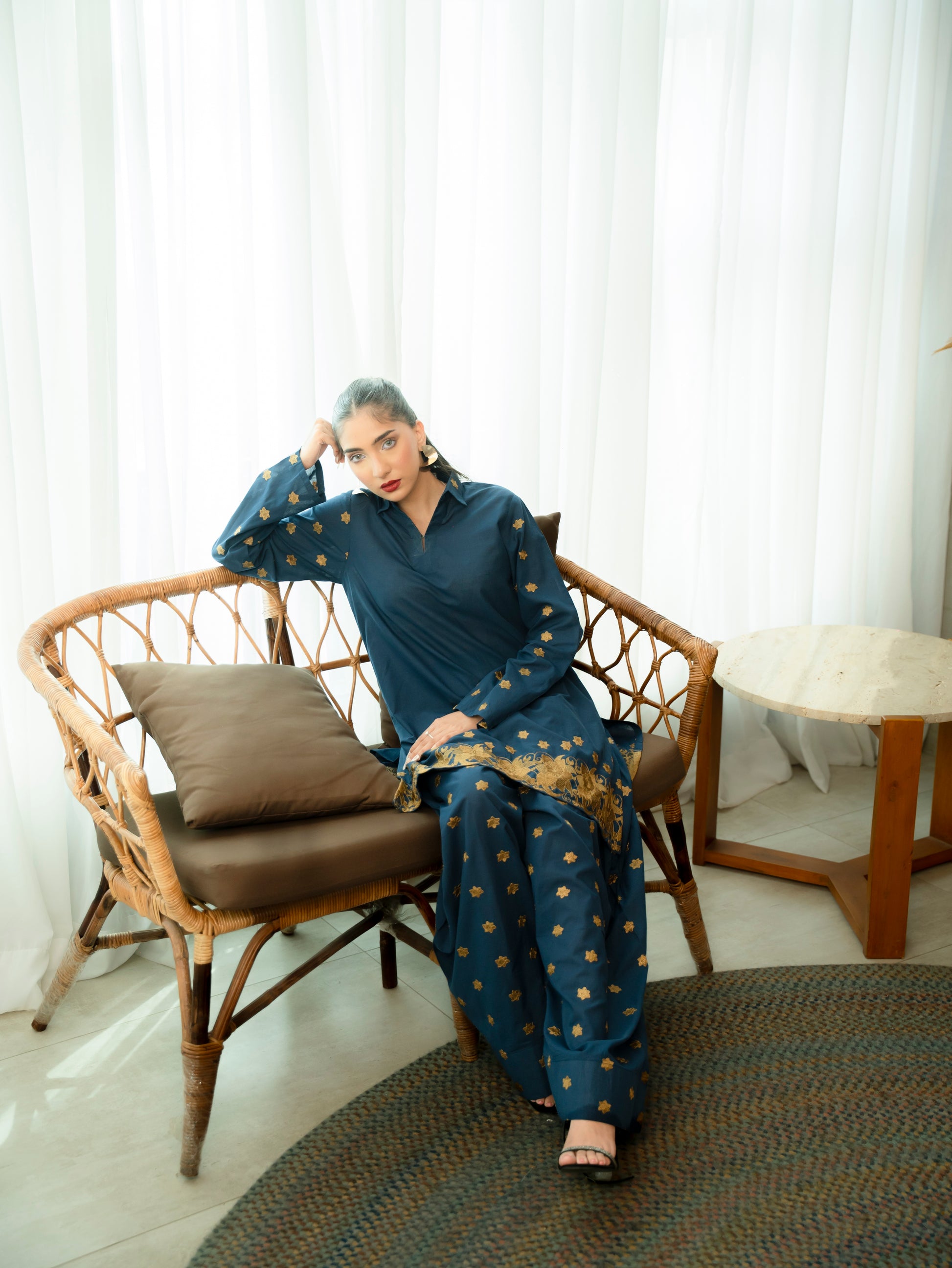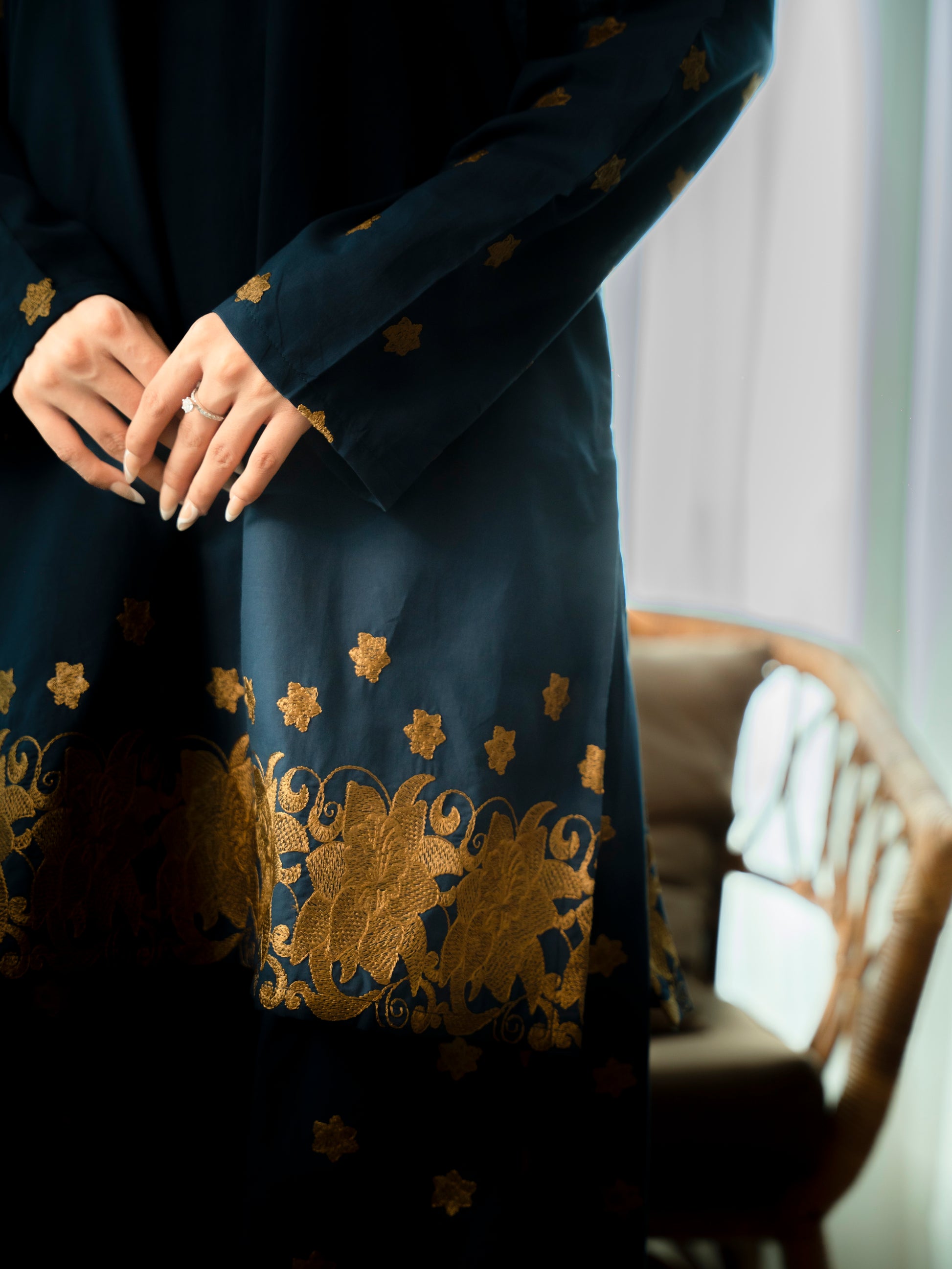 Zureen is midnight poetry—a deep navy ensemble dotted with golden blossoms and a whisper of embroidery that speaks of tradition and grace. designed for nights filled with light and luxury