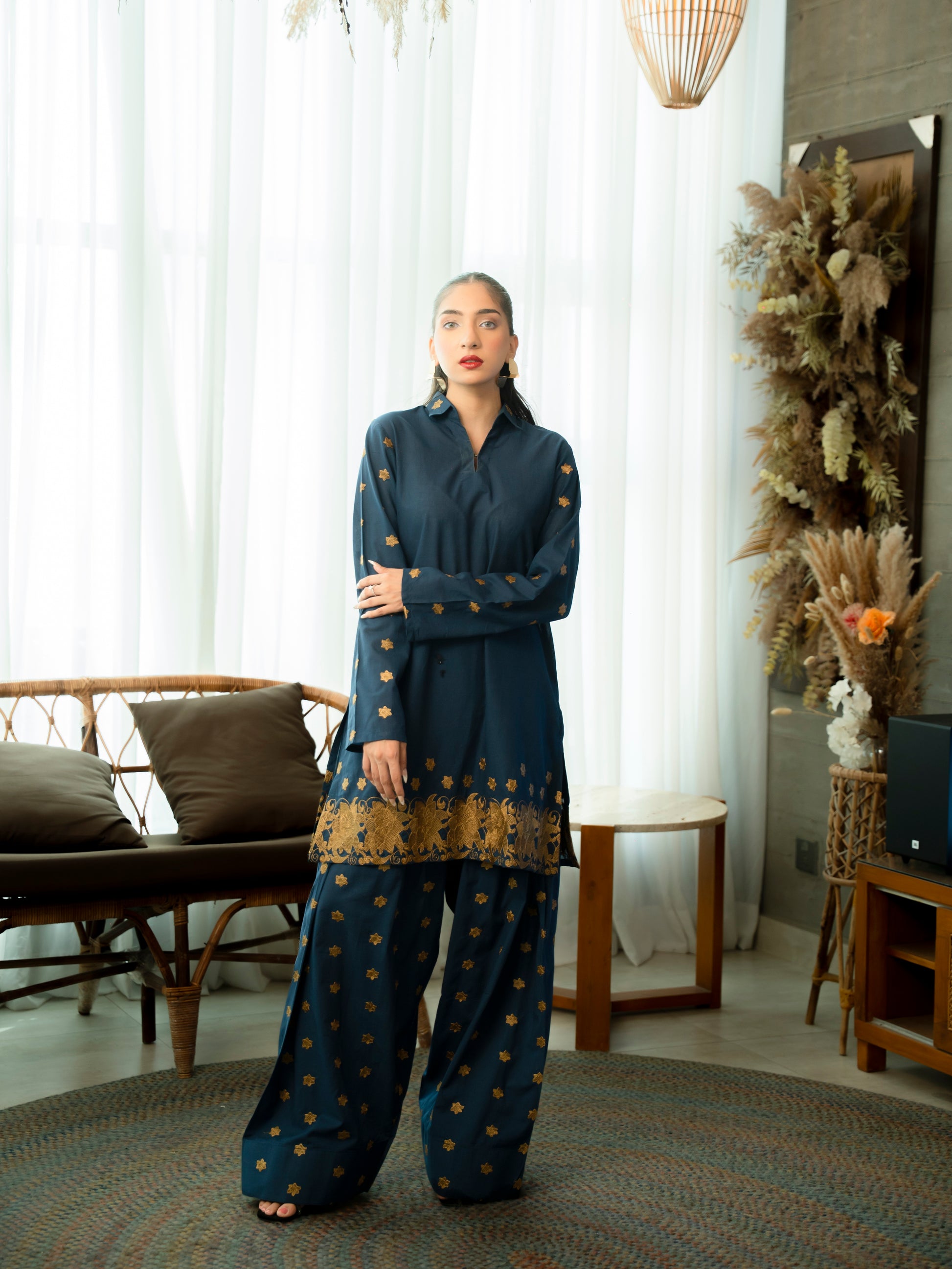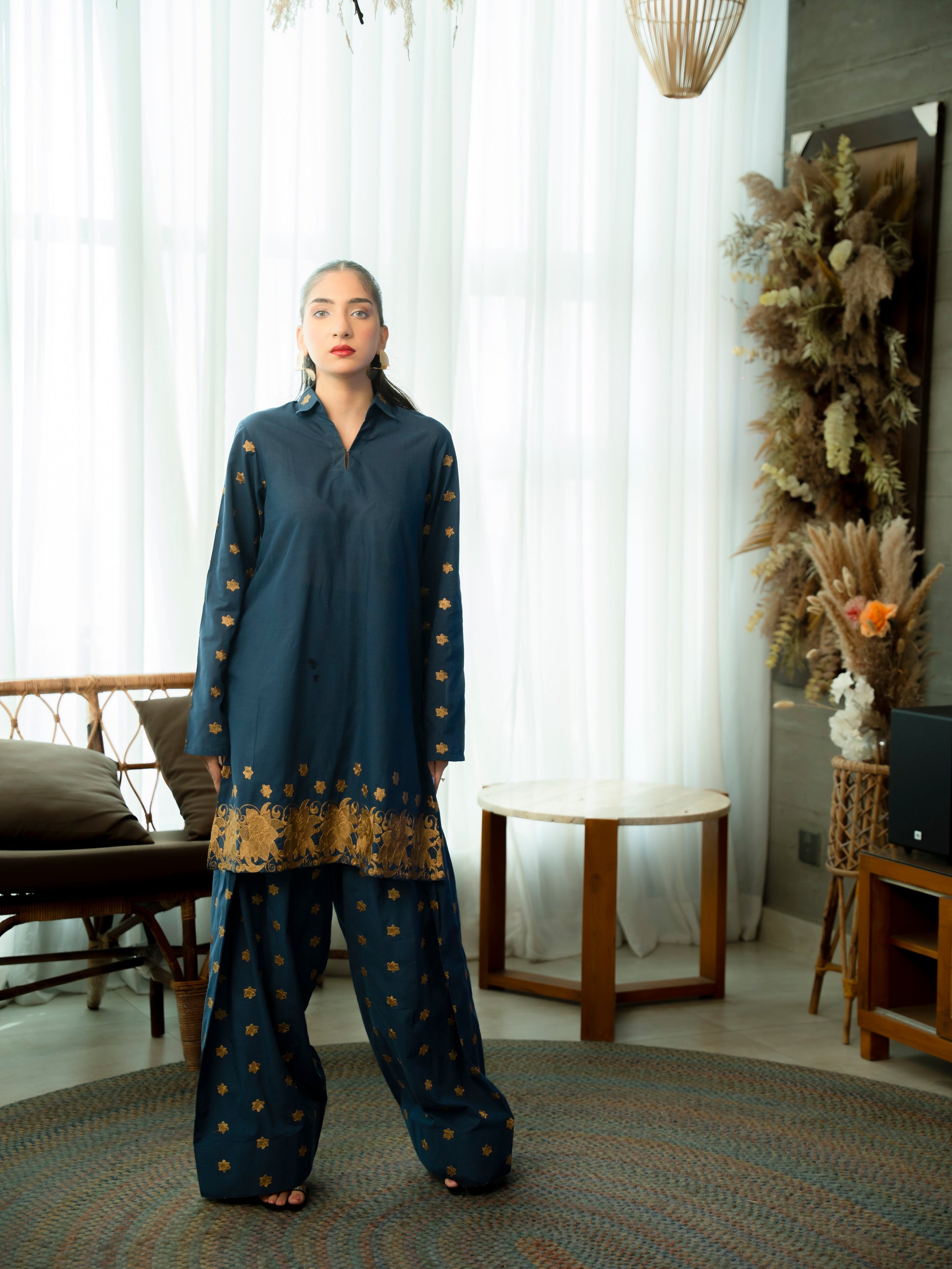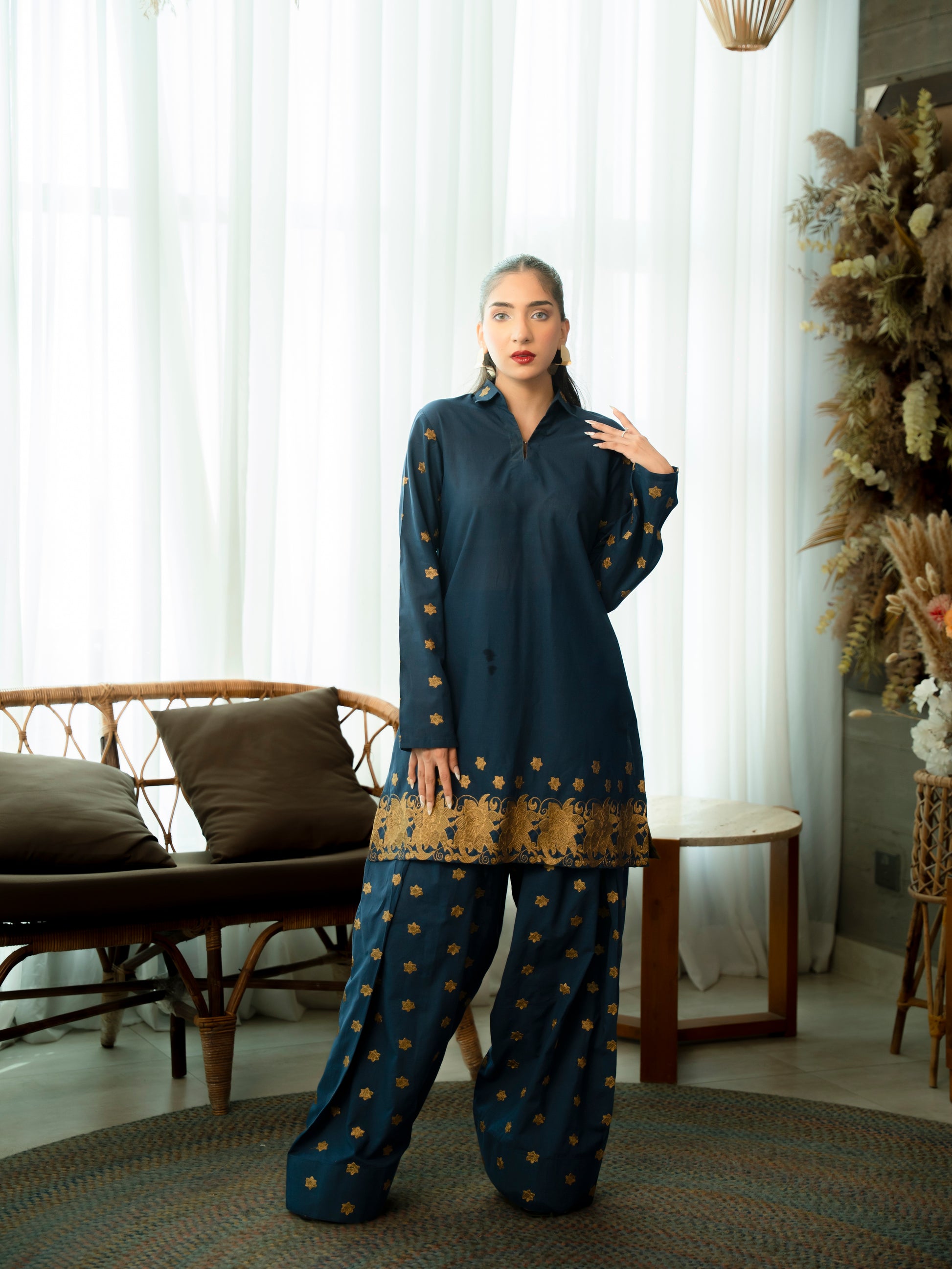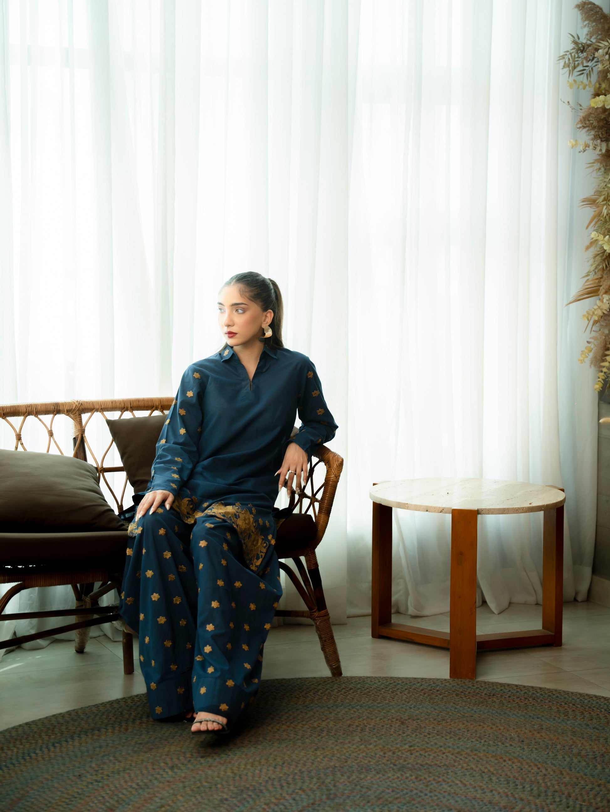 Zureen is midnight poetry—a deep navy ensemble dotted with golden blossoms and a whisper of embroidery that speaks of tradition and grace. designed for nights filled with light and luxury