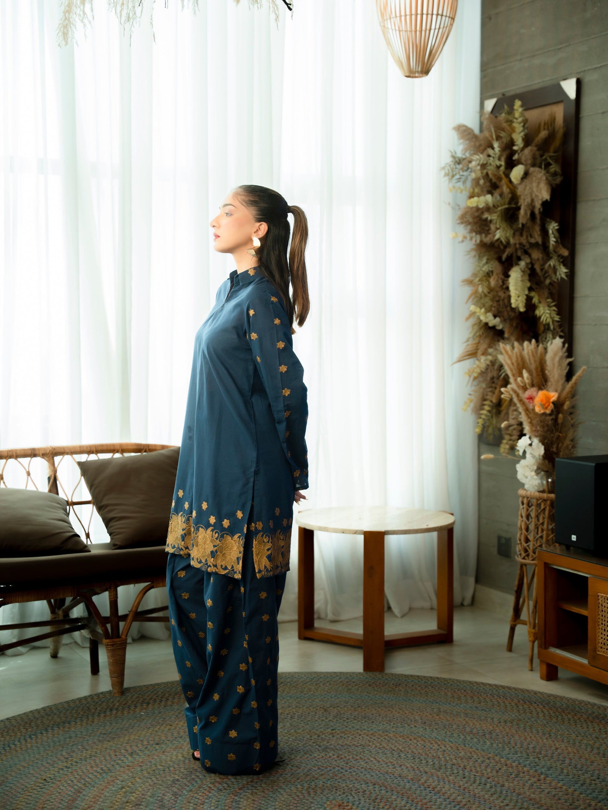 Zureen is midnight poetry—a deep navy ensemble dotted with golden blossoms and a whisper of embroidery that speaks of tradition and grace. designed for nights filled with light and luxury